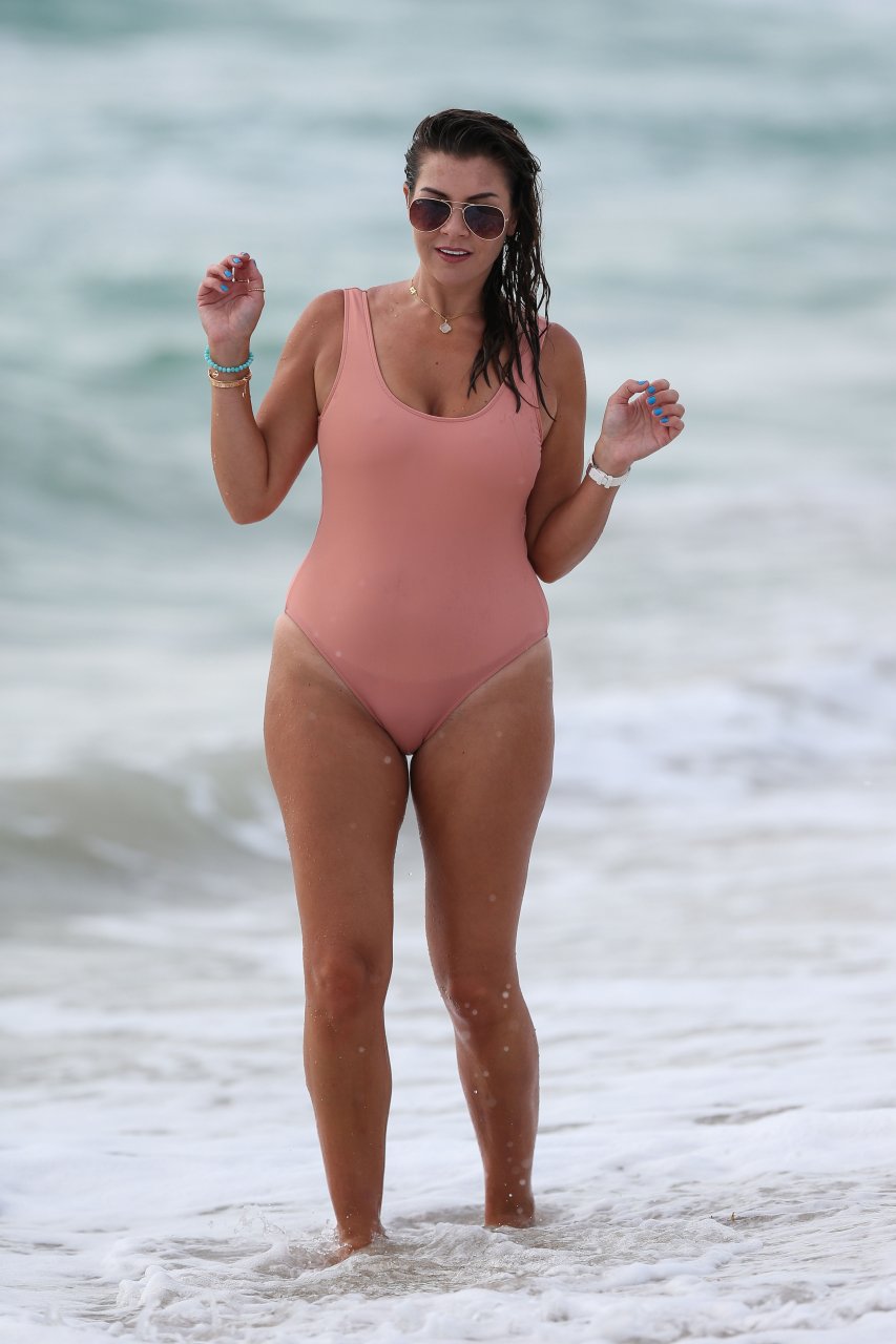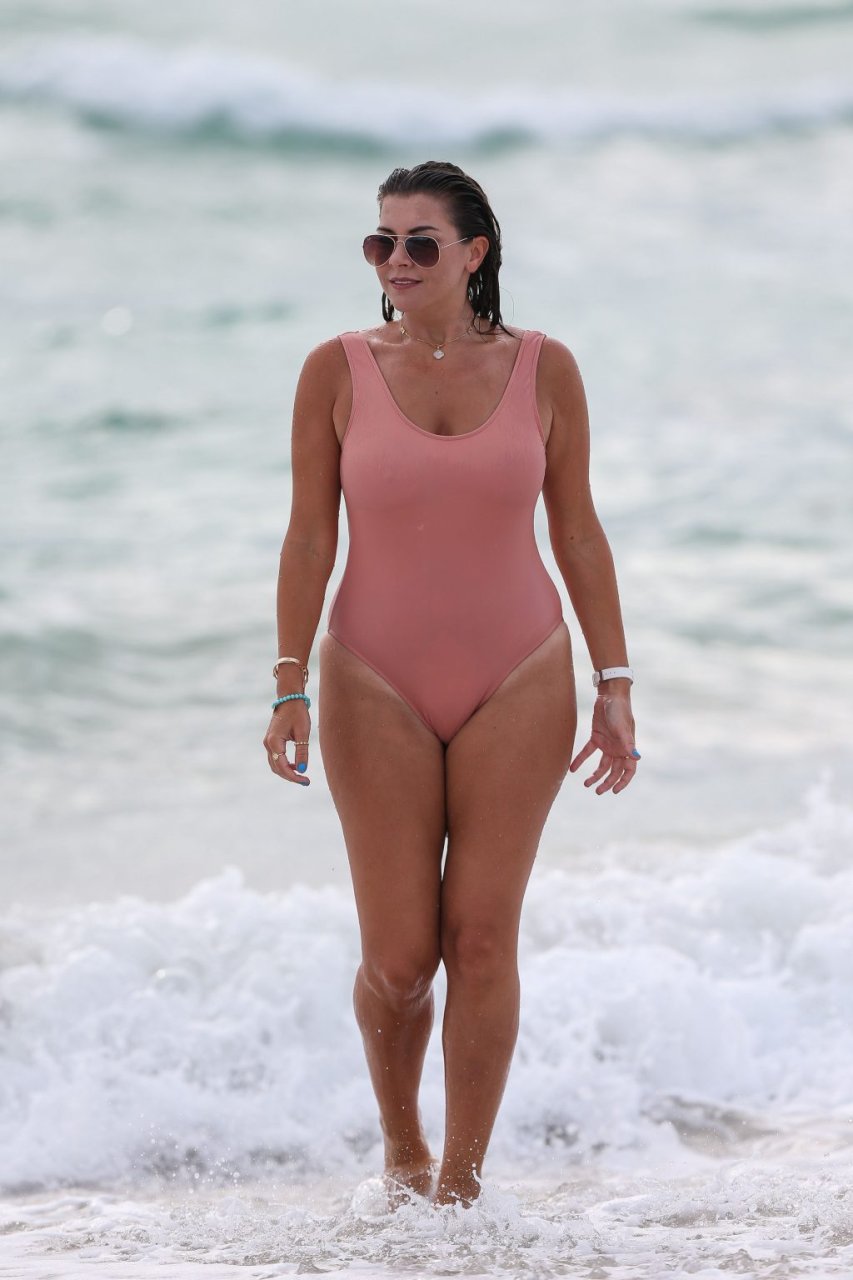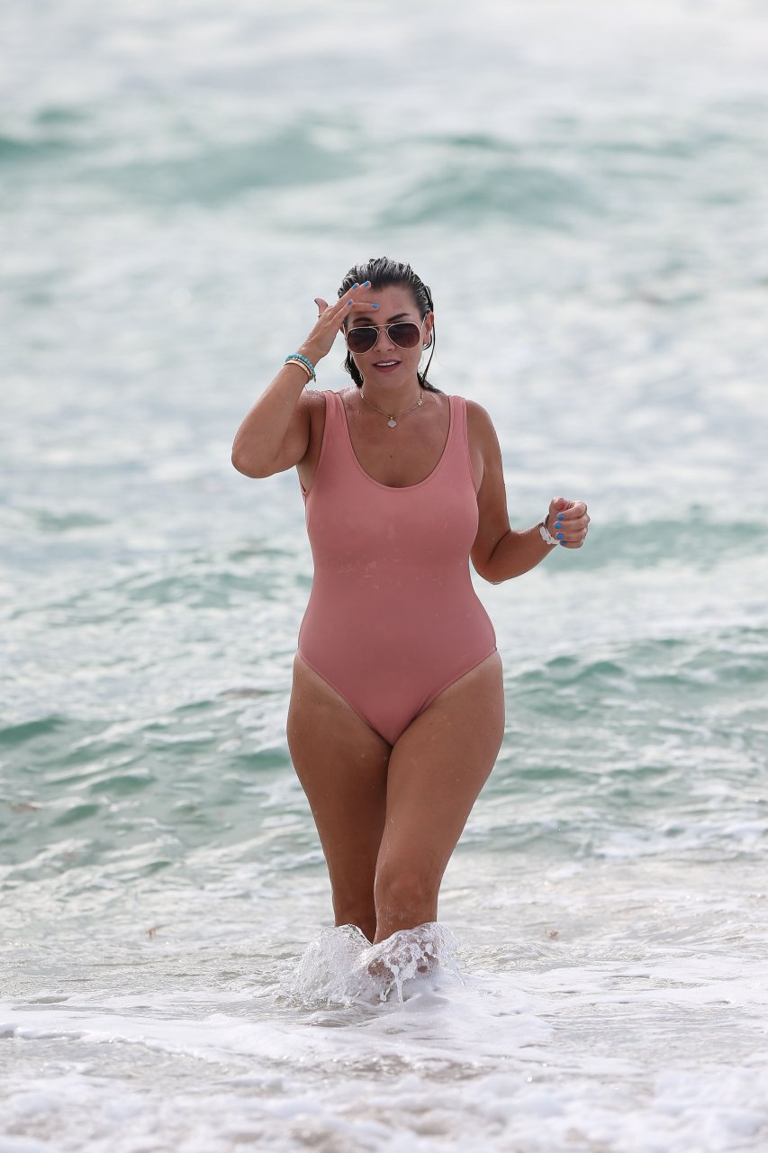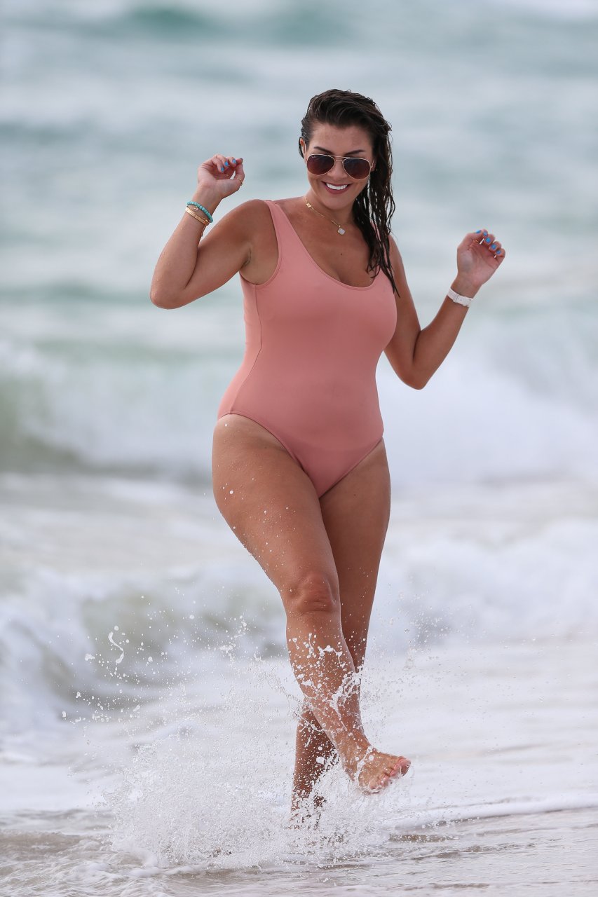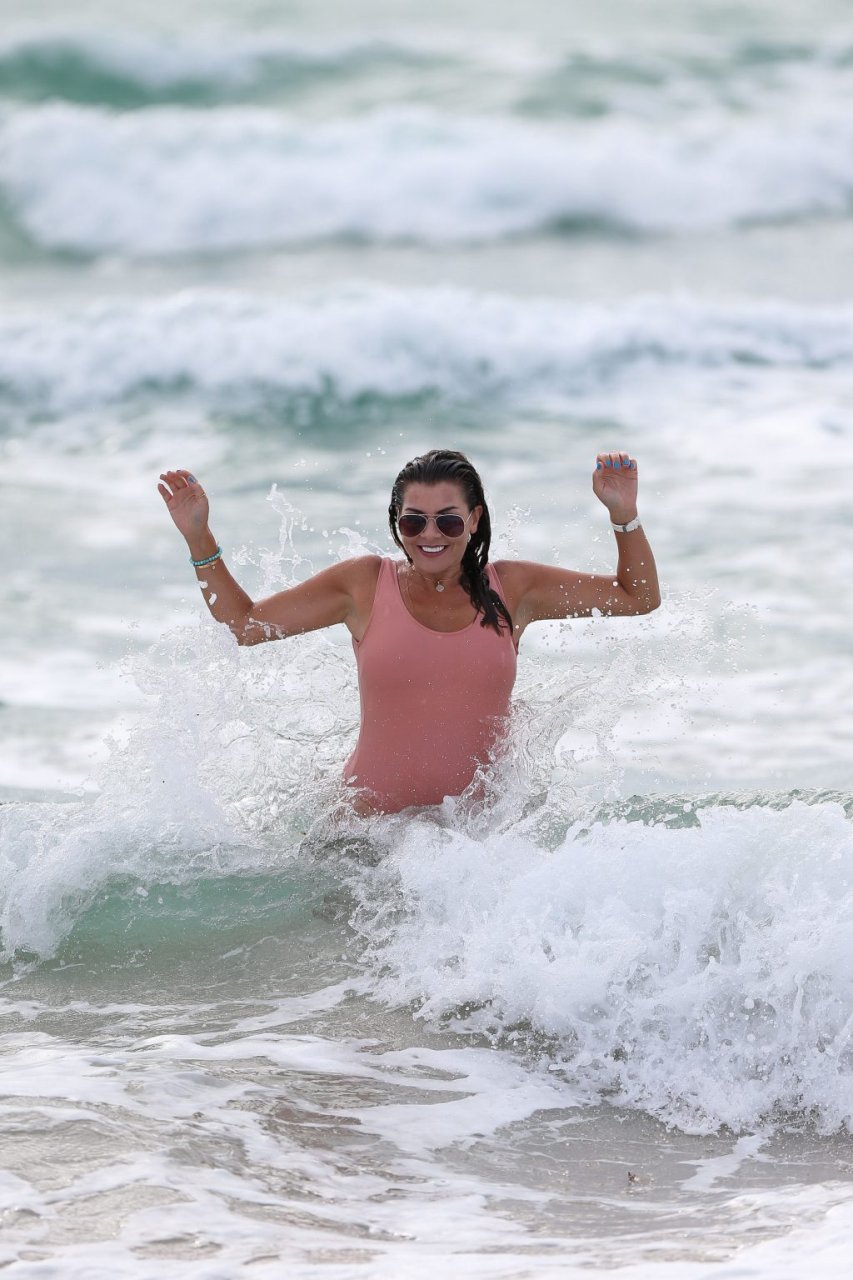 Atriz/modelo/estrela de TV Imogen Thomas exibe seu corpo incrível em um maiô de verão cor pêssego enquanto aproveita um mergulho no Oceano – Miami, Flórida, 10/02/2018.