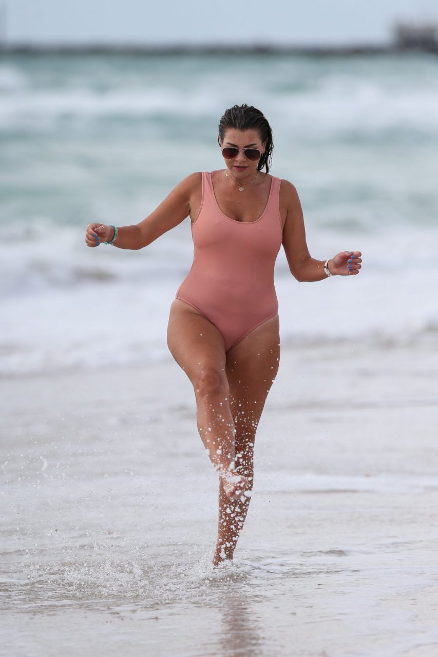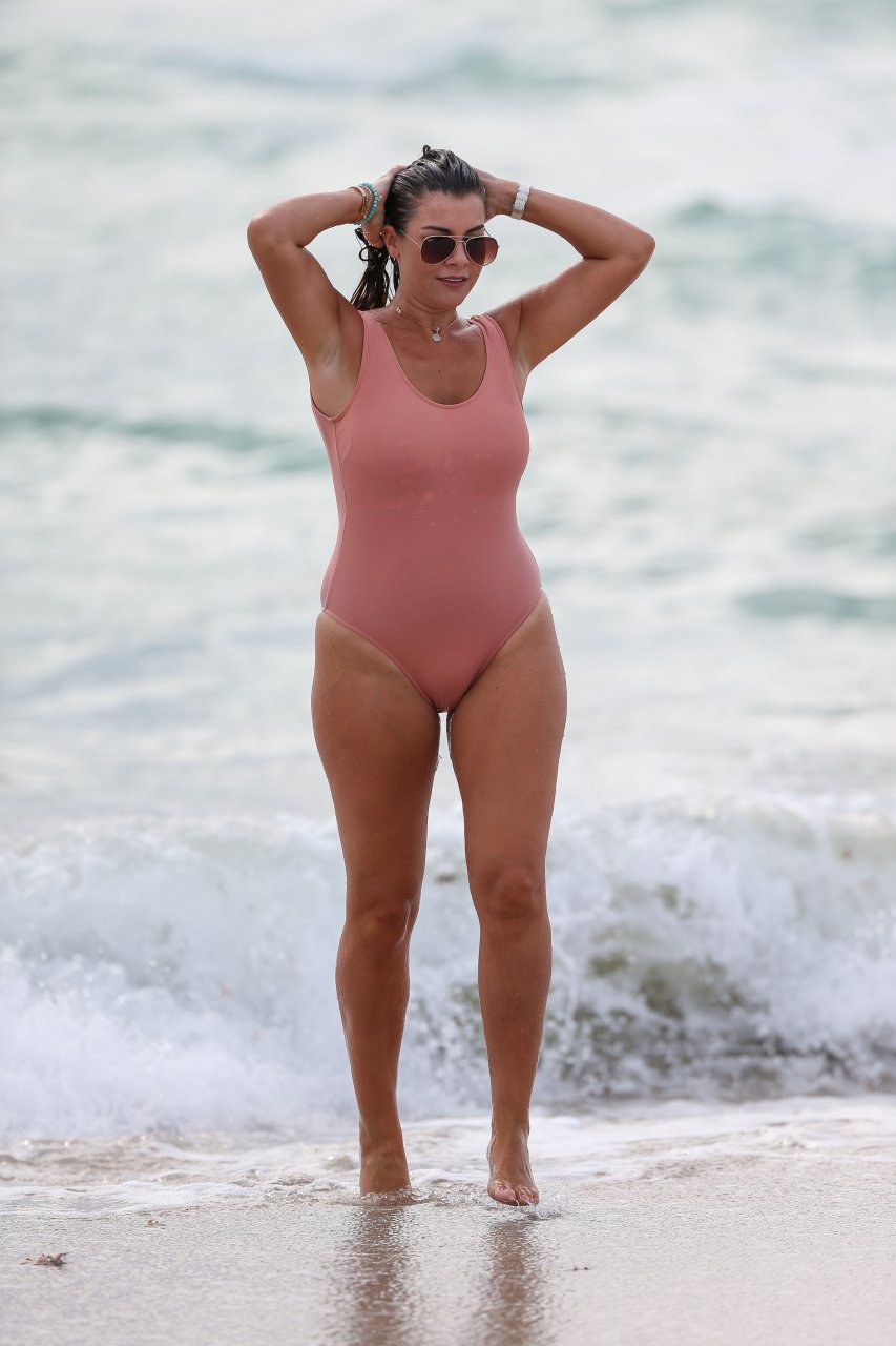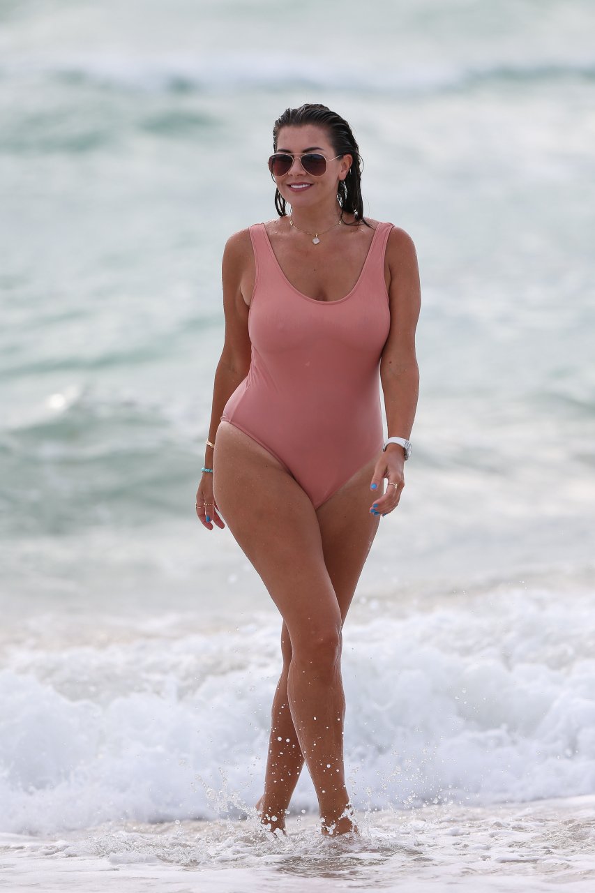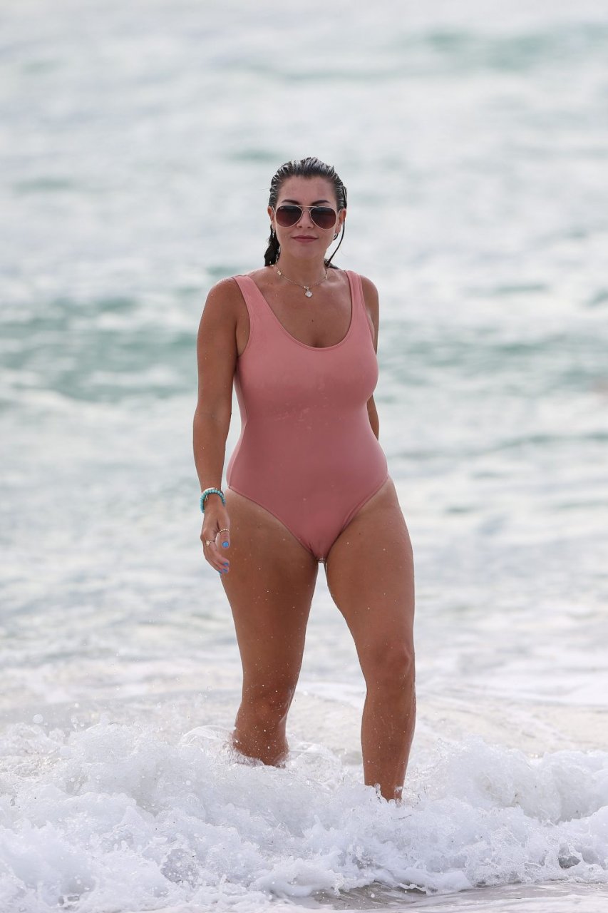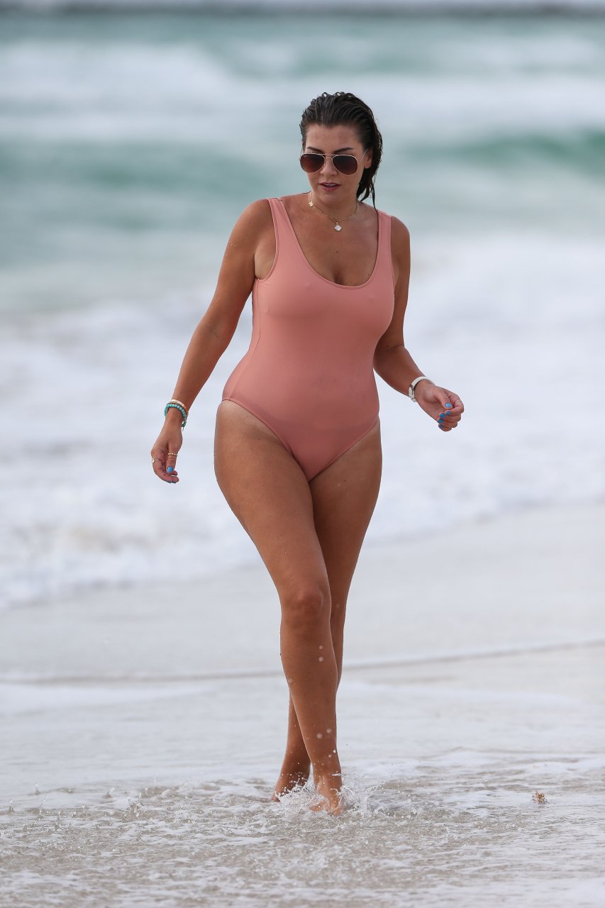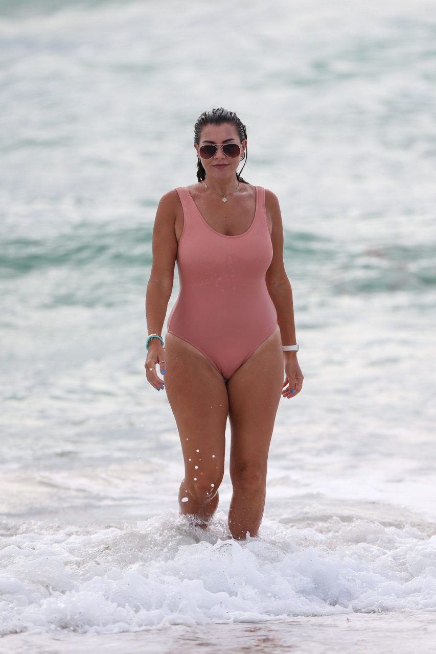 Atriz/modelo/estrela de TV Imogen Thomas exibe seu corpo incrível em um maiô de verão cor pêssego enquanto aproveita um mergulho no Oceano – Miami, Flórida, 10/02/2018.