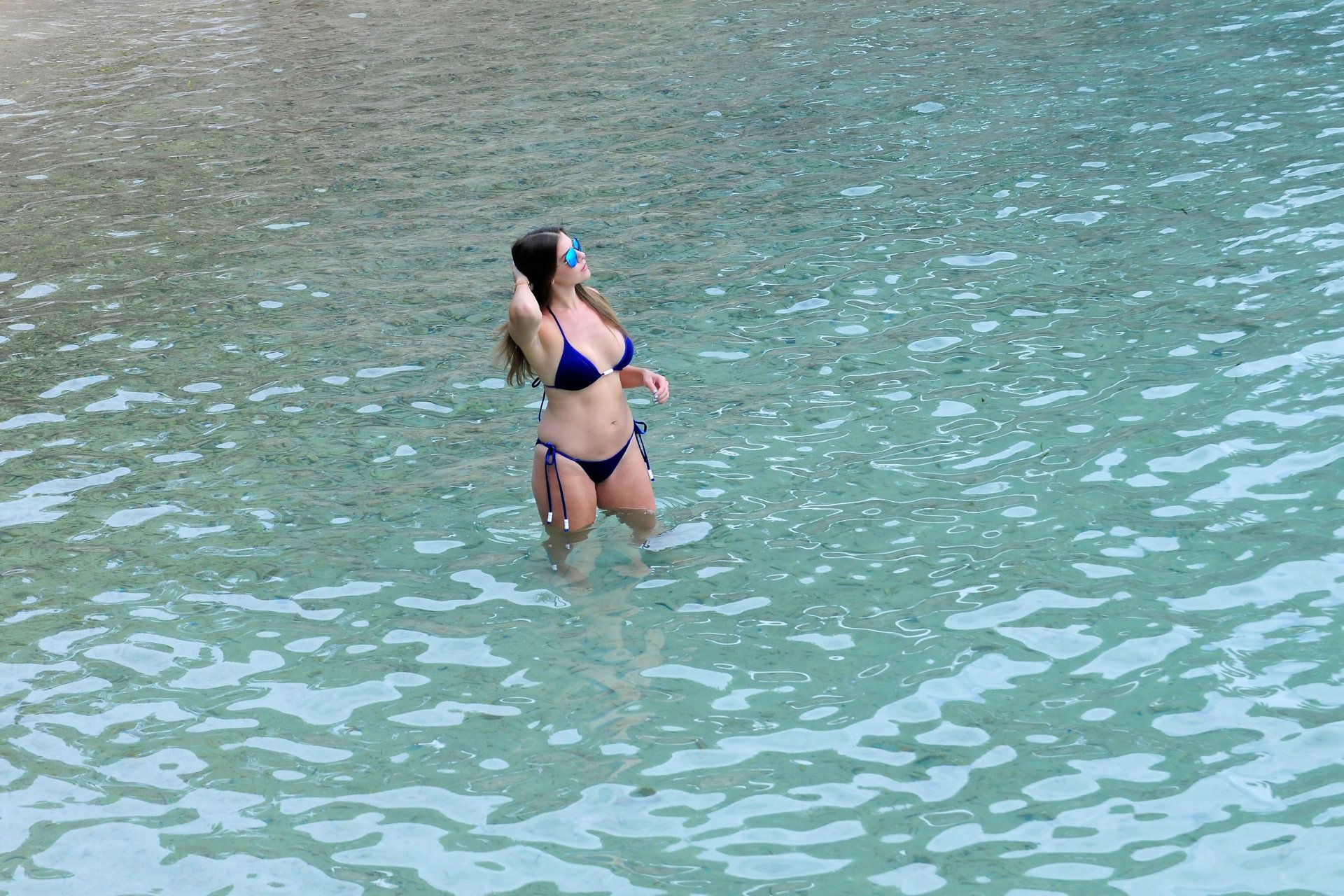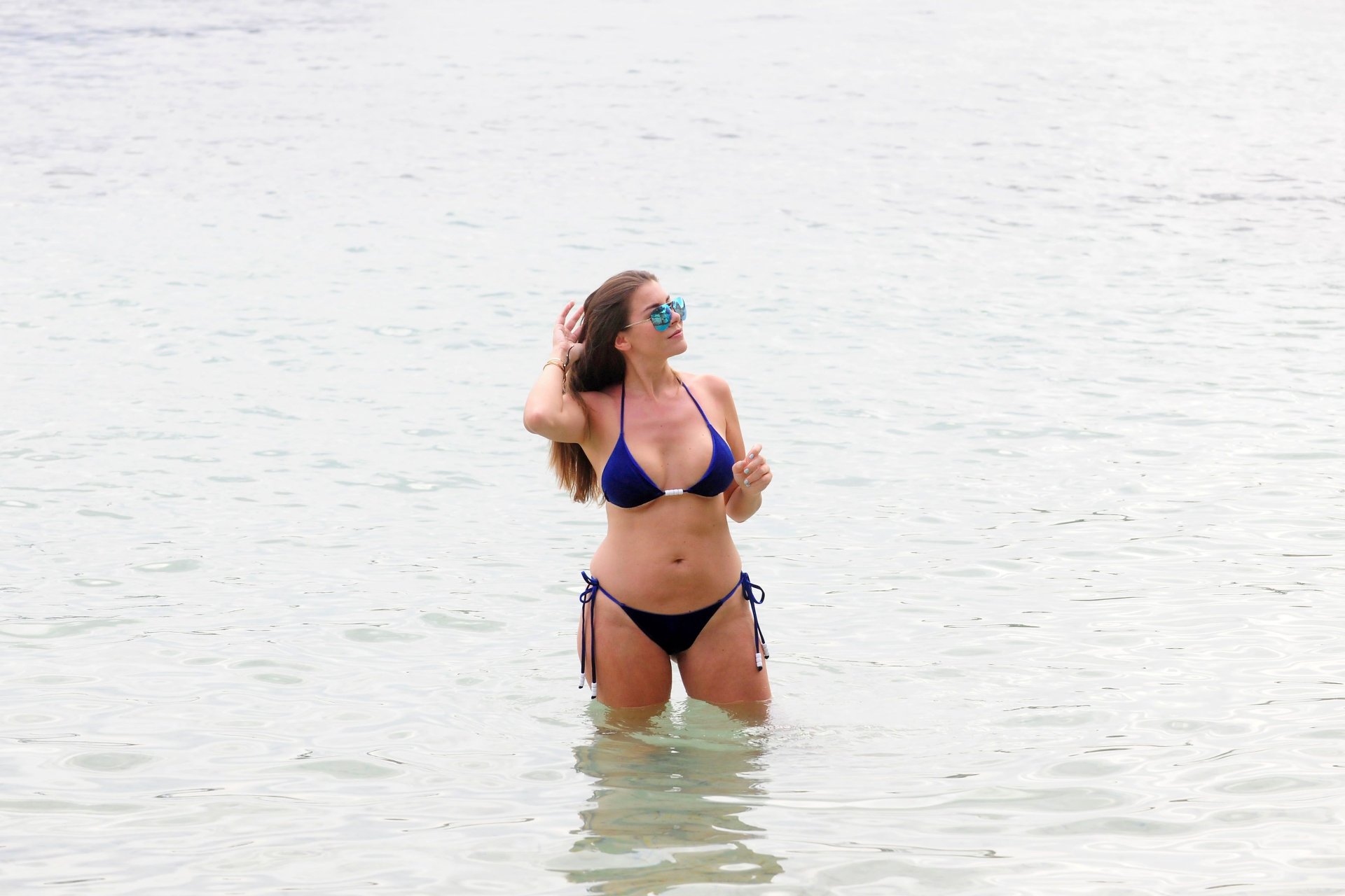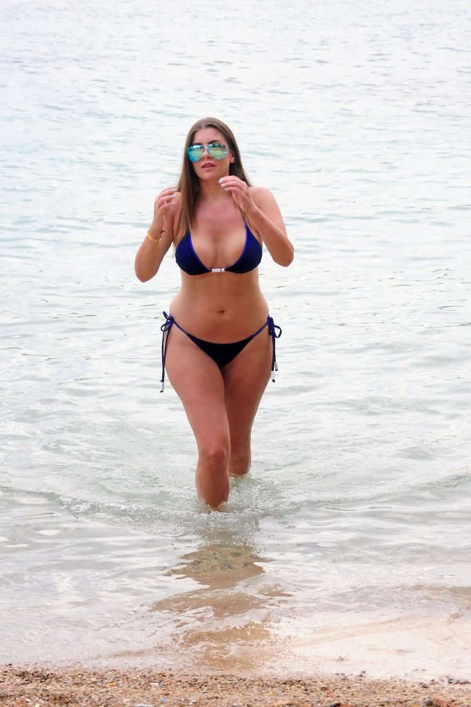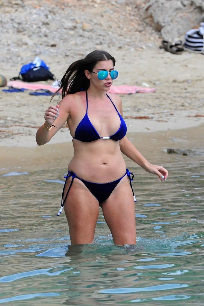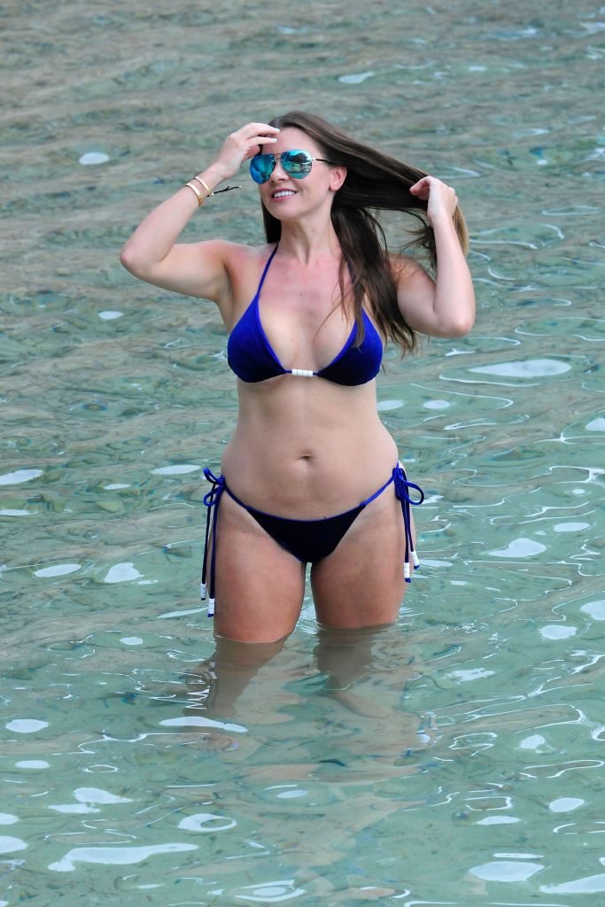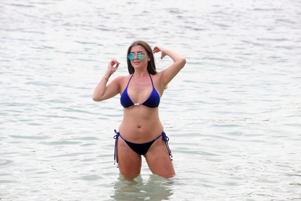 Model Imogen Thomas (34) exibe seus novos implantes em um biquíni azul na praia em Mallorca, 09/02/2017.