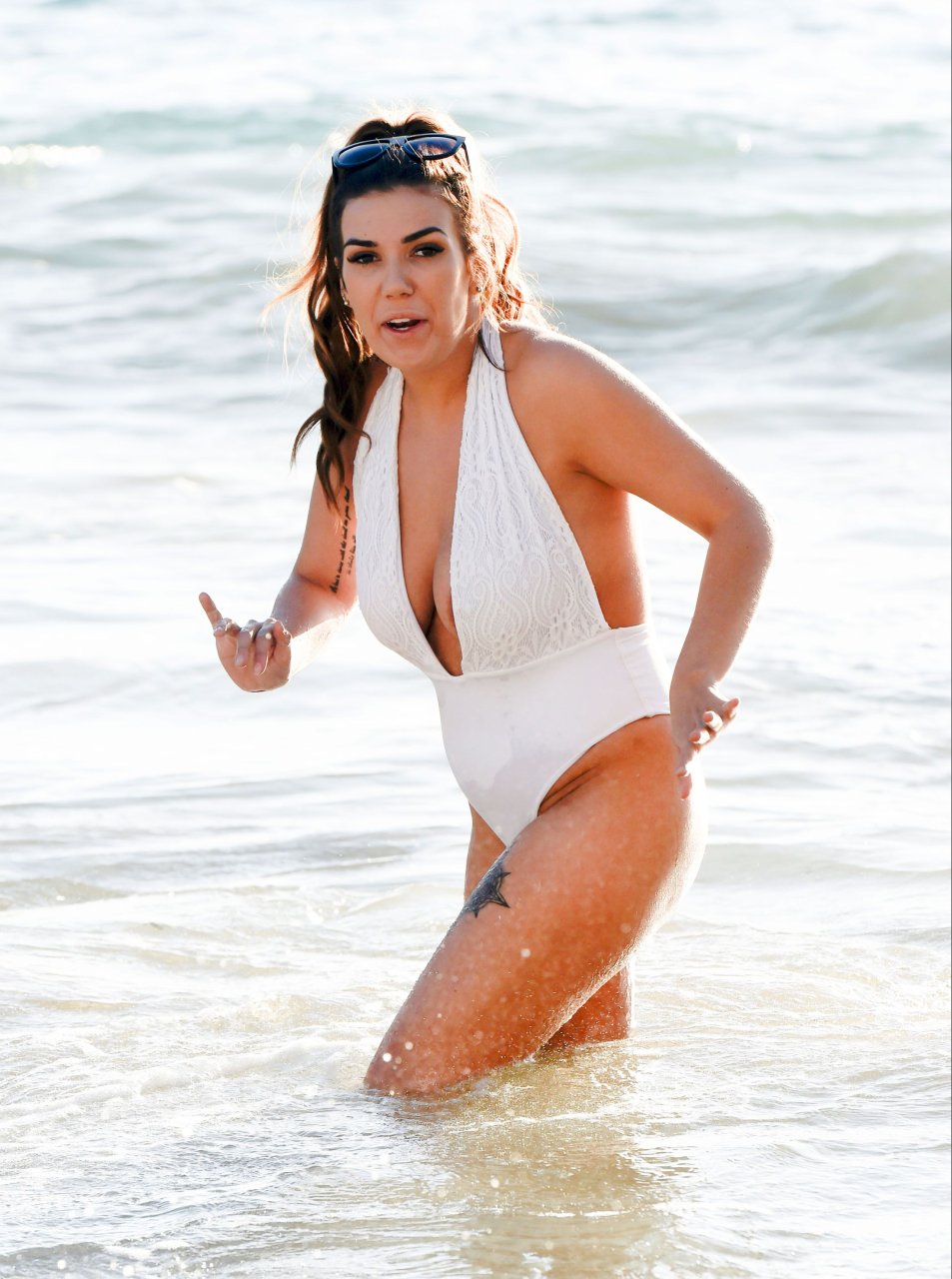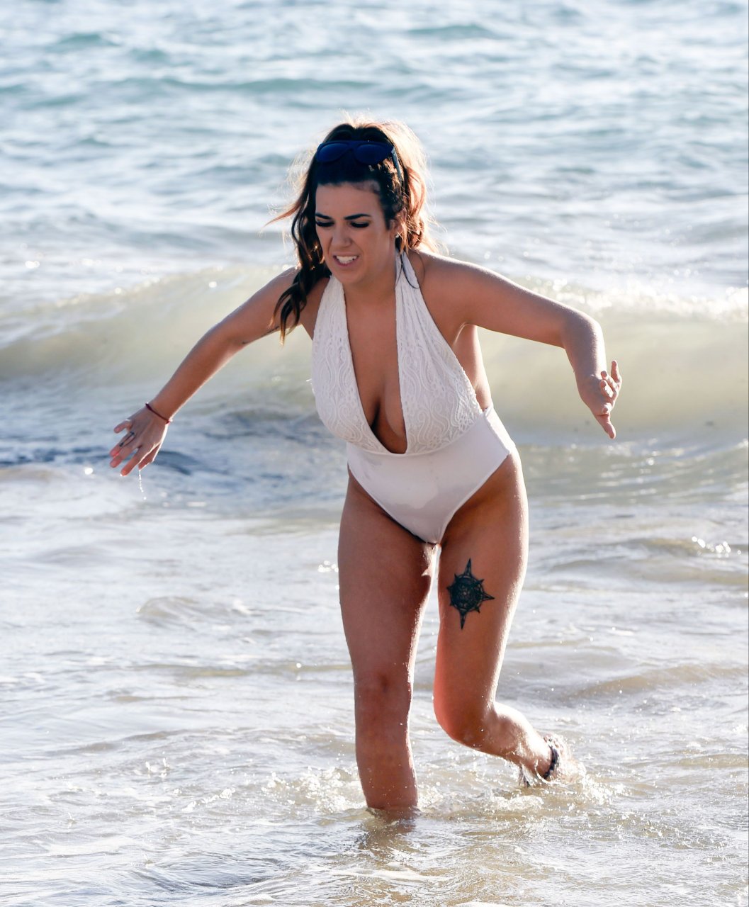 Imogen Townley usa um maiô branco e mostra um sideboob perfeito durante as férias na praia na Espanha, 13/01/2017. Imogen Townley é uma estrela britânica de reality show. Idade: 24 (19 de março de 1992).