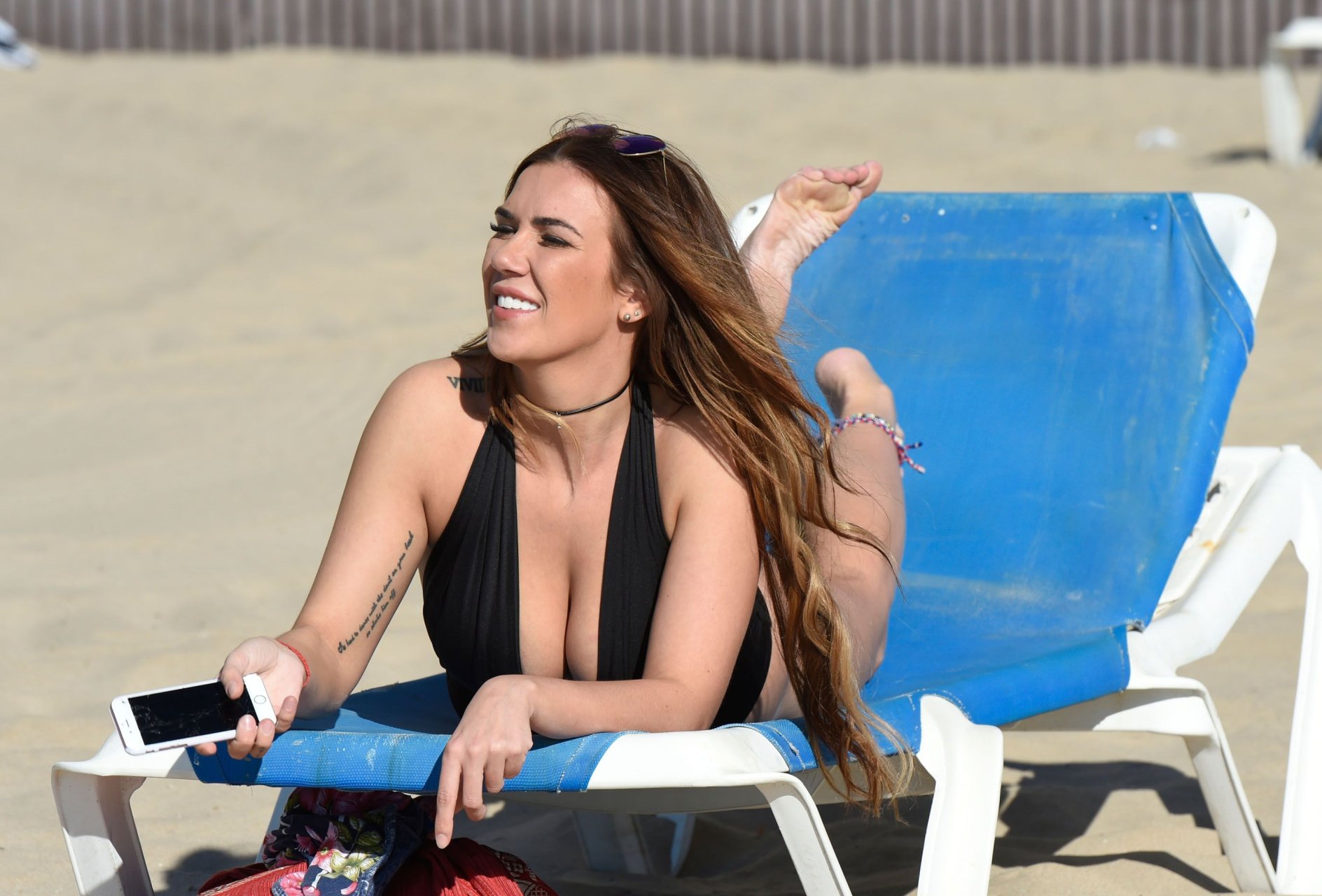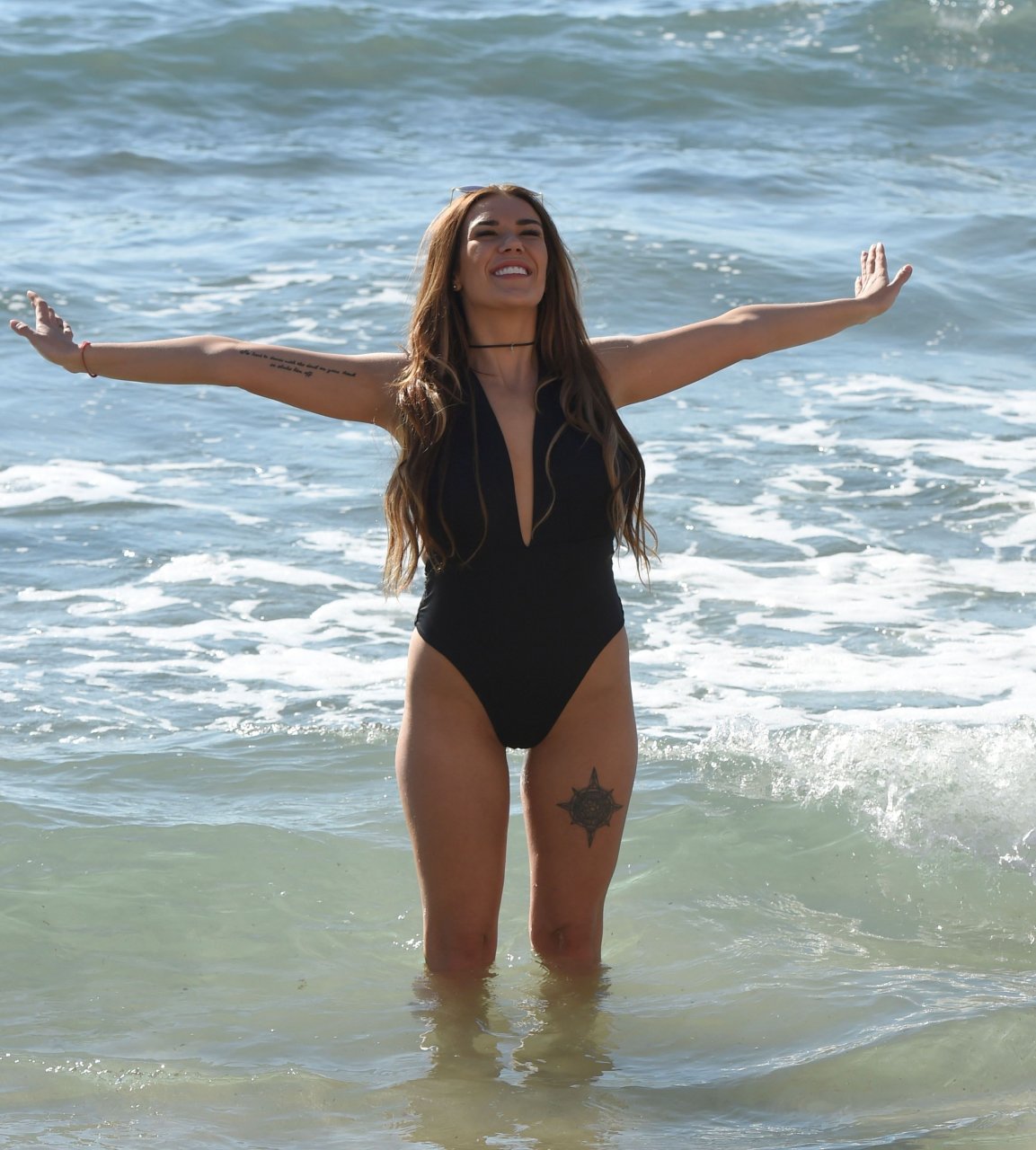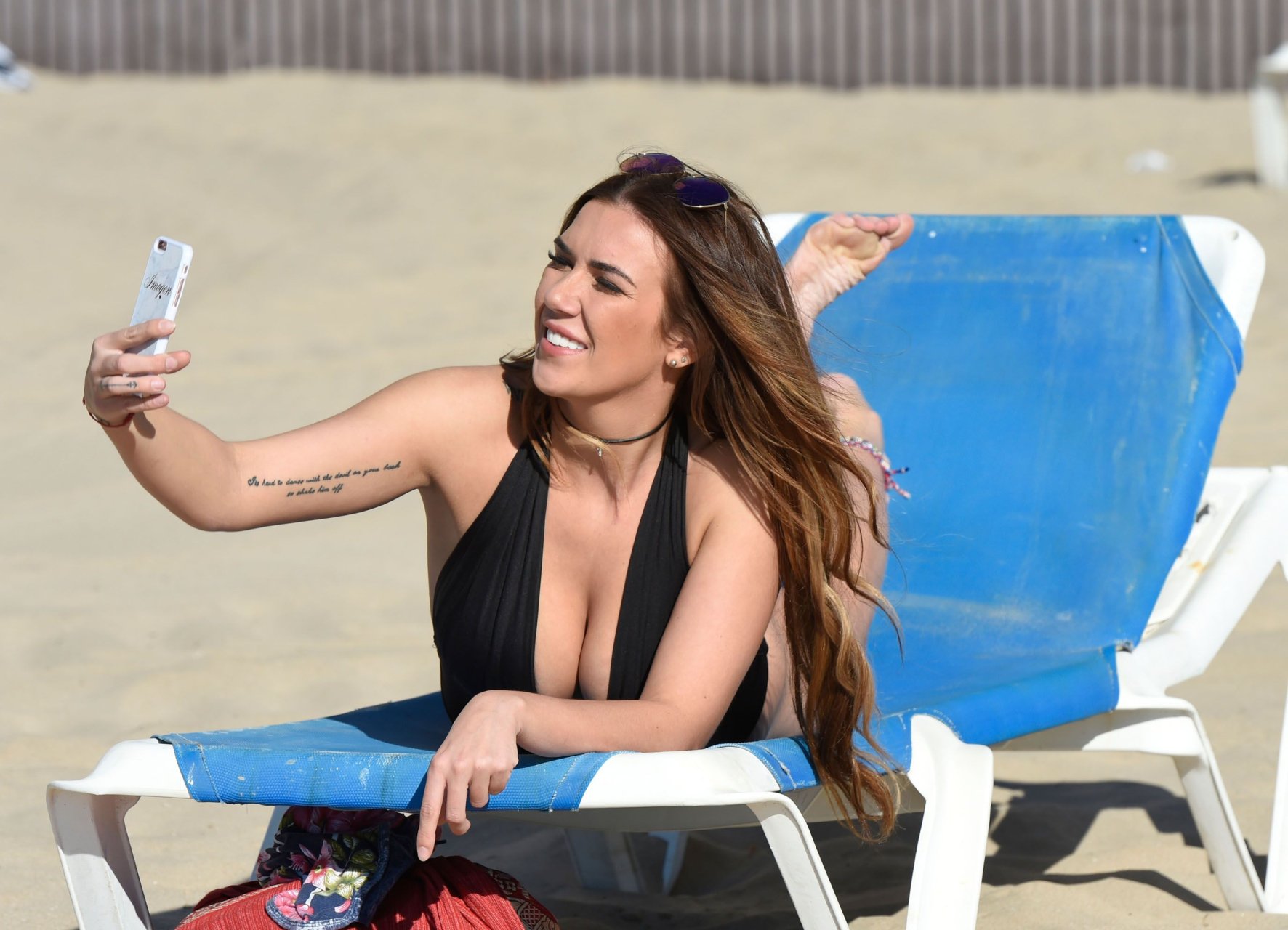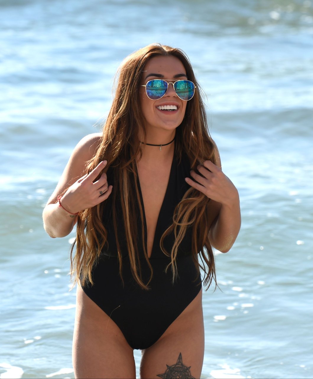 Imogen Townley usa um maiô preto na praia na Espanha, 02/02/2017. Imogen Townley é uma estrela britânica de reality show. Idade: 24 (nascida em 19 de março de 1992).