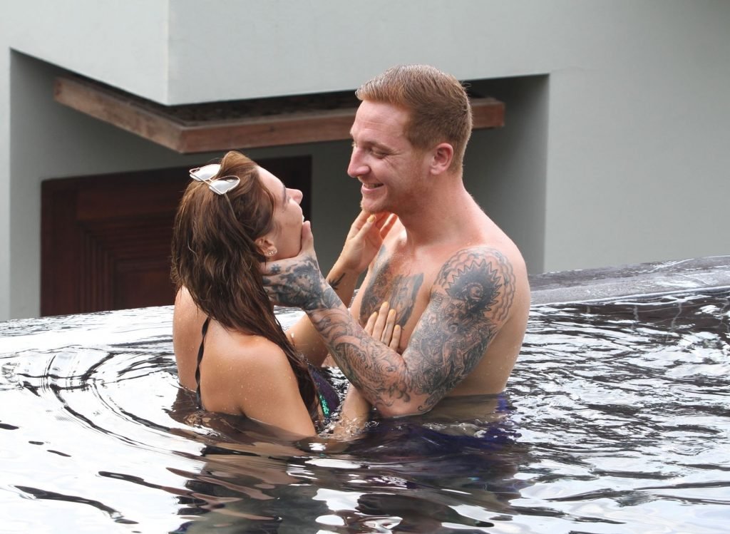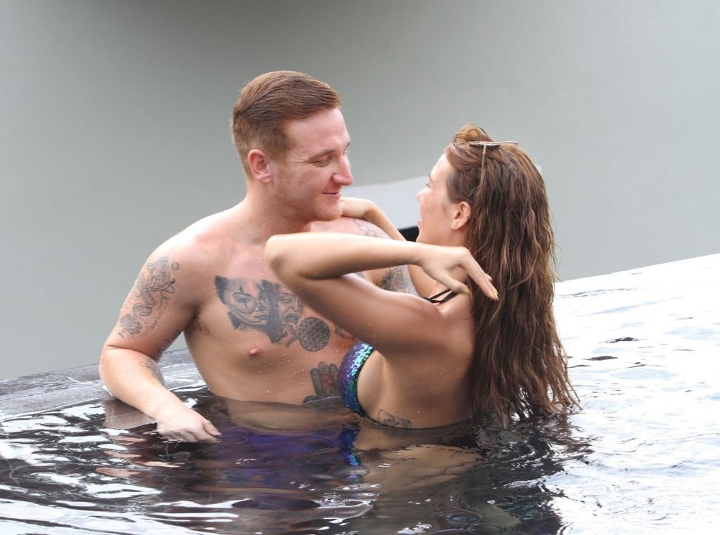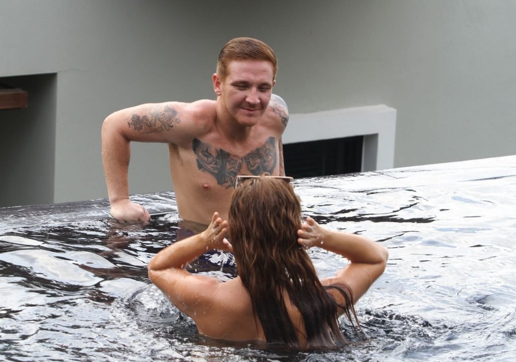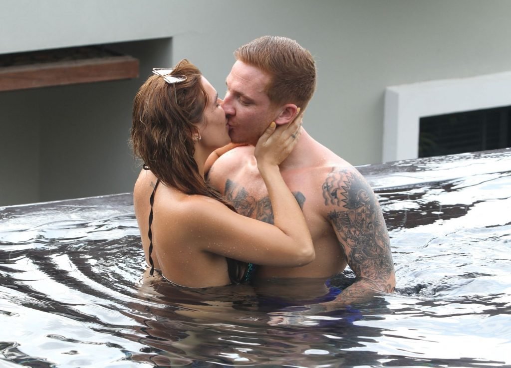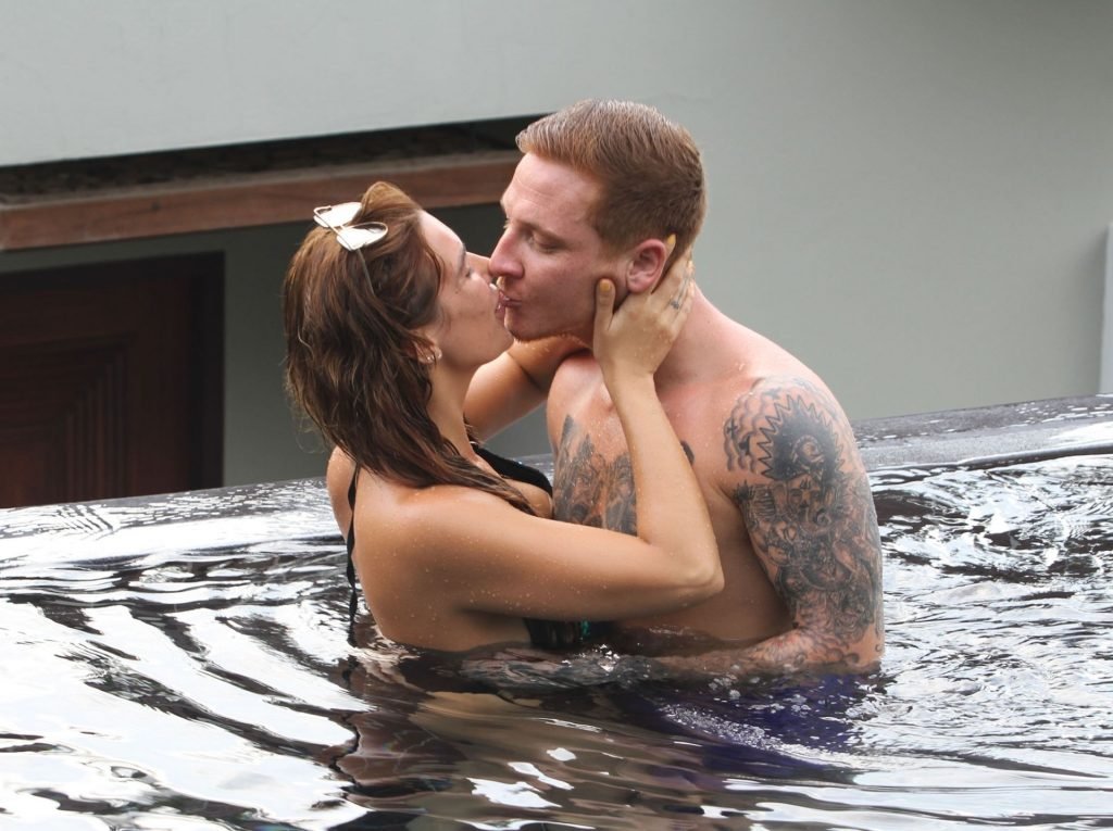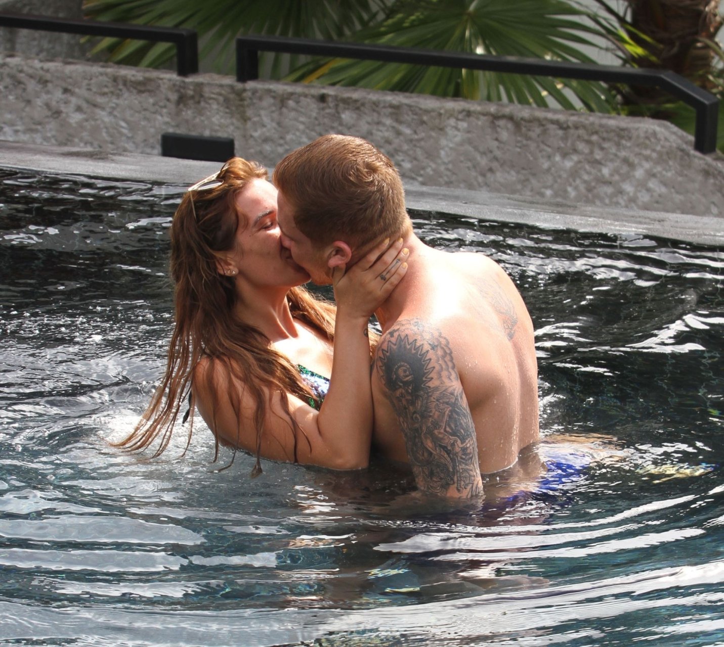 A estrela de “Ibiza Weekender” Imogen Townley exibe um display sexy de carinho com seu namorado fortemente tatuado, Lewis.