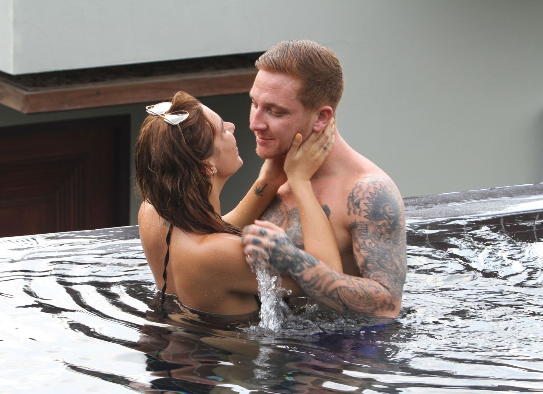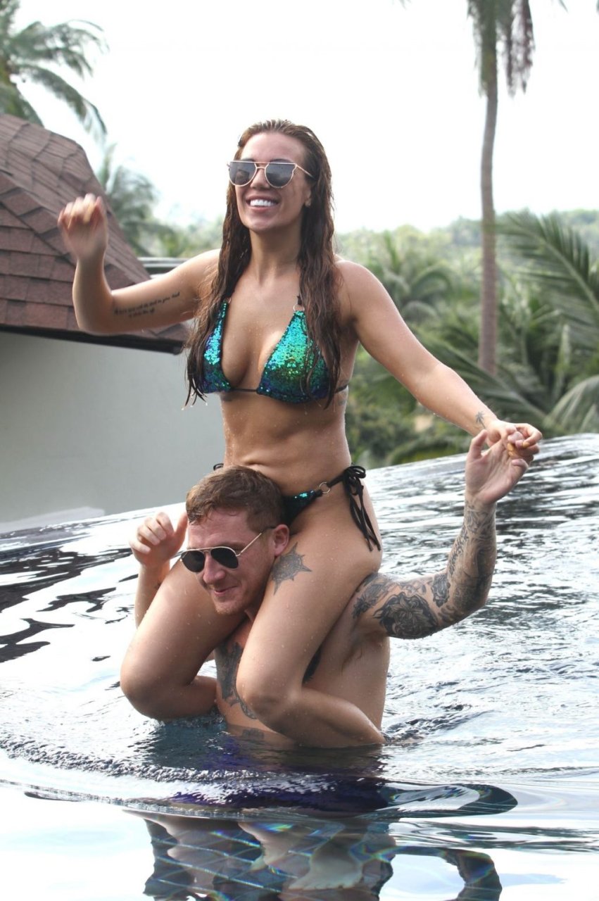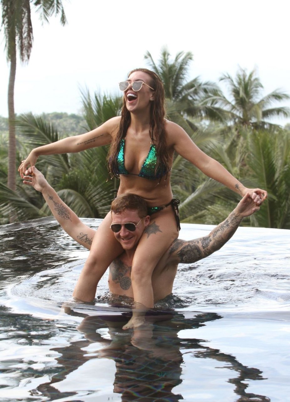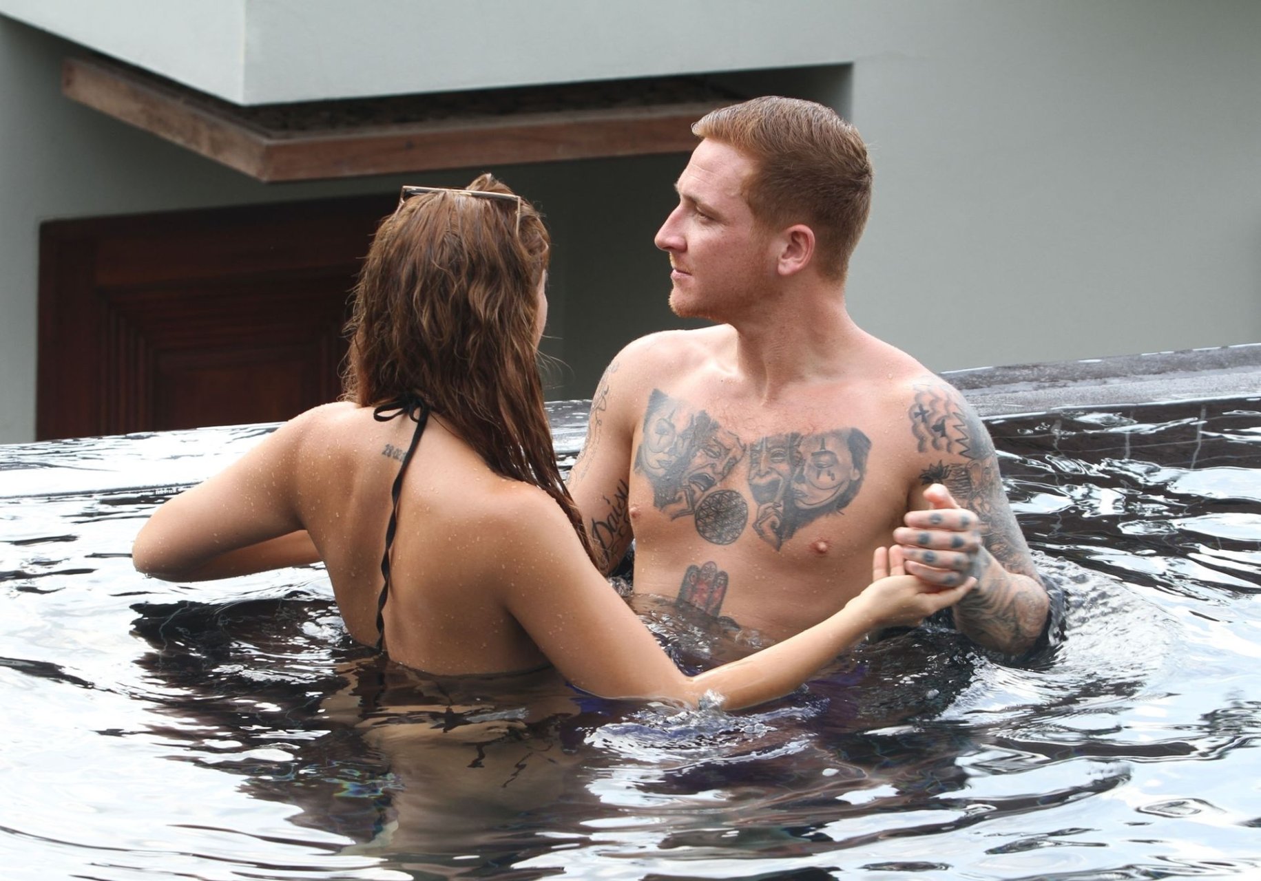 A estrela de “Ibiza Weekender” Imogen Townley exibe um display sexy de carinho com seu namorado fortemente tatuado, Lewis.