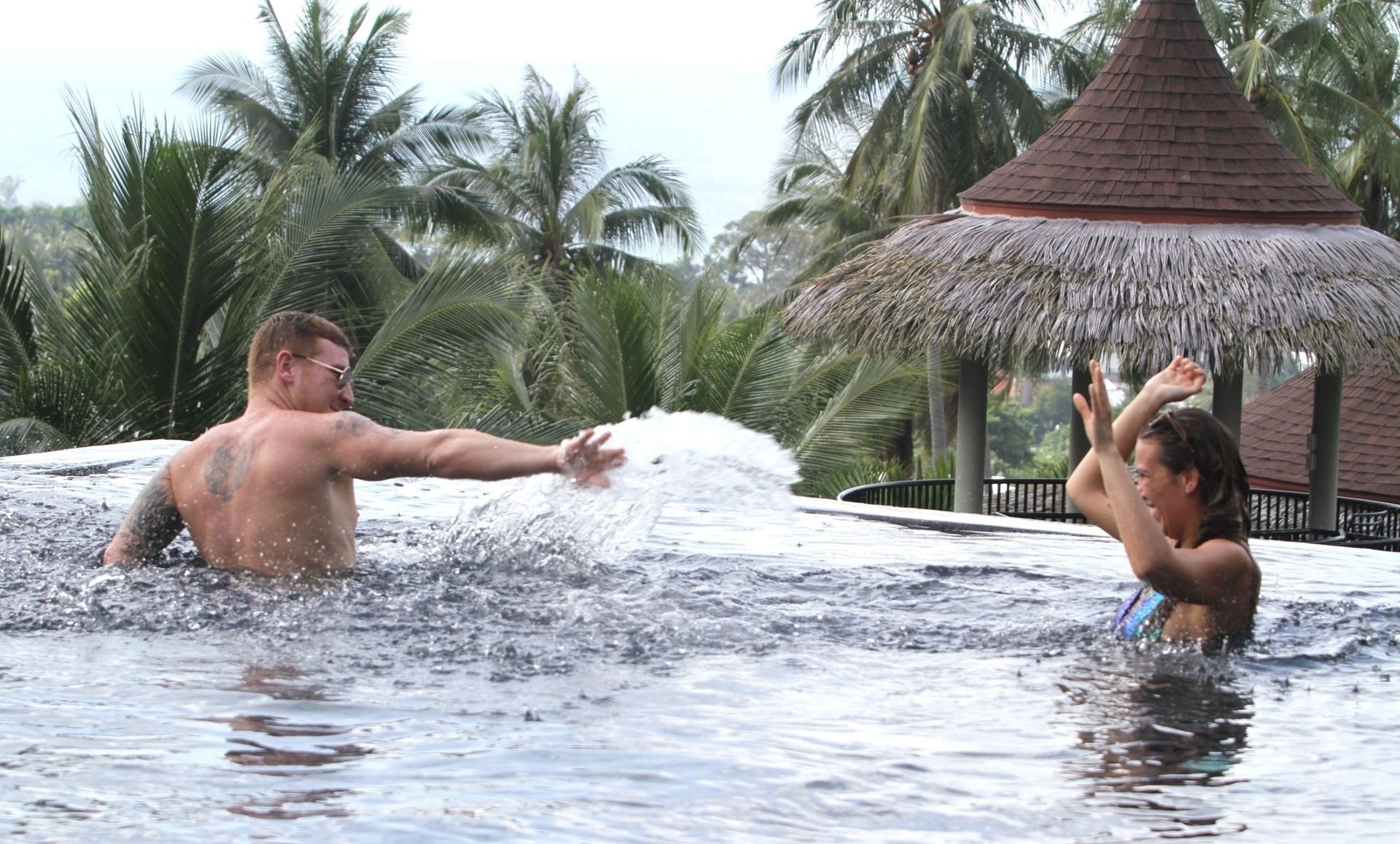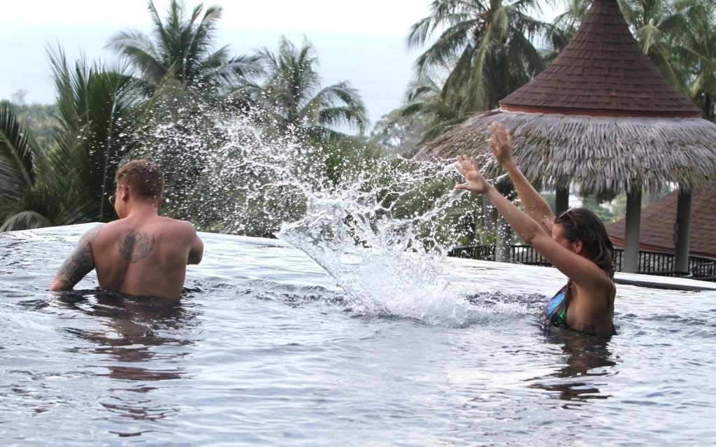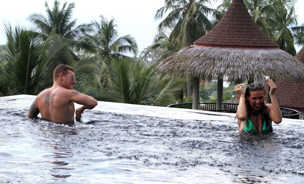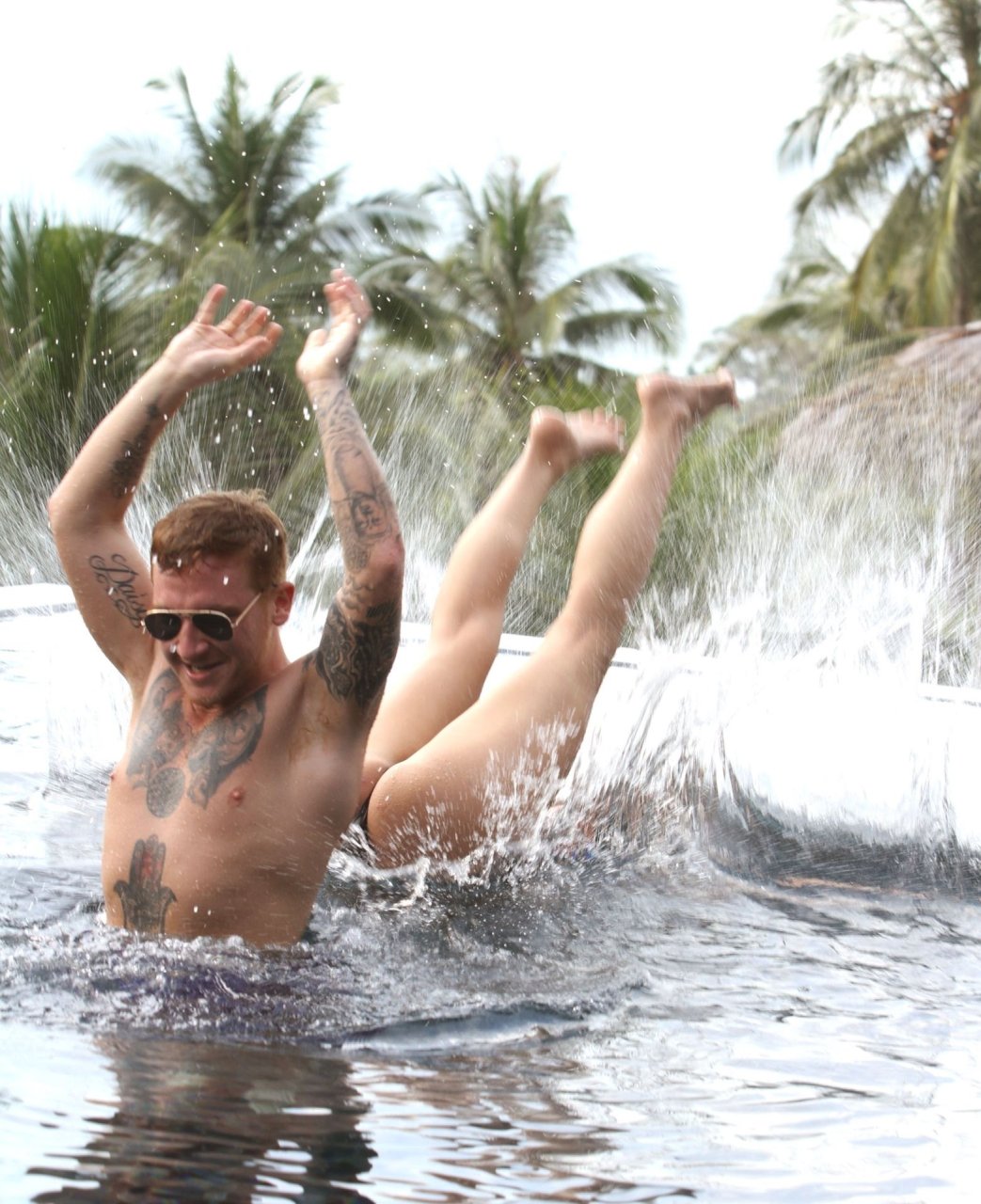 Imogen, que já perdeu 3 pedras em peso, e parece que o novo regime está dando resultado, pois a estrela parecia incrível em seu biquíni multicolorido durante as férias na piscina na Tailândia (abril de 2019).