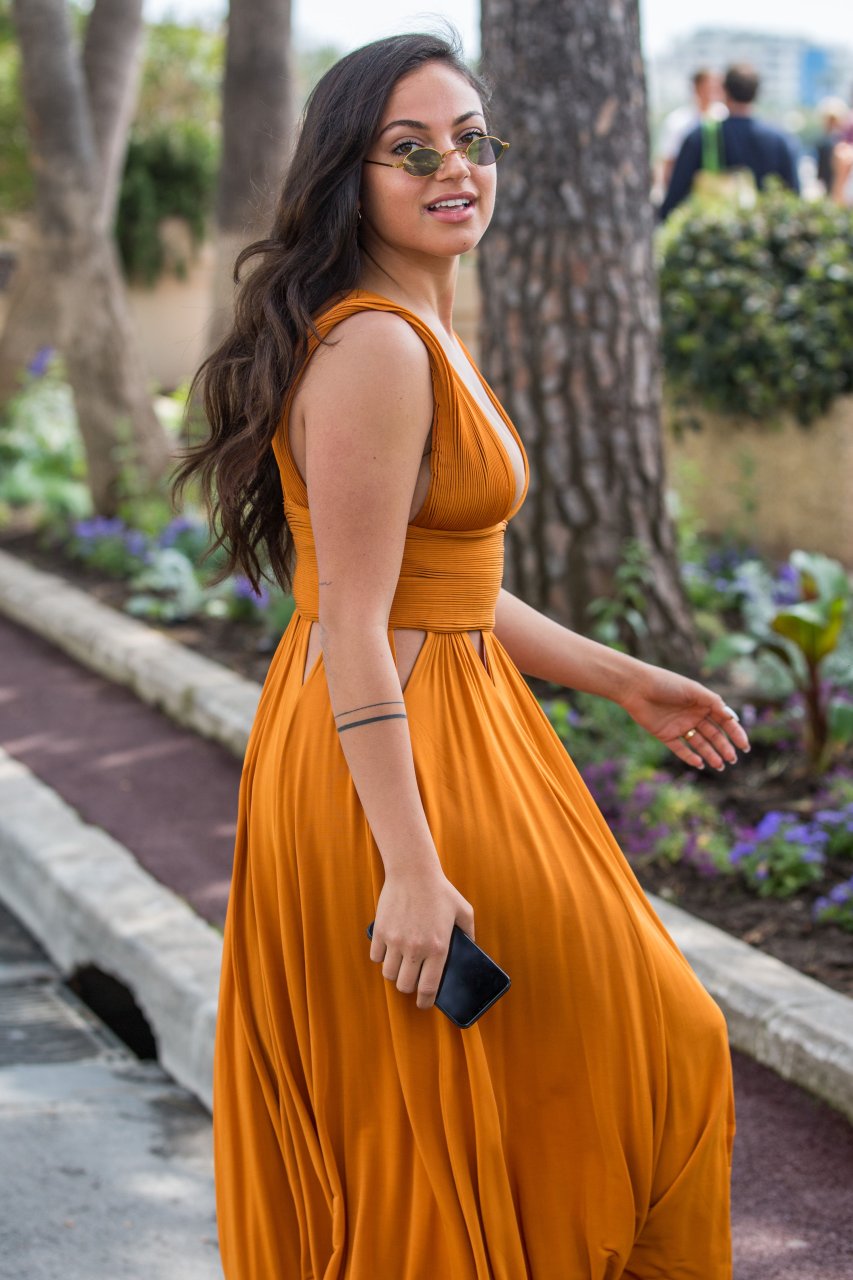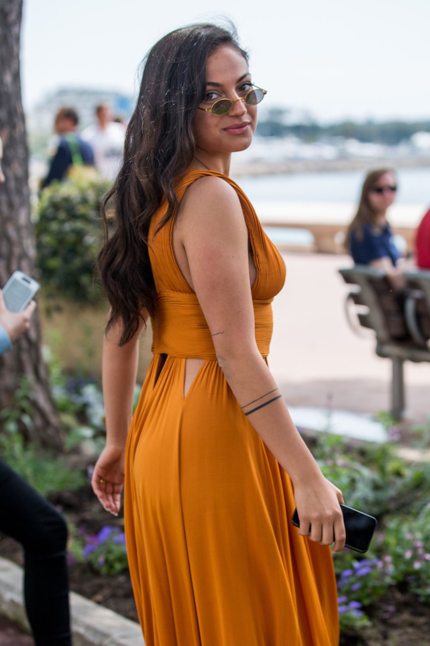 Inanna Sarkis é vista com um vestido laranja na Croisette em Cannes, França, 10/05/2018. A atriz voluptuosa, blogueira e estrela das redes sociais exibiu seu decote profundo e mandou um beijo para os paparazzi.
