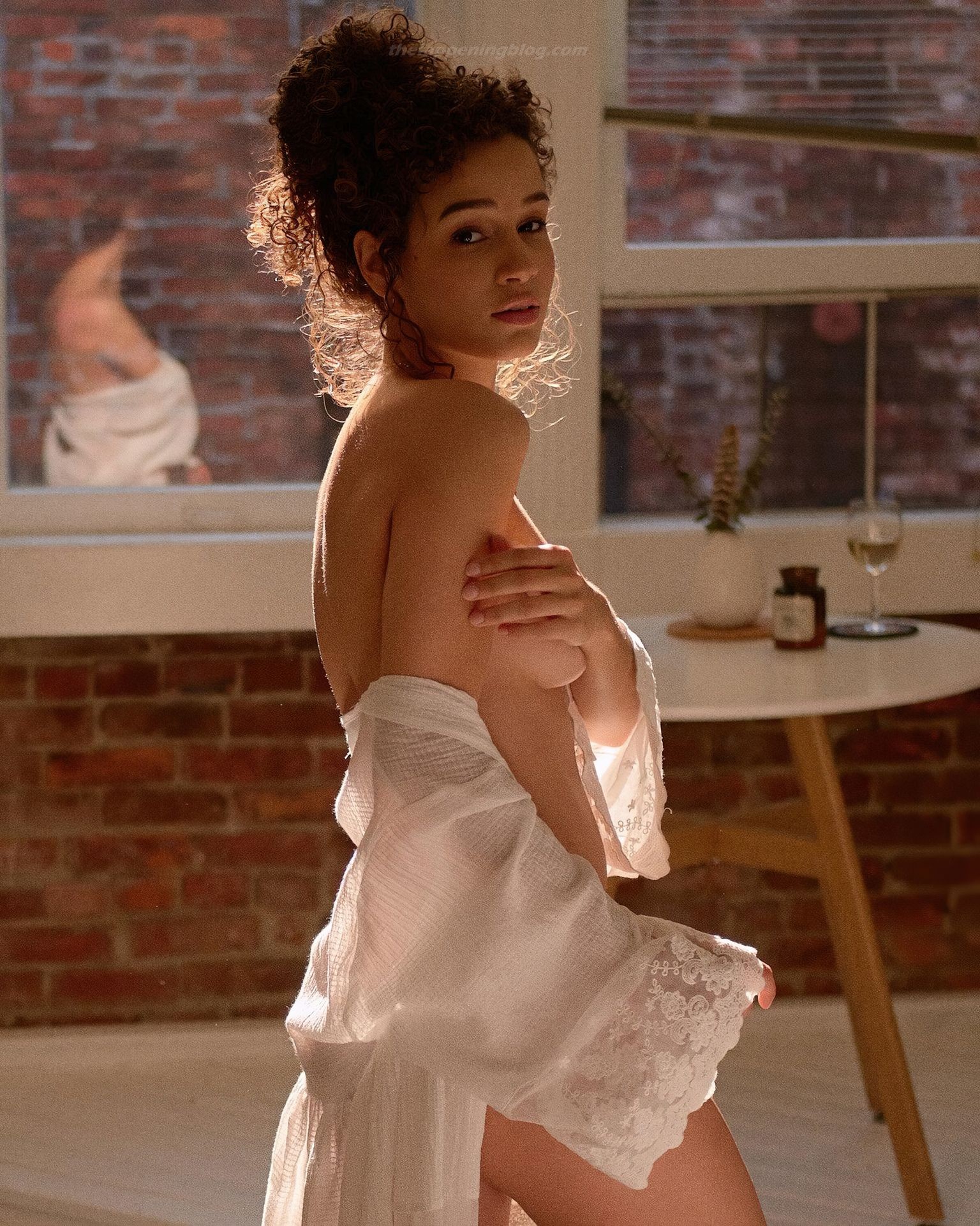 A modelo americana, artista e fotógrafa India “Indi” Williams posa nua na cama com um ventilador e uma taça de vinho em um ensaio fotográfico nu em Seattle por Joel Wallace Henderson (2019).