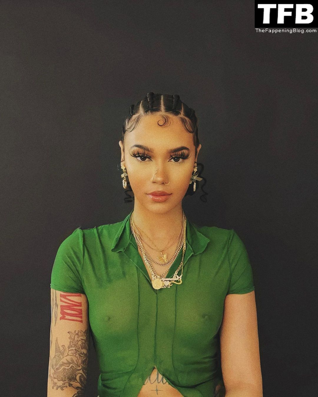 A cantora Indyamarie exibe seus seios nus enquanto posa com uma camisa verde para seus seguidores no Instagram, 24/01/2022.