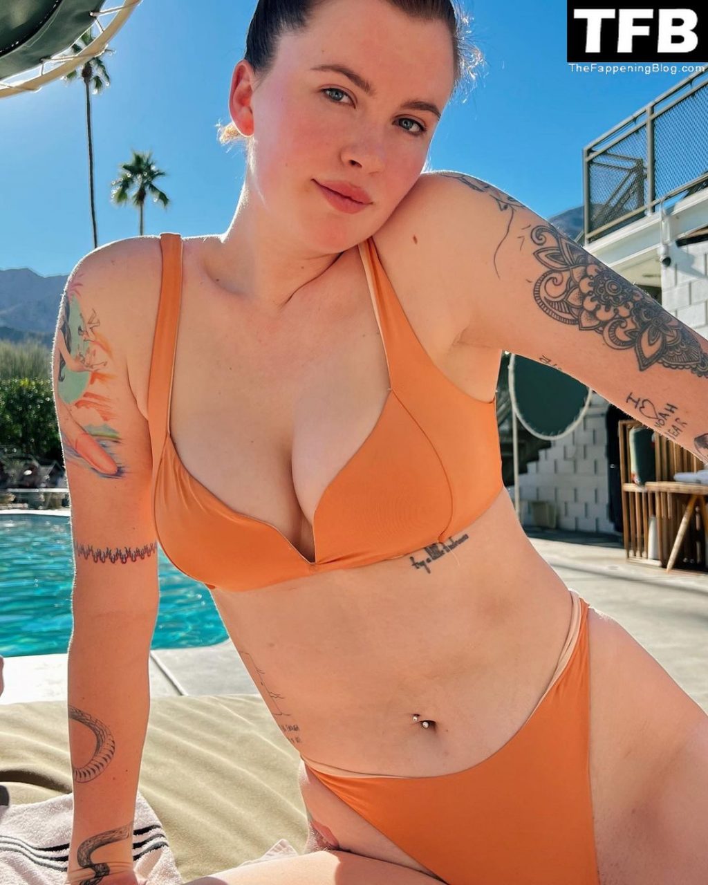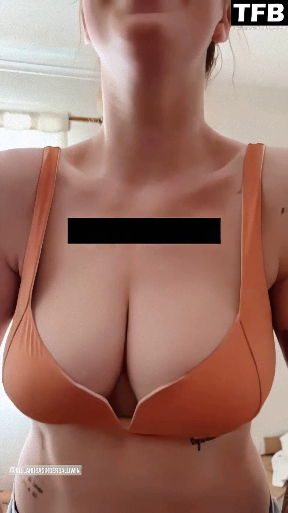 Model Ireland Baldwin mostra seus seios sexy, posando de biquíni laranja na piscina e balançando-os para nós no vídeo das redes sociais abaixo (novembro de 2021).