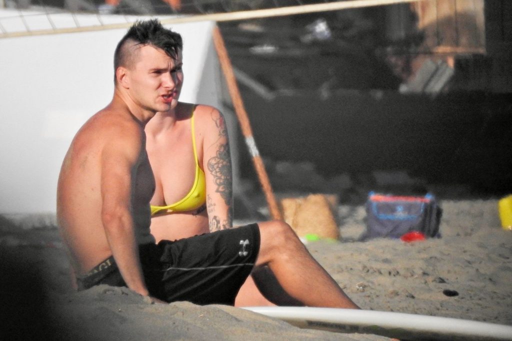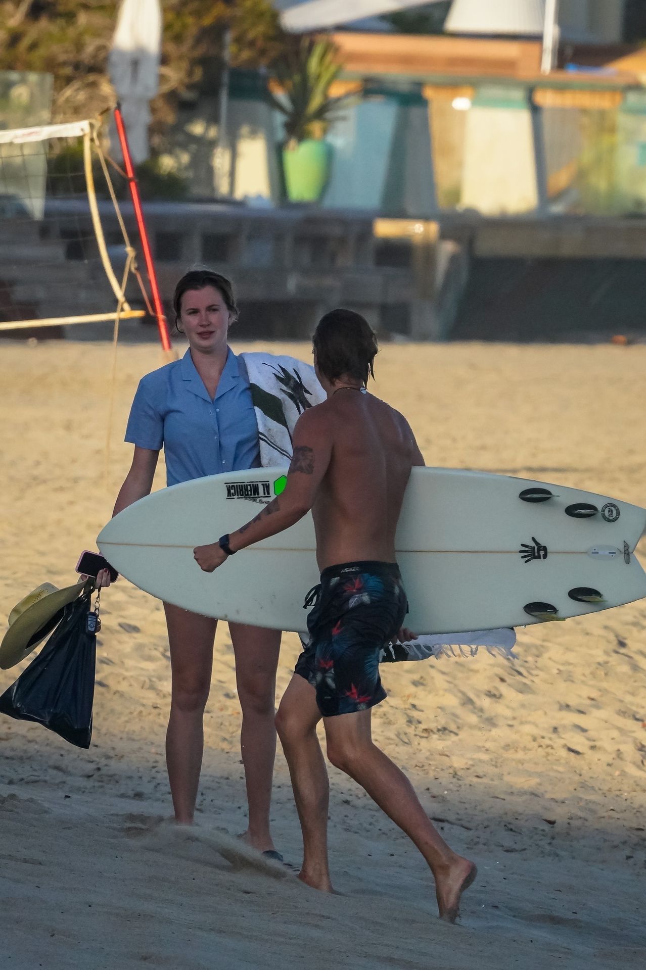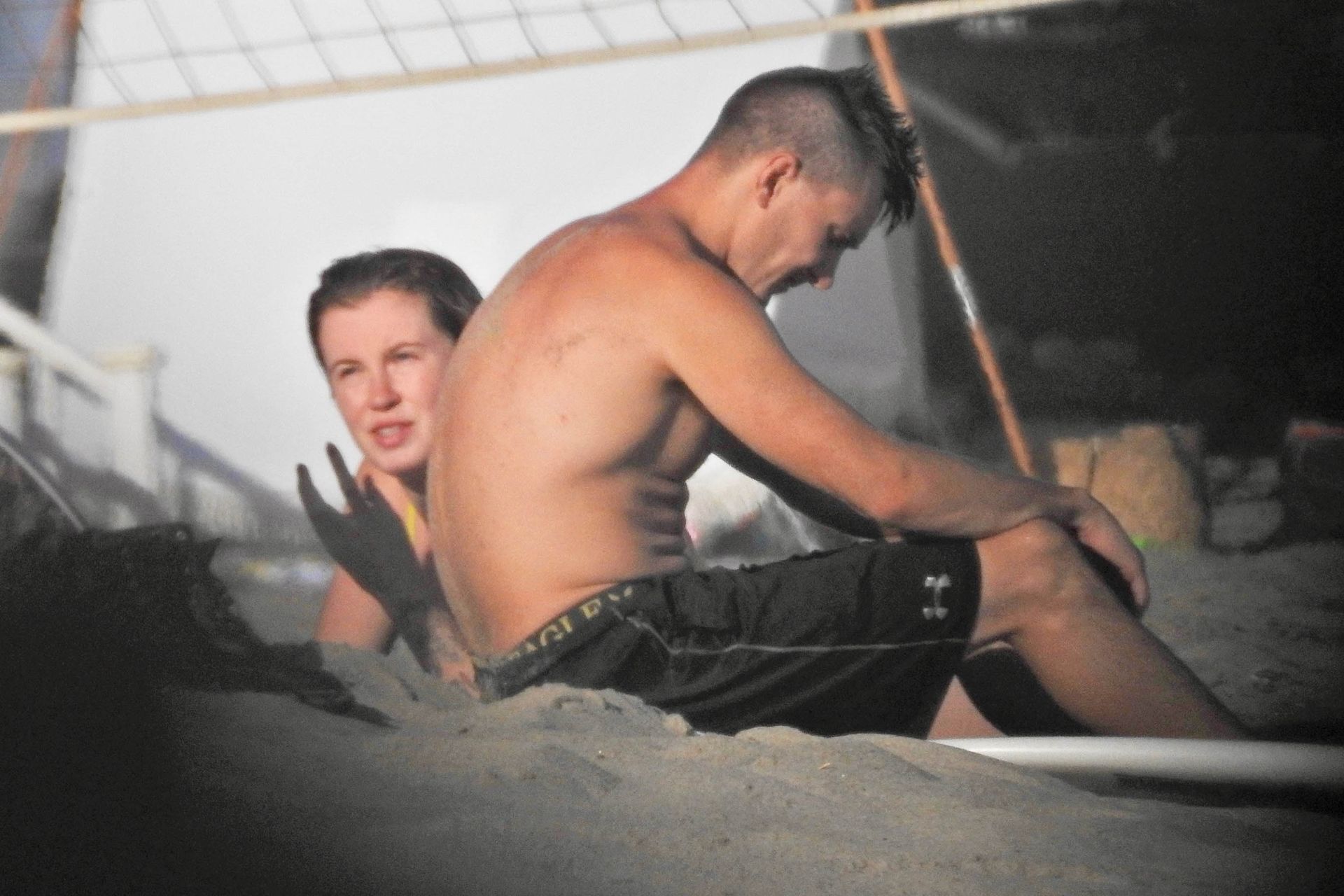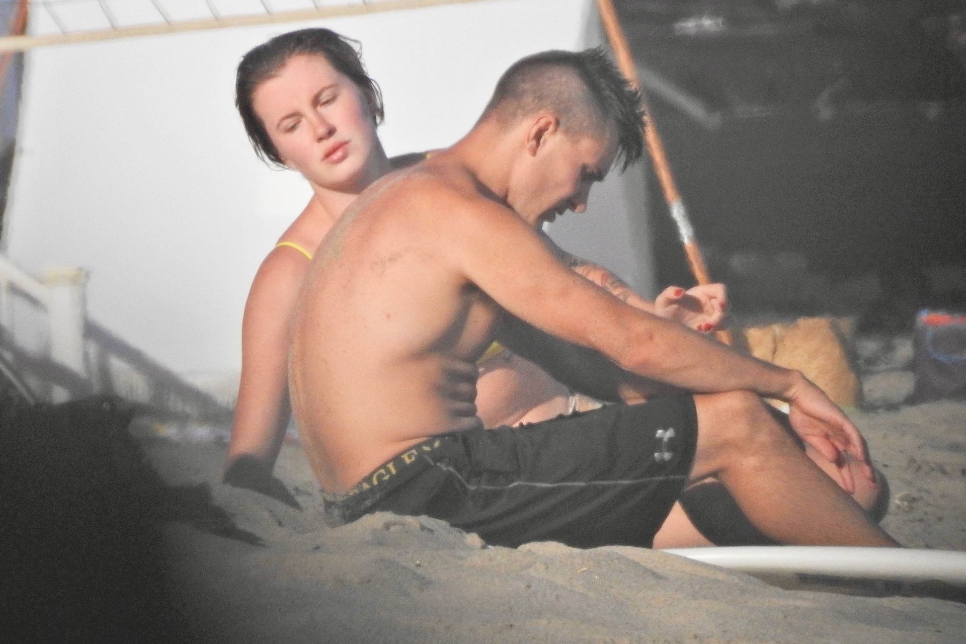 Ireland está de bom humor enquanto relaxa na beira da praia tomando sol, enquanto Corey se refresca na água.
