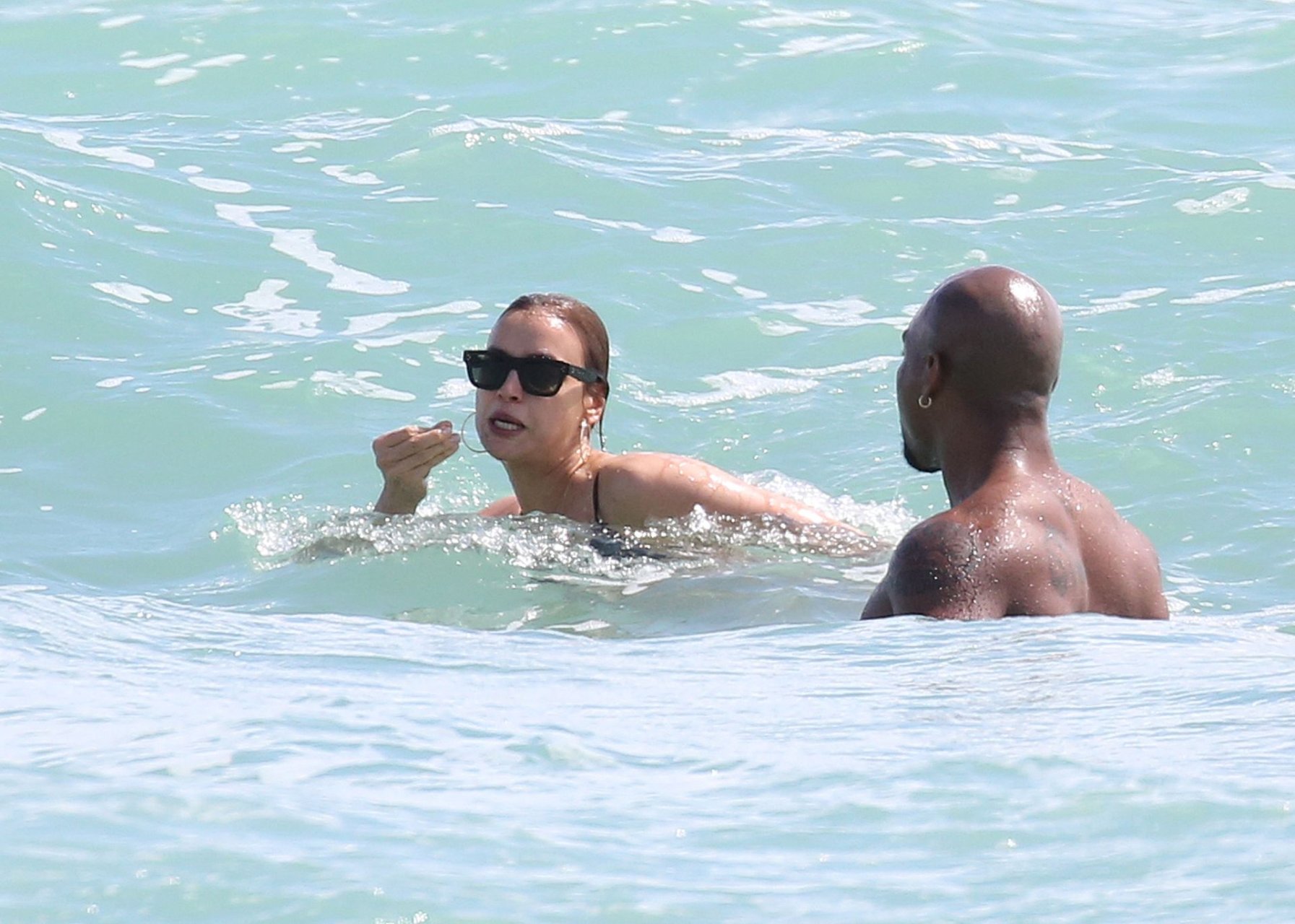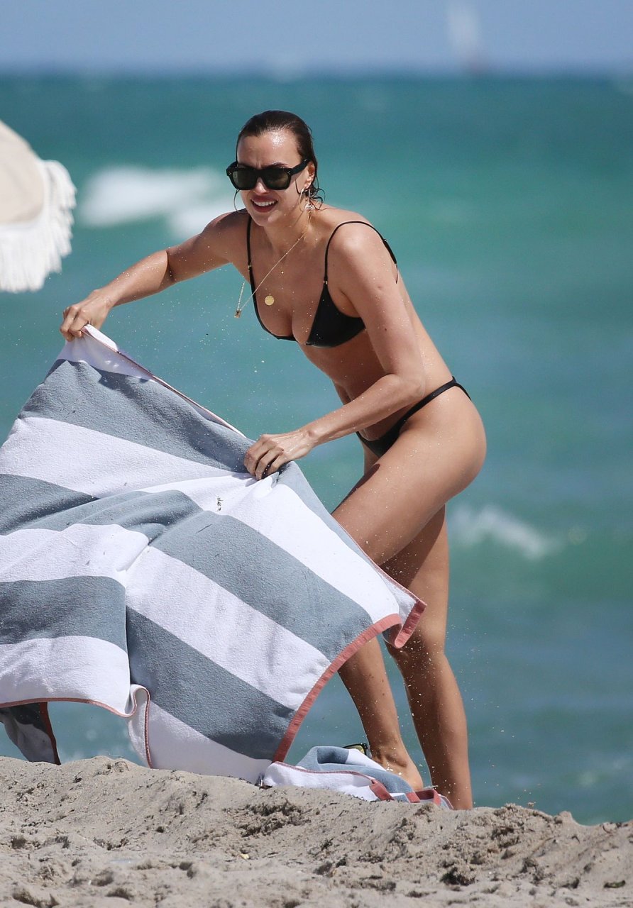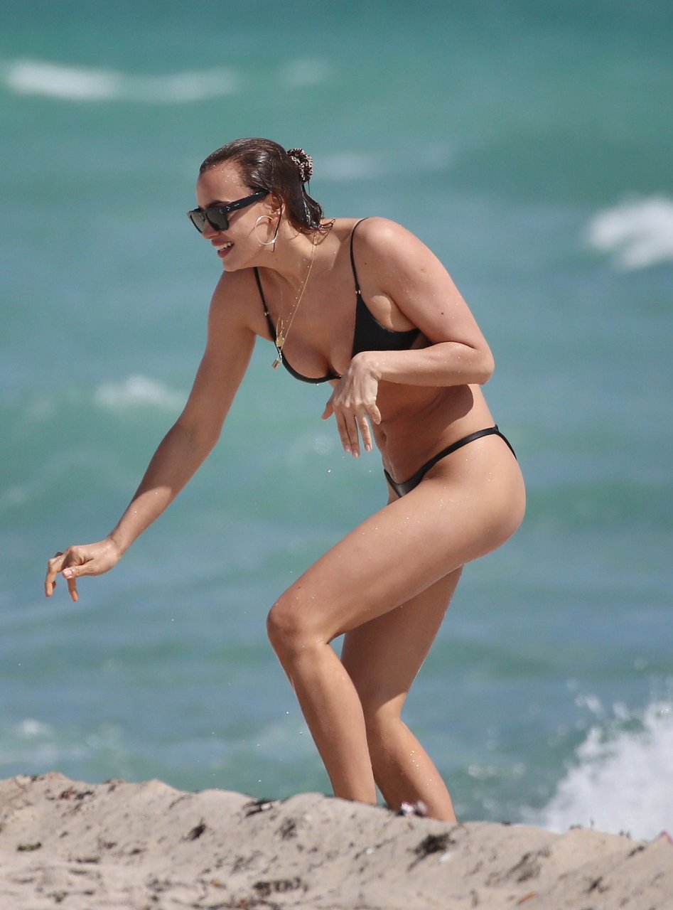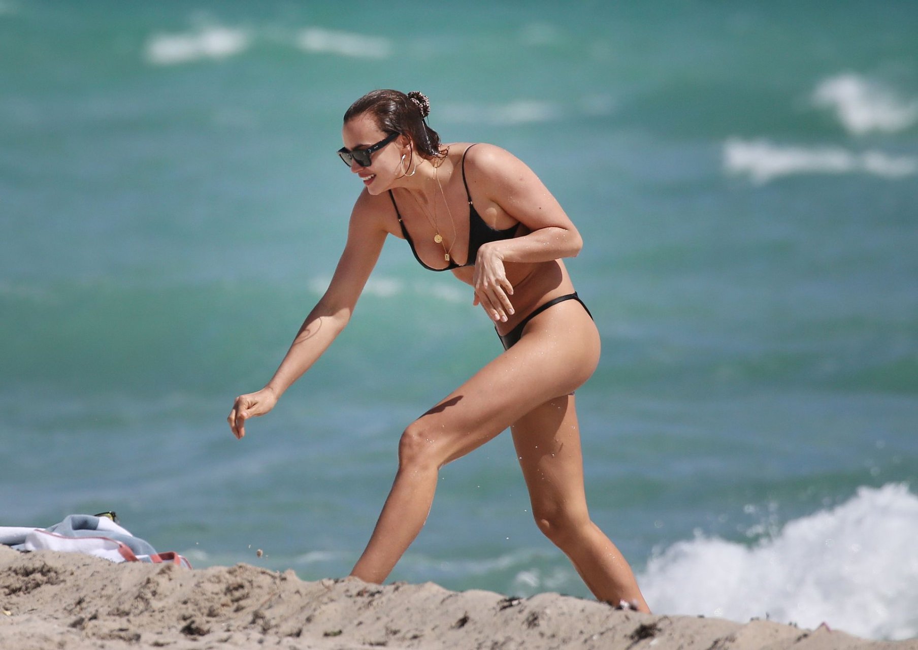 A supermodelo Irina Shayk quase sofre um problema de roupa em um biquíni preto minúsculo enquanto aproveita a praia em Miami, 08/03/2019.