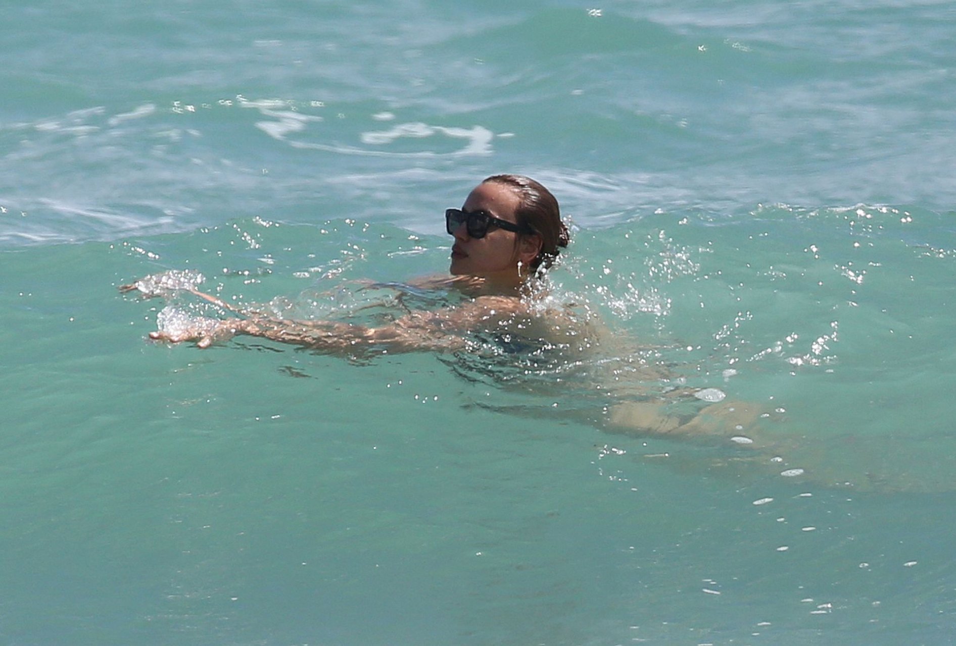 A supermodelo russa de 33 anos, que tem a filha Lea com o ator de 44 anos, exibiu suas pernas impossivelmente longas, assim como seu abdômen tonificado e seu generoso decote no biquíni preto quase inexistente.