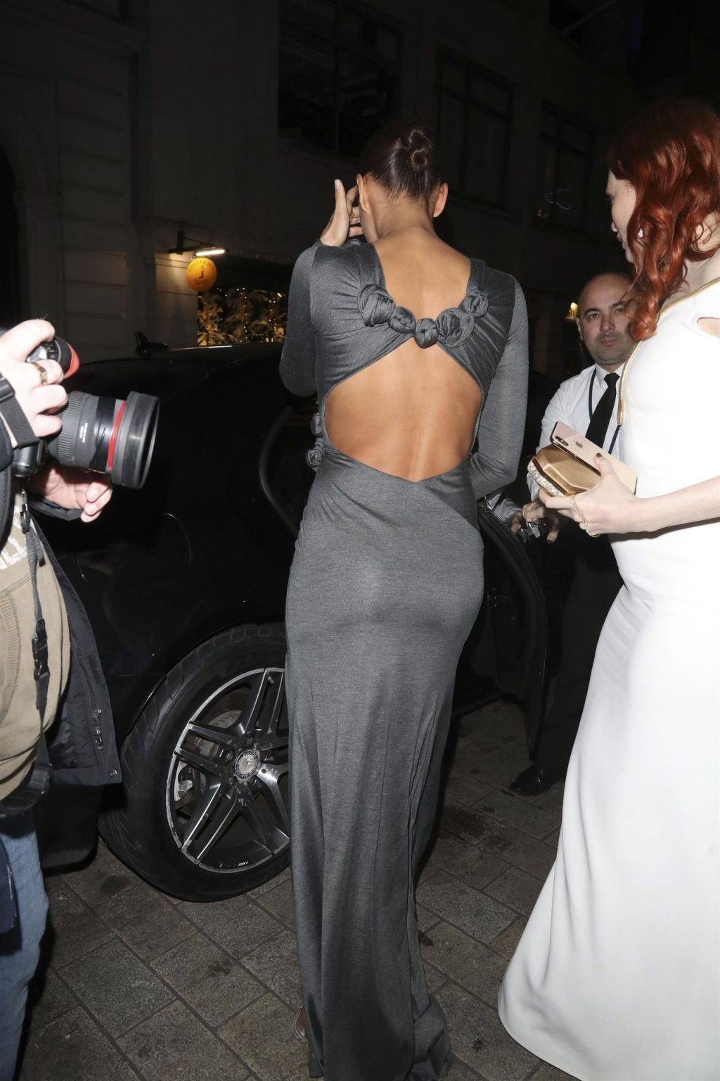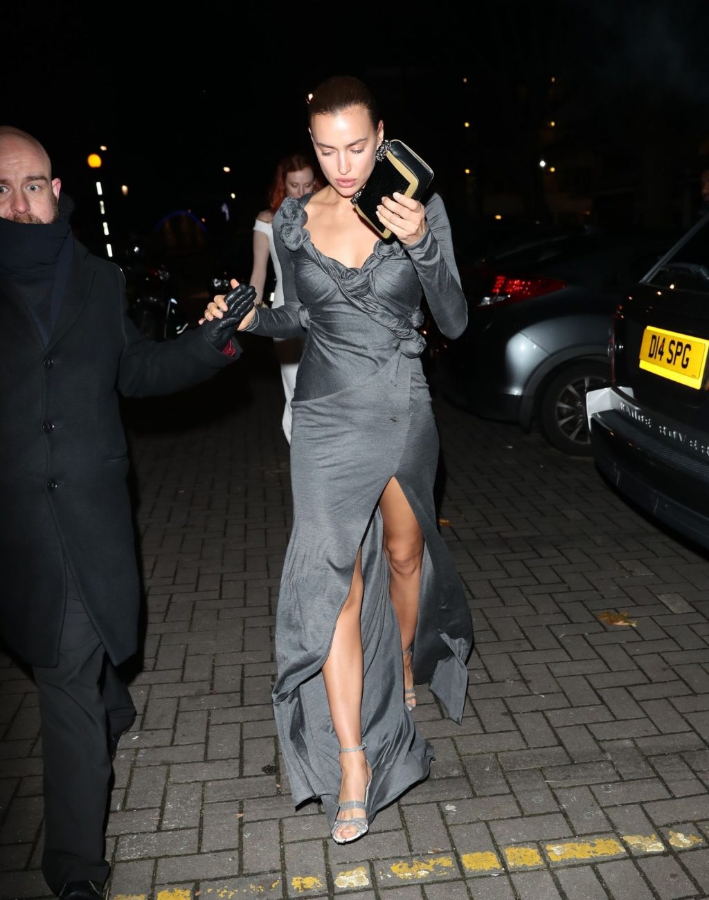 Irina foi vista exibindo seu impressionante vestido longo enquanto saía do evento e seguia para as after parties.
