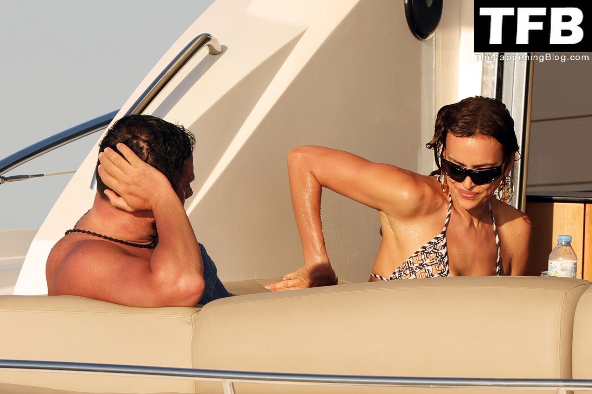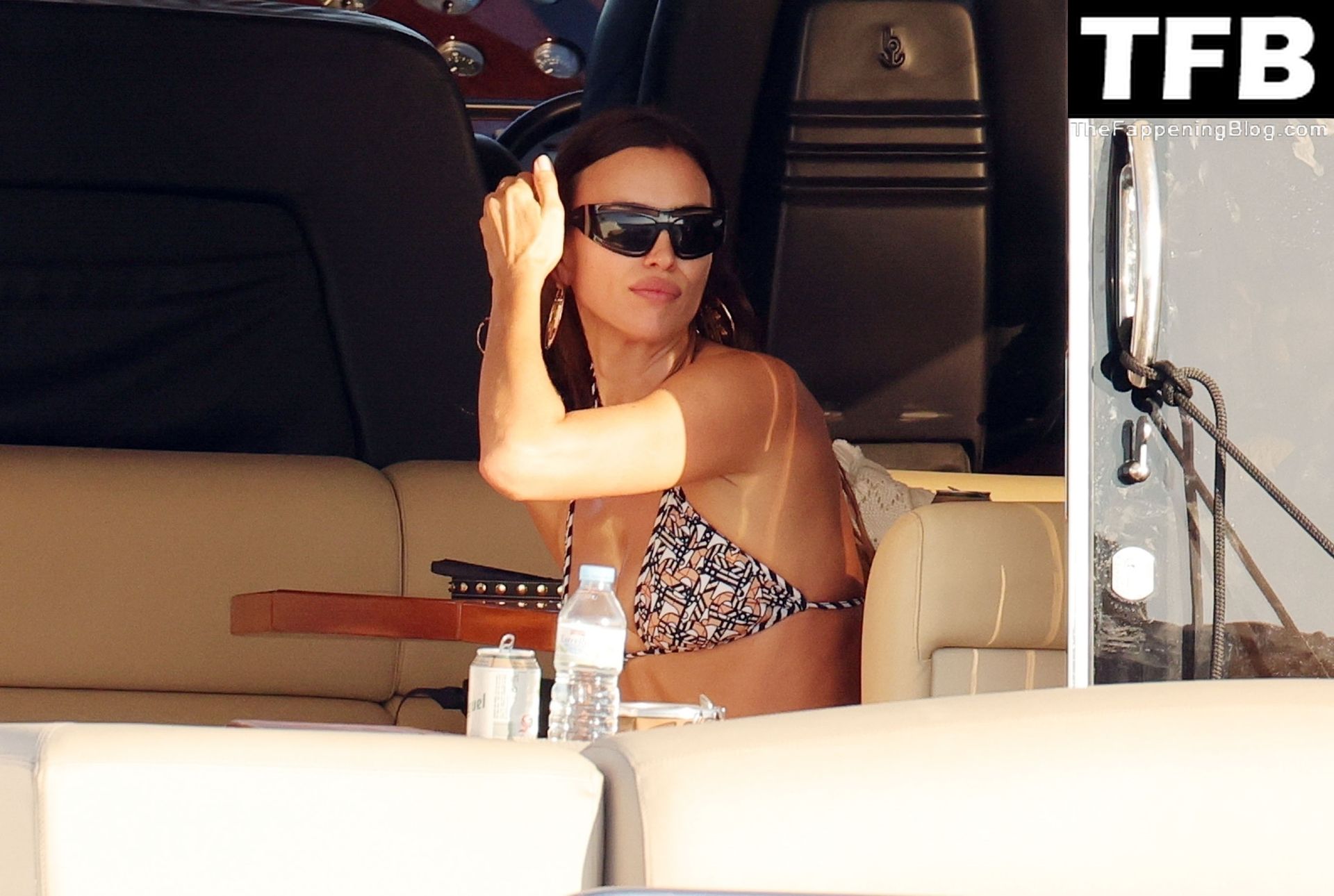A sedutora Irina exibiu sua figura incrivelmente tonificada usando um biquíni de duas peças com padrão de triângulos e completou o visual com óculos de sol pretos oversized e um par de grandes brincos dourados.