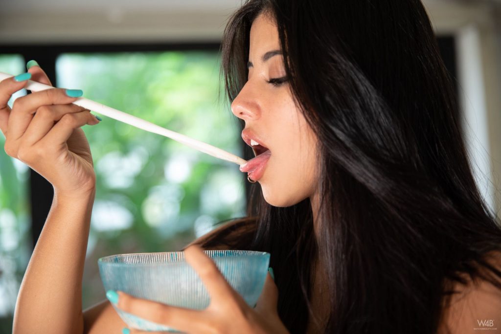 A encantadora modelo Iris Lucky posa nua na cozinha, mas não para preparar o jantar, e sim para tirar lindamente sua lingerie erótica e derramar leite sobre sua gostosa buceta em um novo ensaio fotográfico (2021).