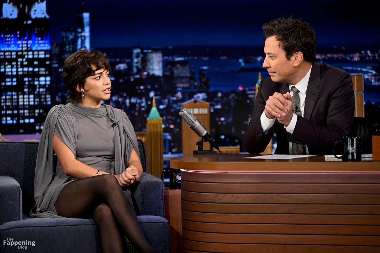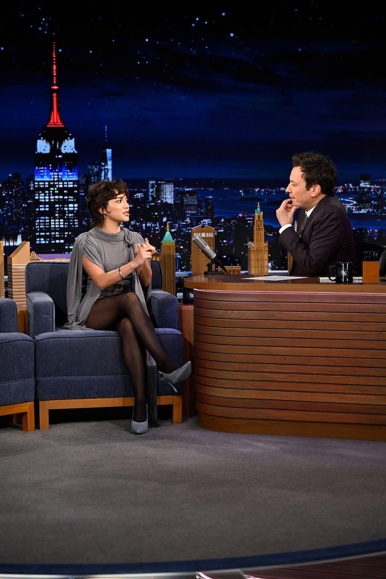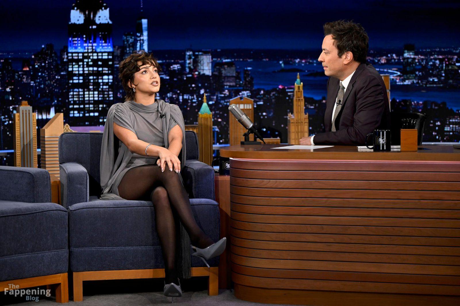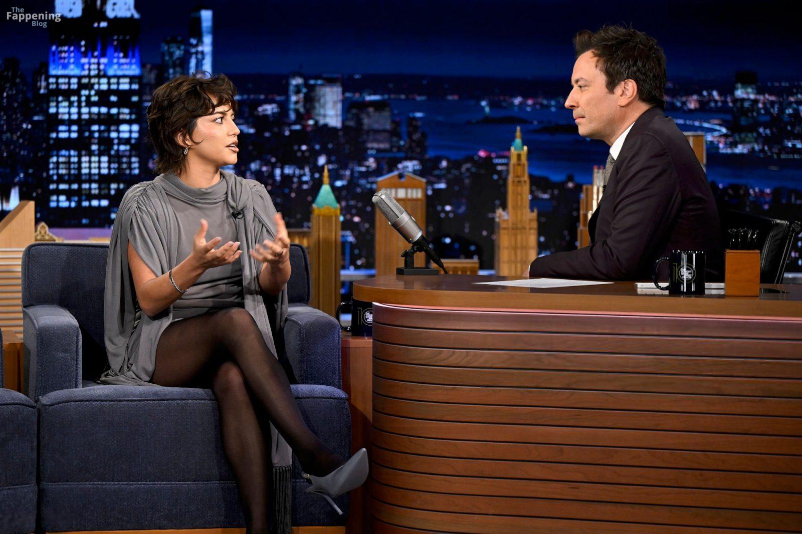 A atriz Isabela Merced exibe suas pernas em meias transparentes e um mini vestido transparente no The Tonight Show com Jimmy Fallon.