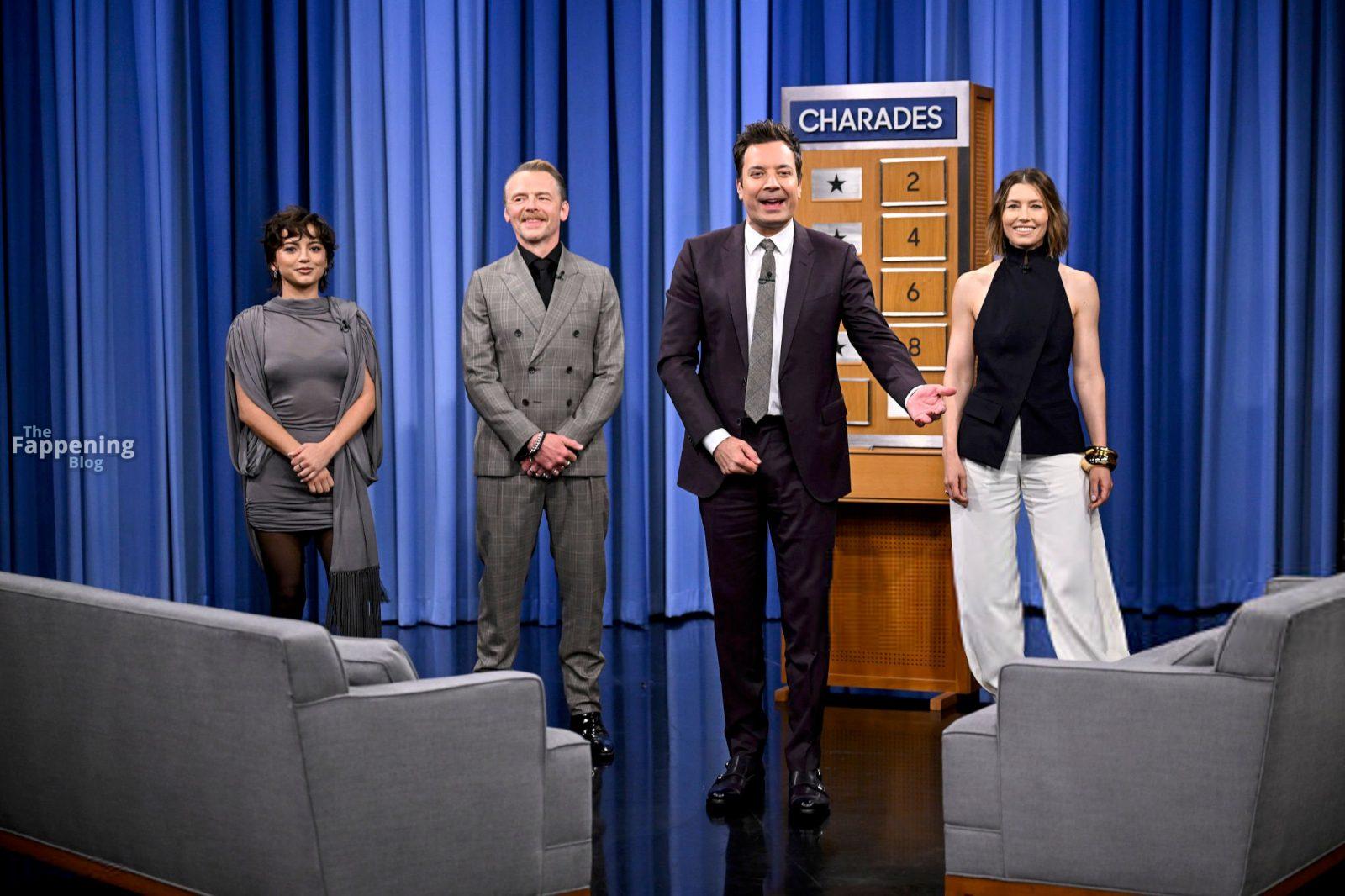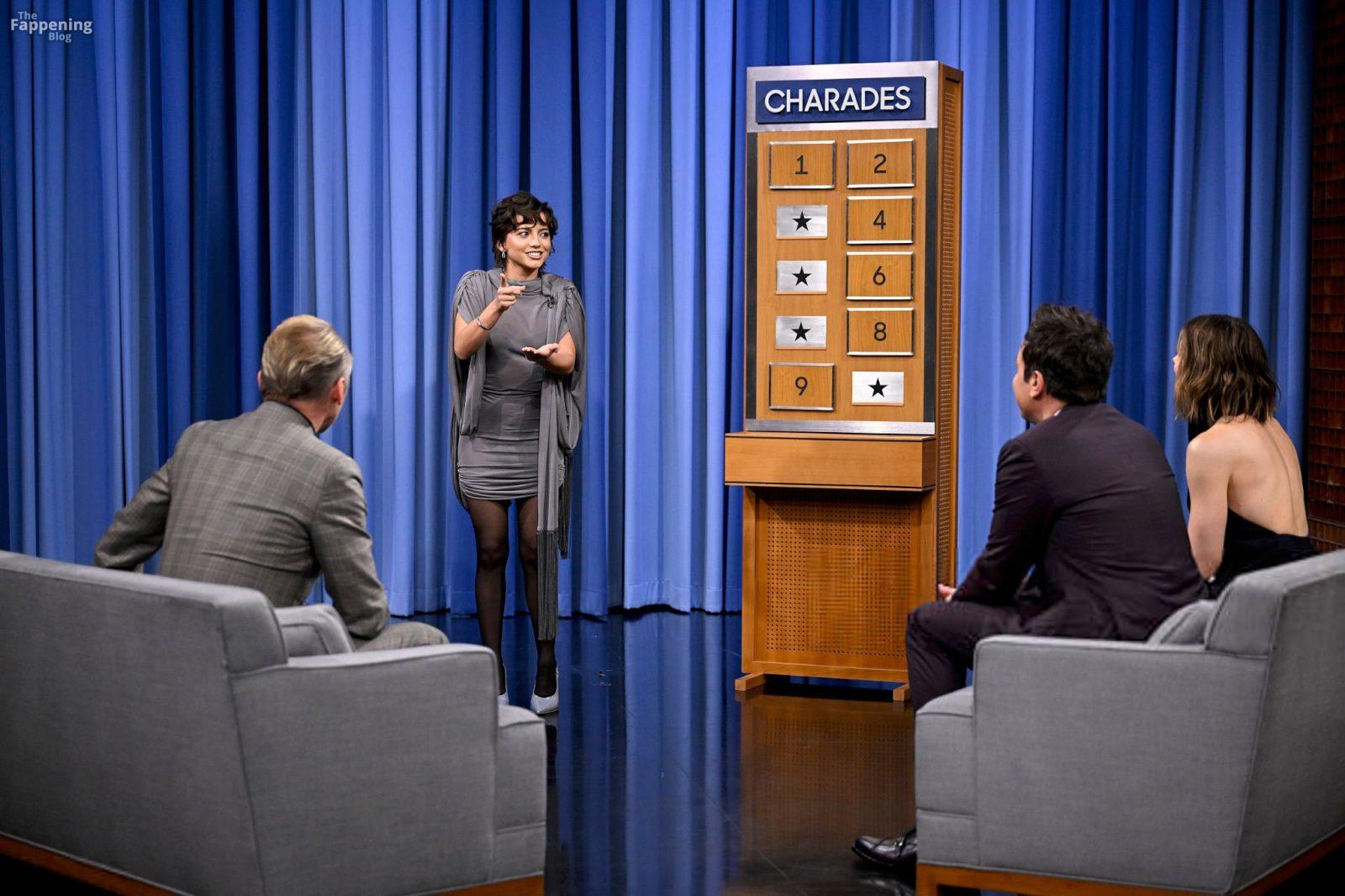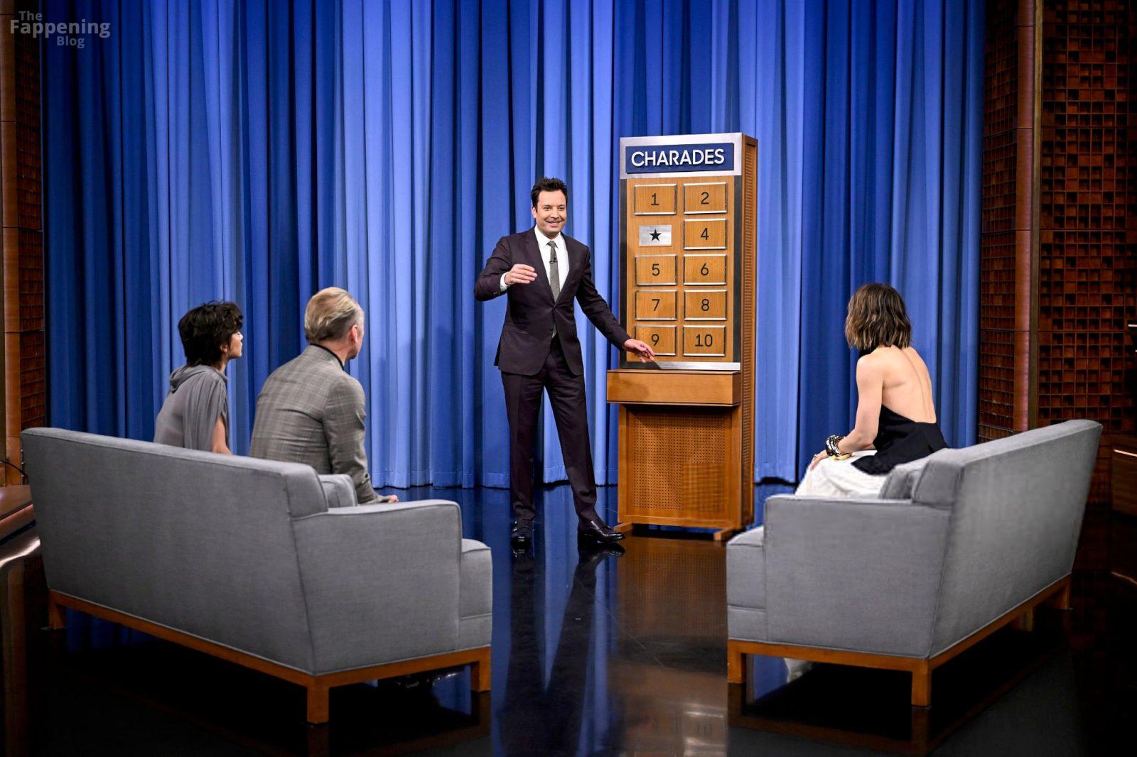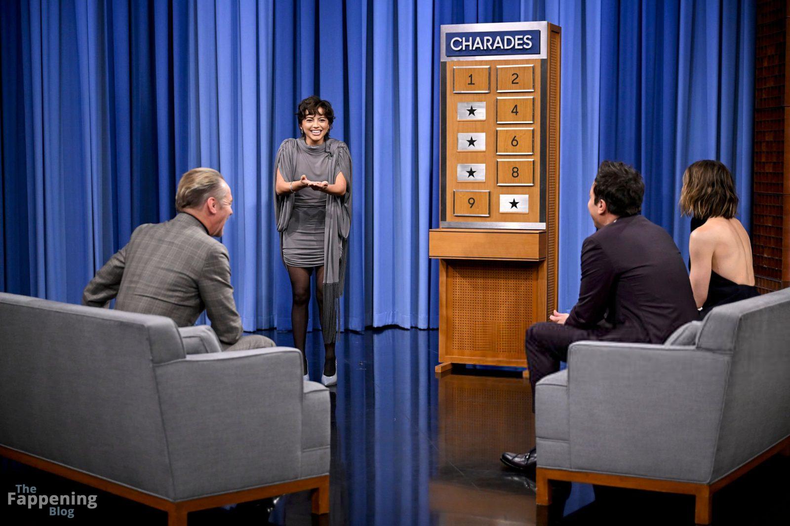 A atriz Isabela Merced exibe suas pernas em meias transparentes e um mini vestido transparente no The Tonight Show com Jimmy Fallon.