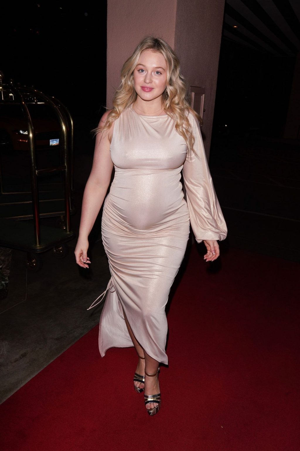Model Iskra Lawrence exibe barriguinha de grávida em vestido bege na pré-festa do Golden Globes em Beverly Hills, 01/04/2020.