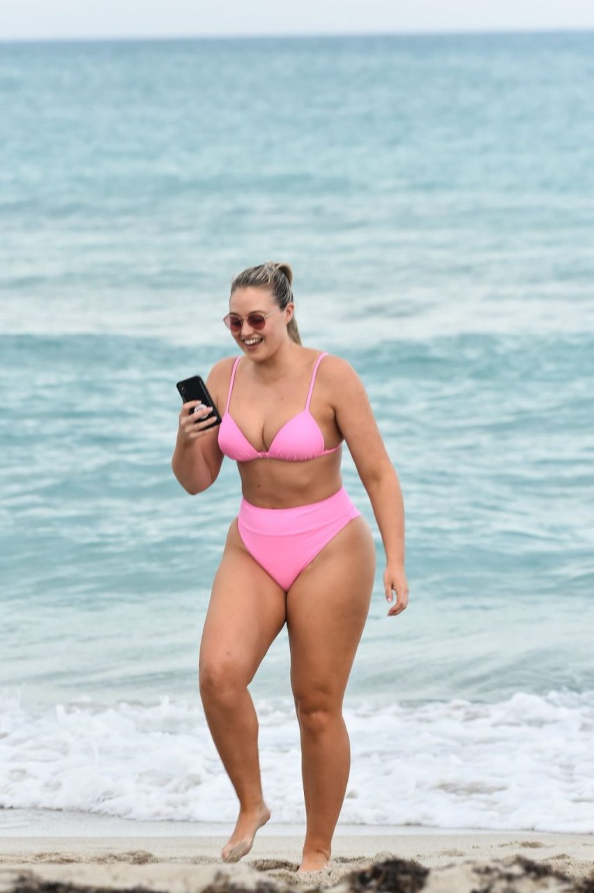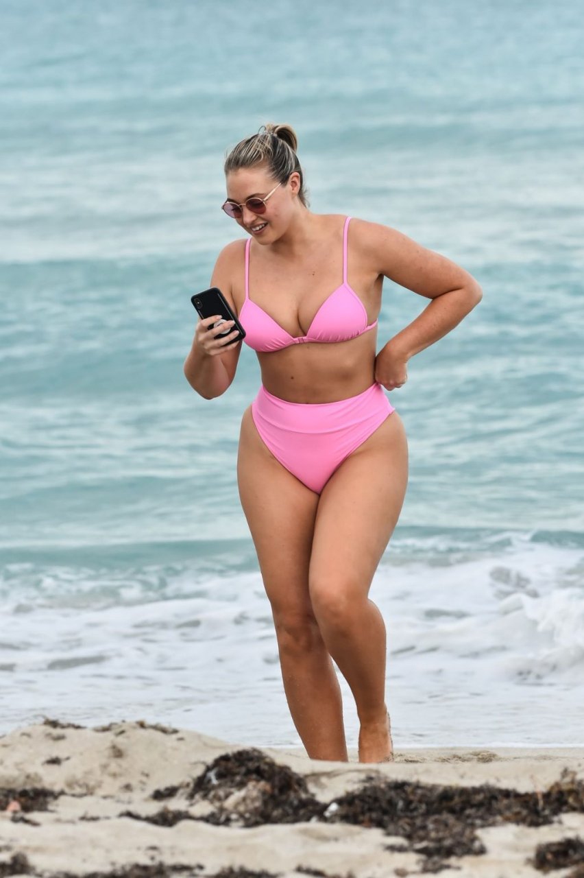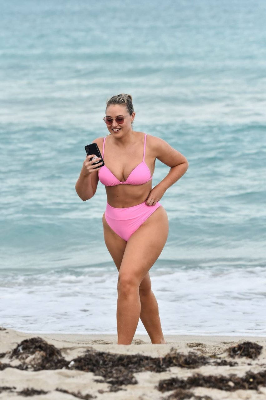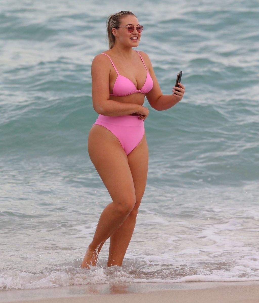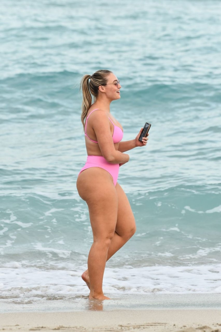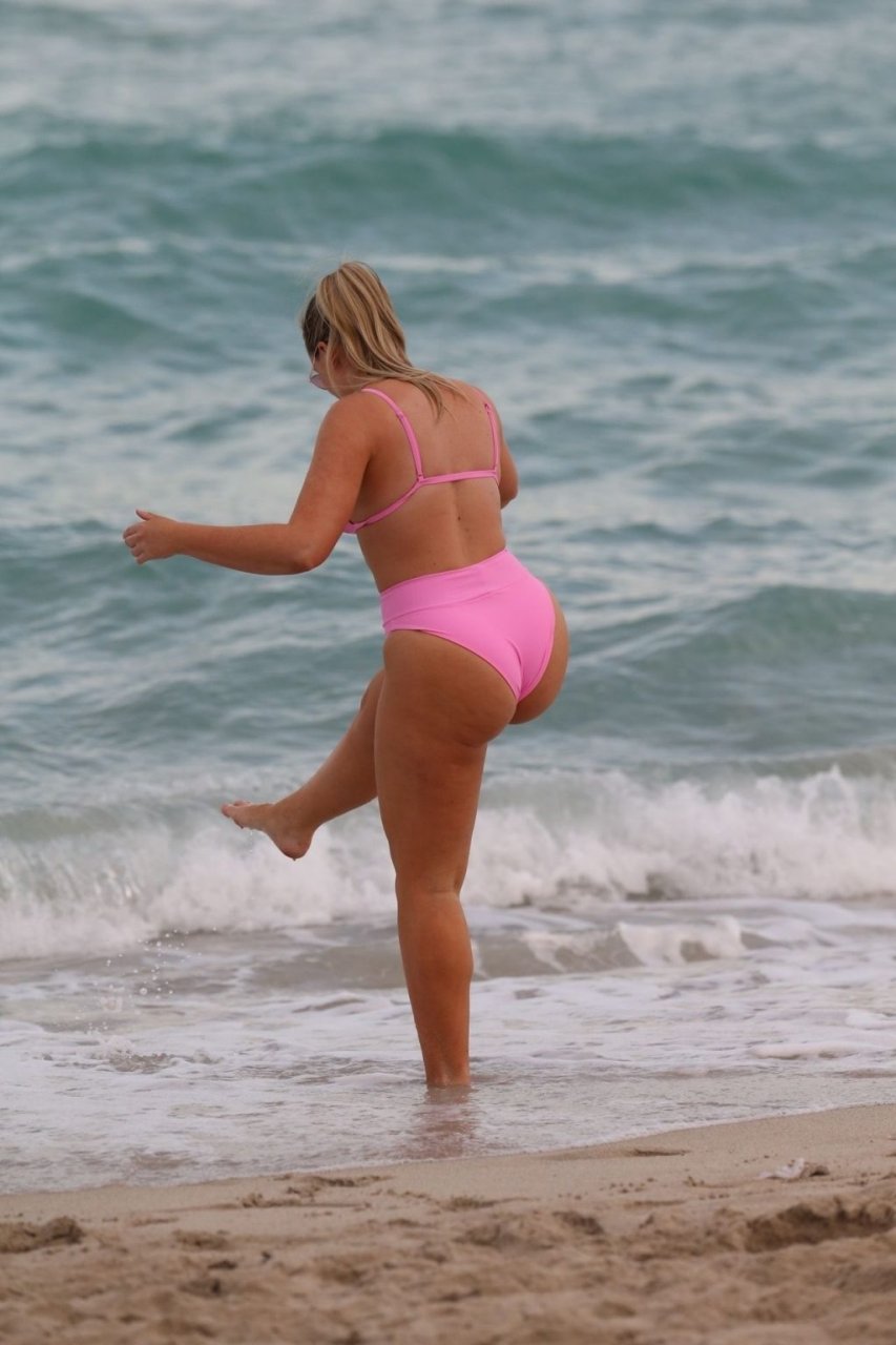 Model Iskra Lawrence exibe suas curvas na praia com um biquíni rosa em Miami, 12/09/2018. Iskra está ótima enquanto aproveita seu dia na praia.