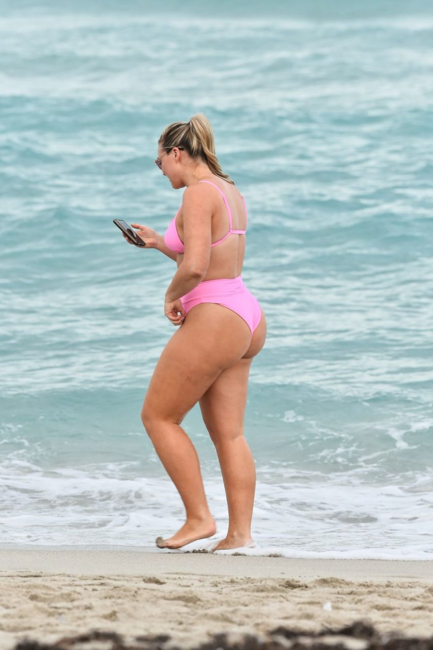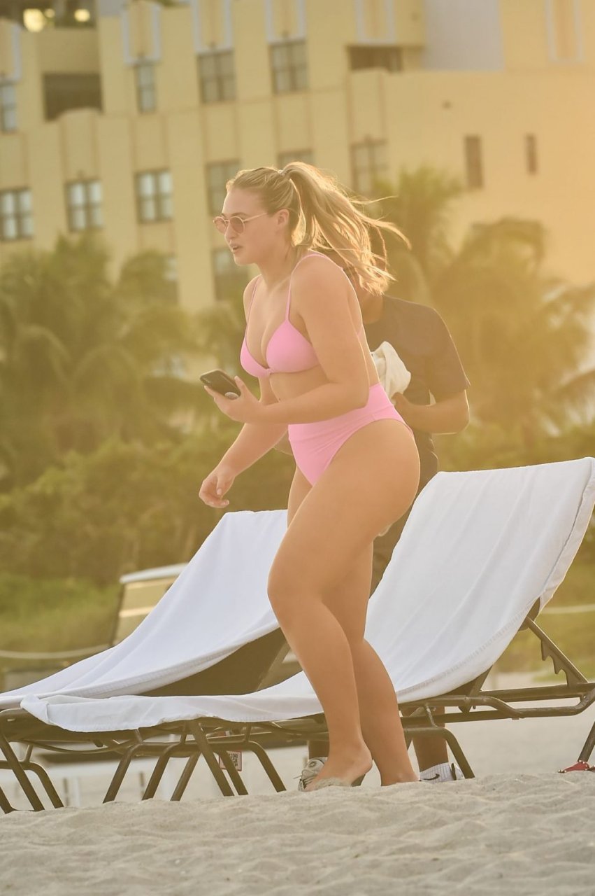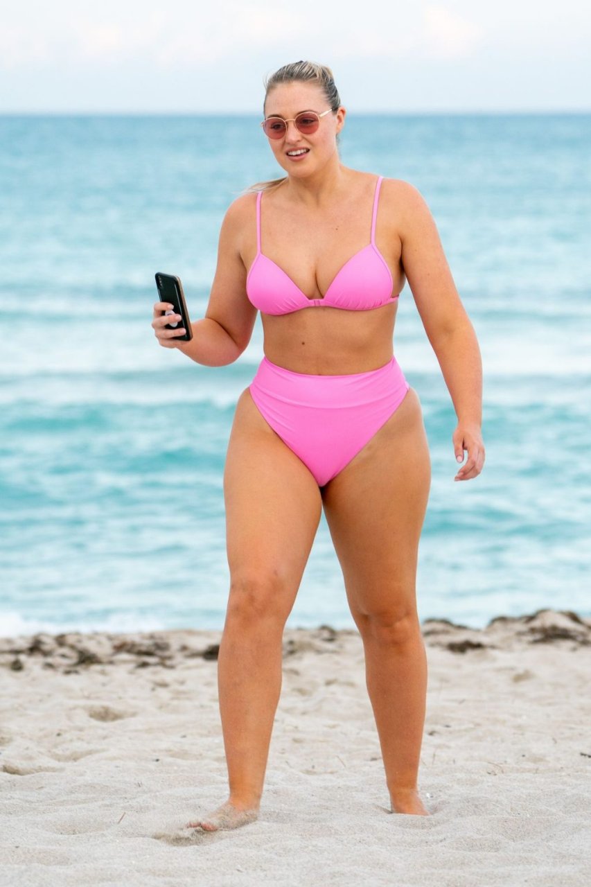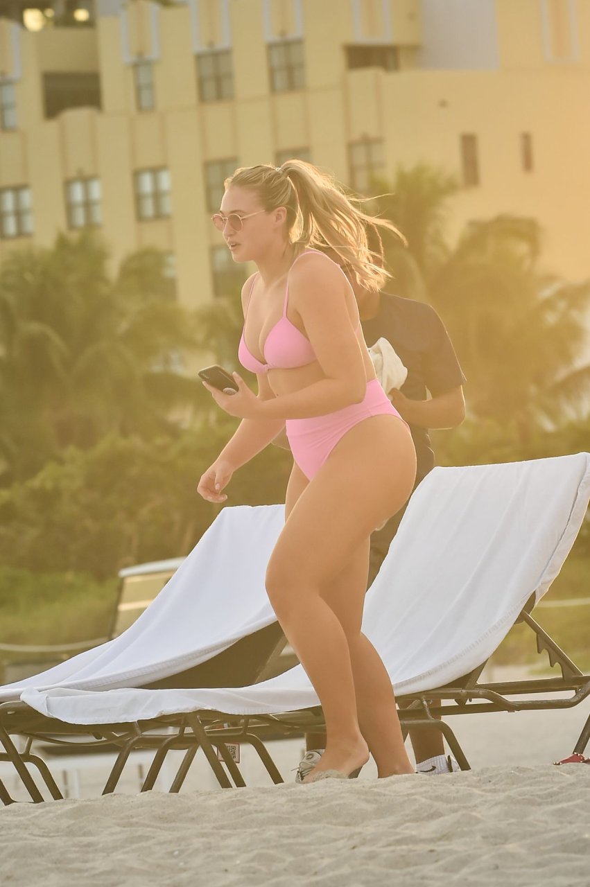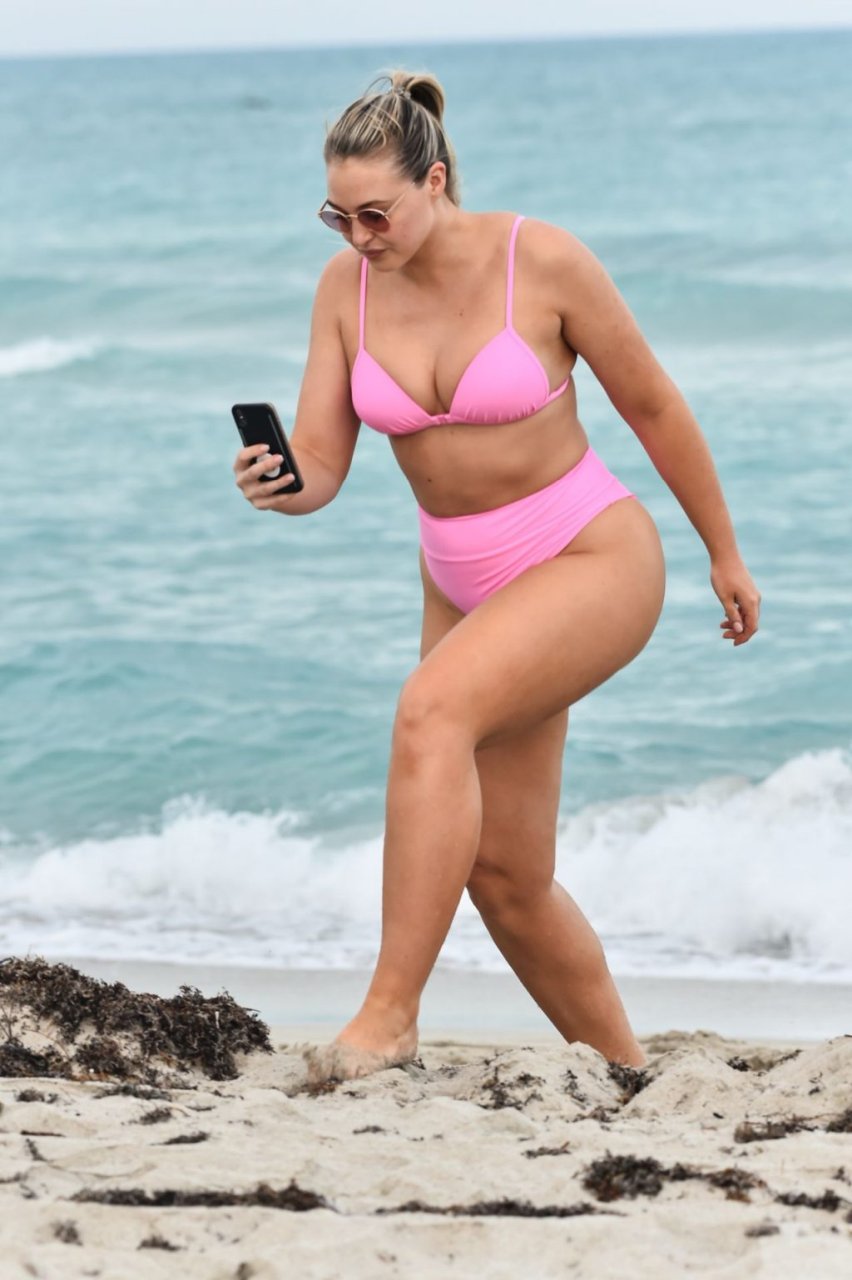 Model Iskra Lawrence exibe suas curvas na praia com um biquíni rosa em Miami, 12/09/2018. Iskra está ótima enquanto aproveita seu dia na praia.