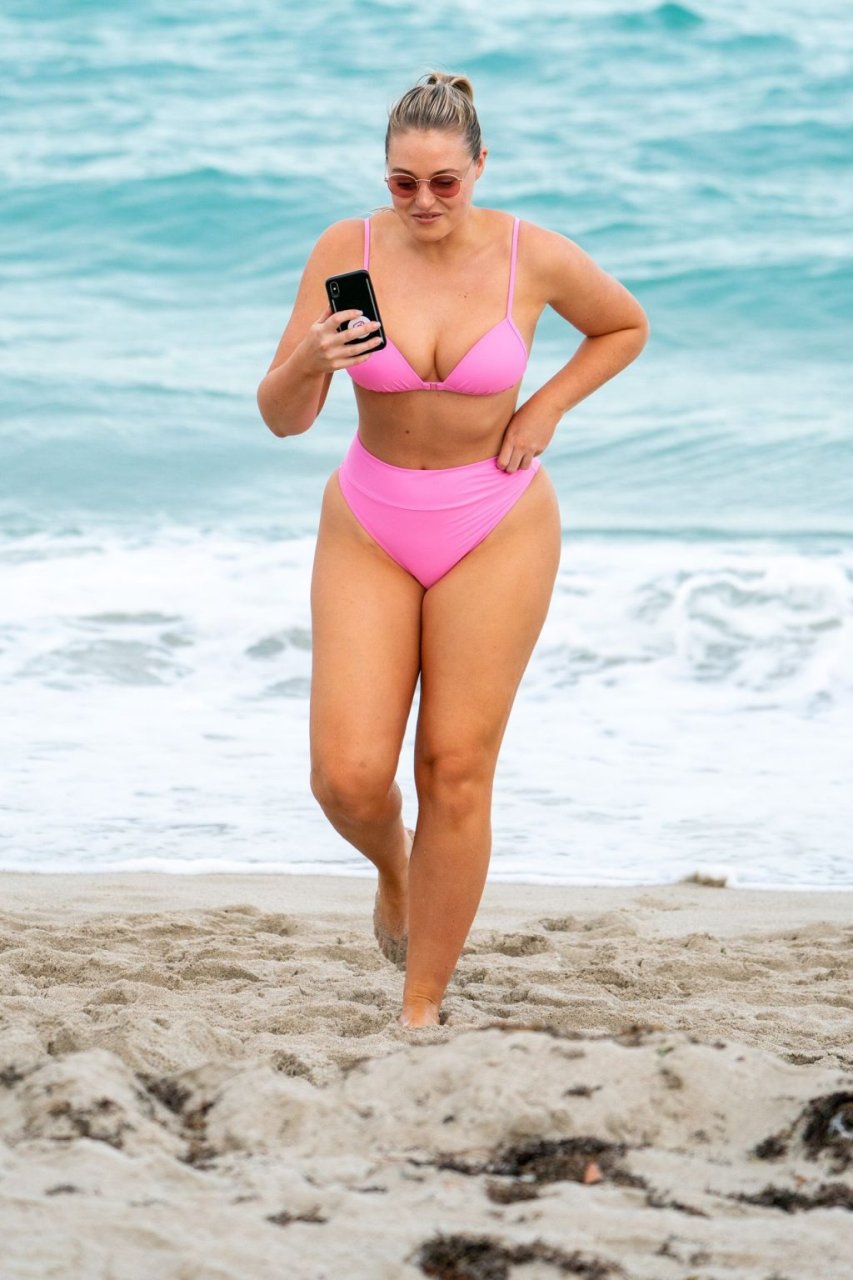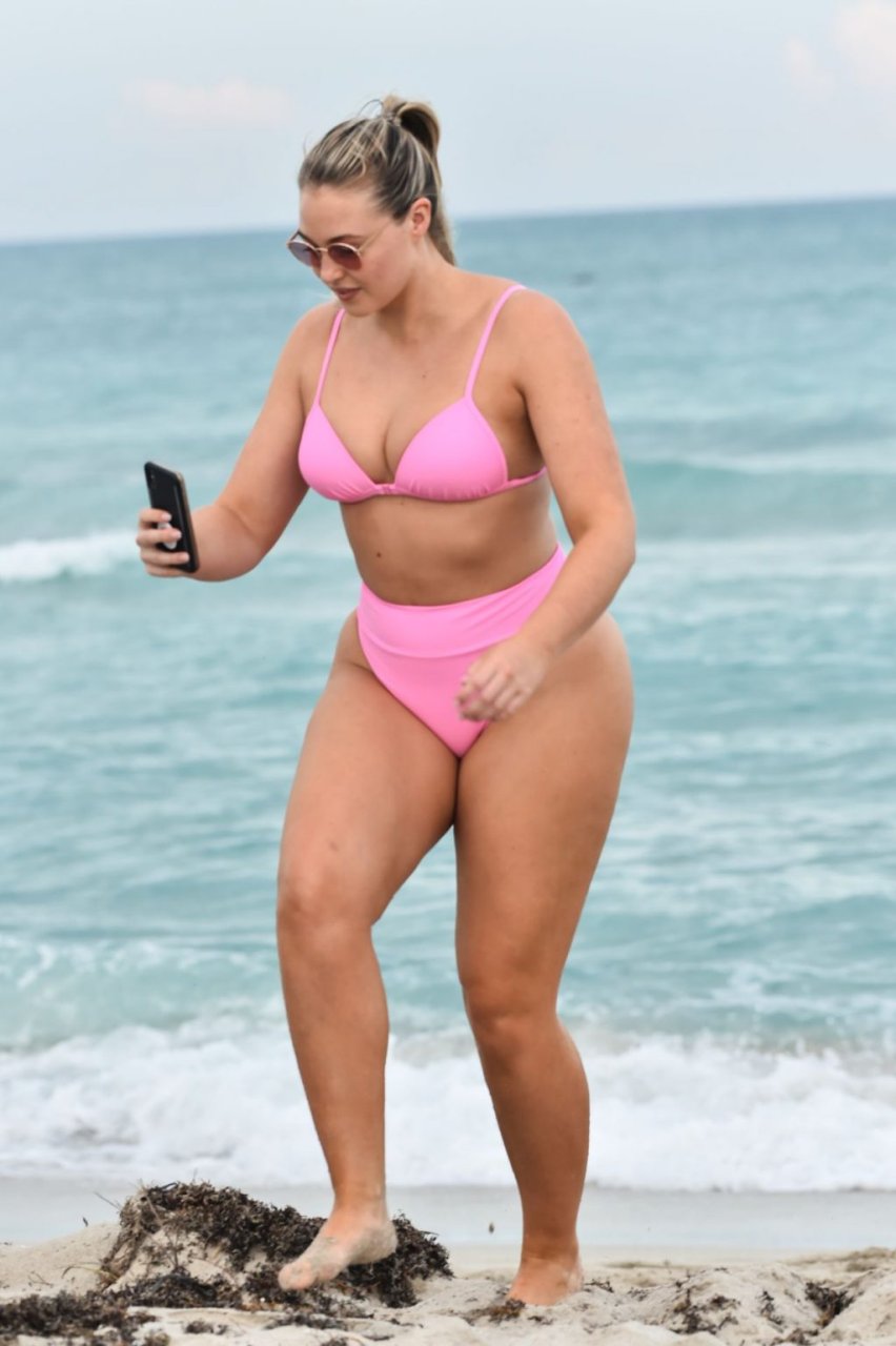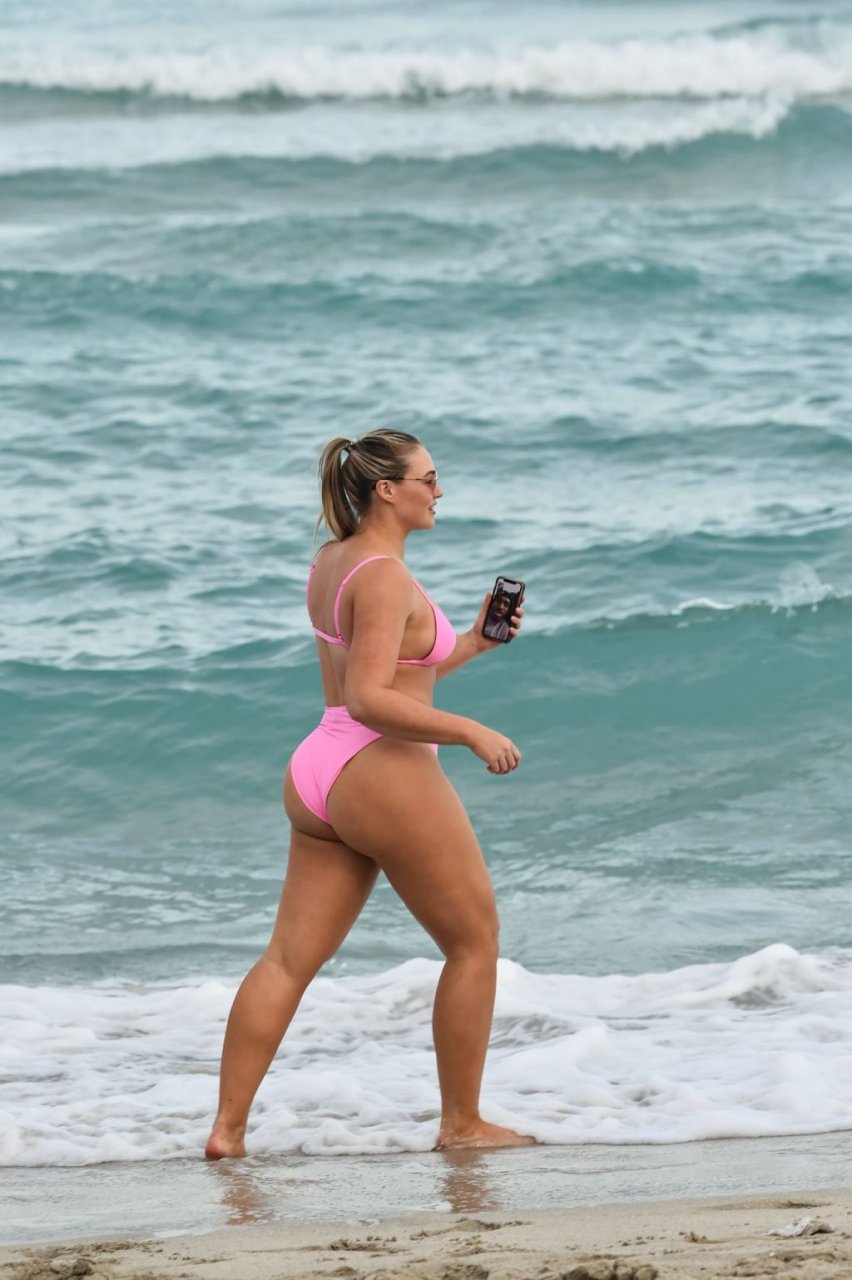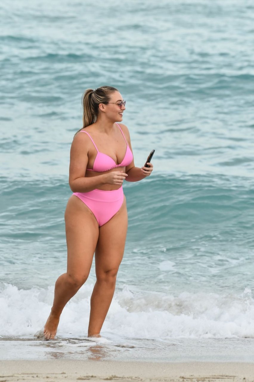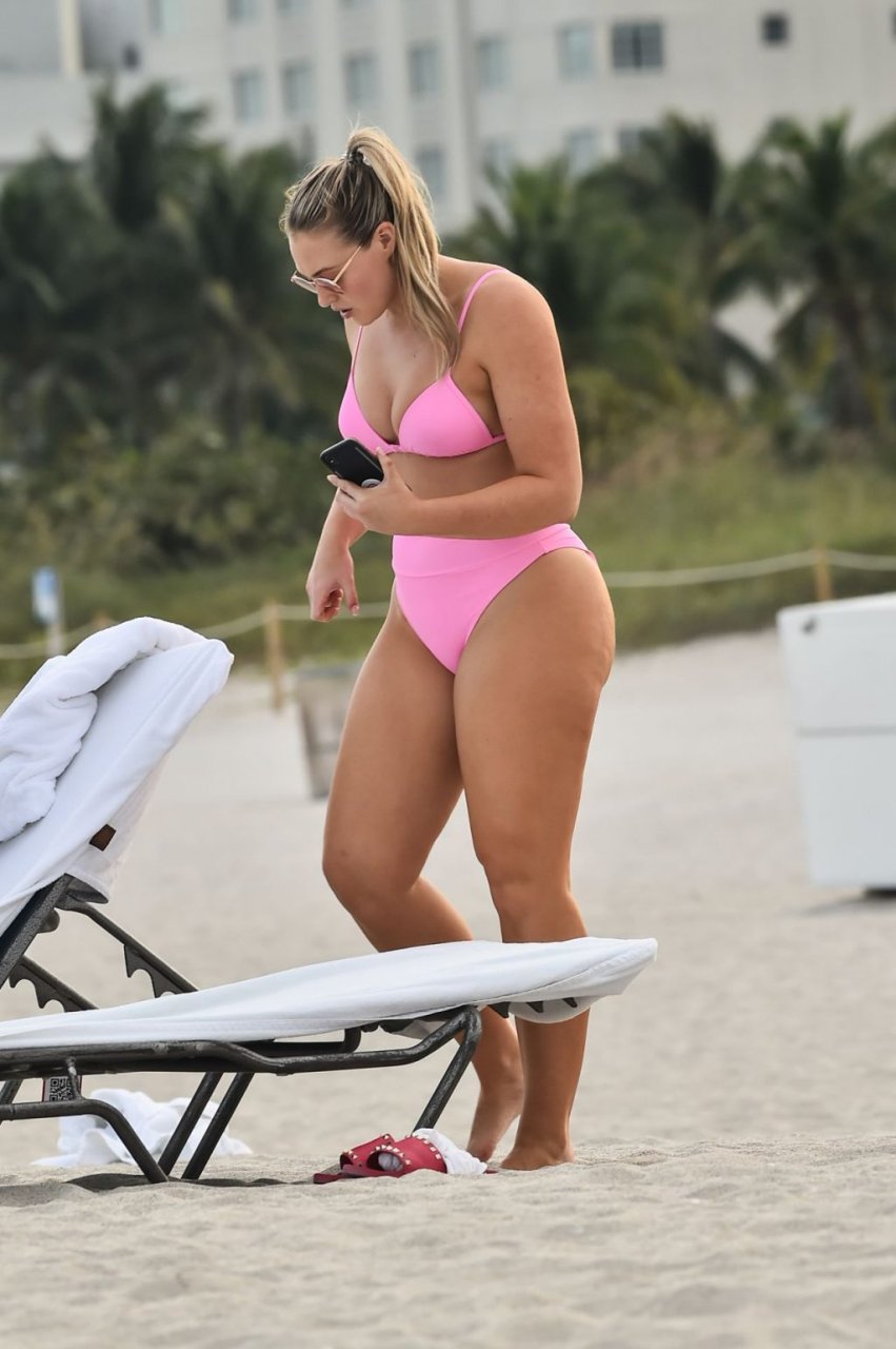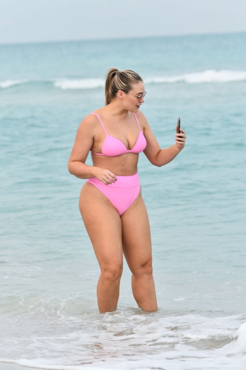 Model Iskra Lawrence exibe suas curvas na praia com um biquíni rosa em Miami, 12/09/2018. Iskra está ótima enquanto aproveita seu dia na praia.