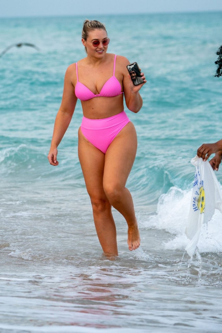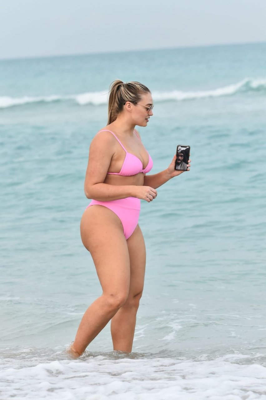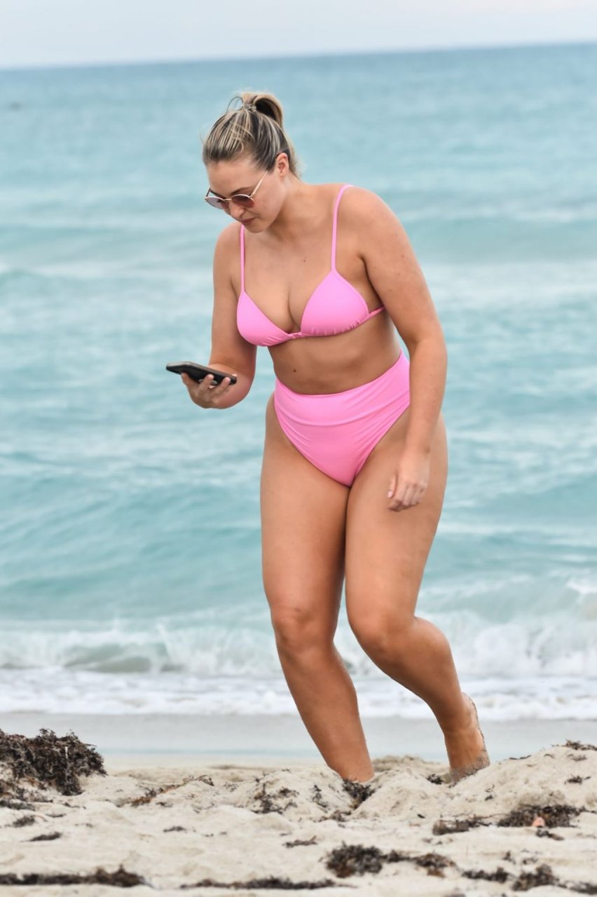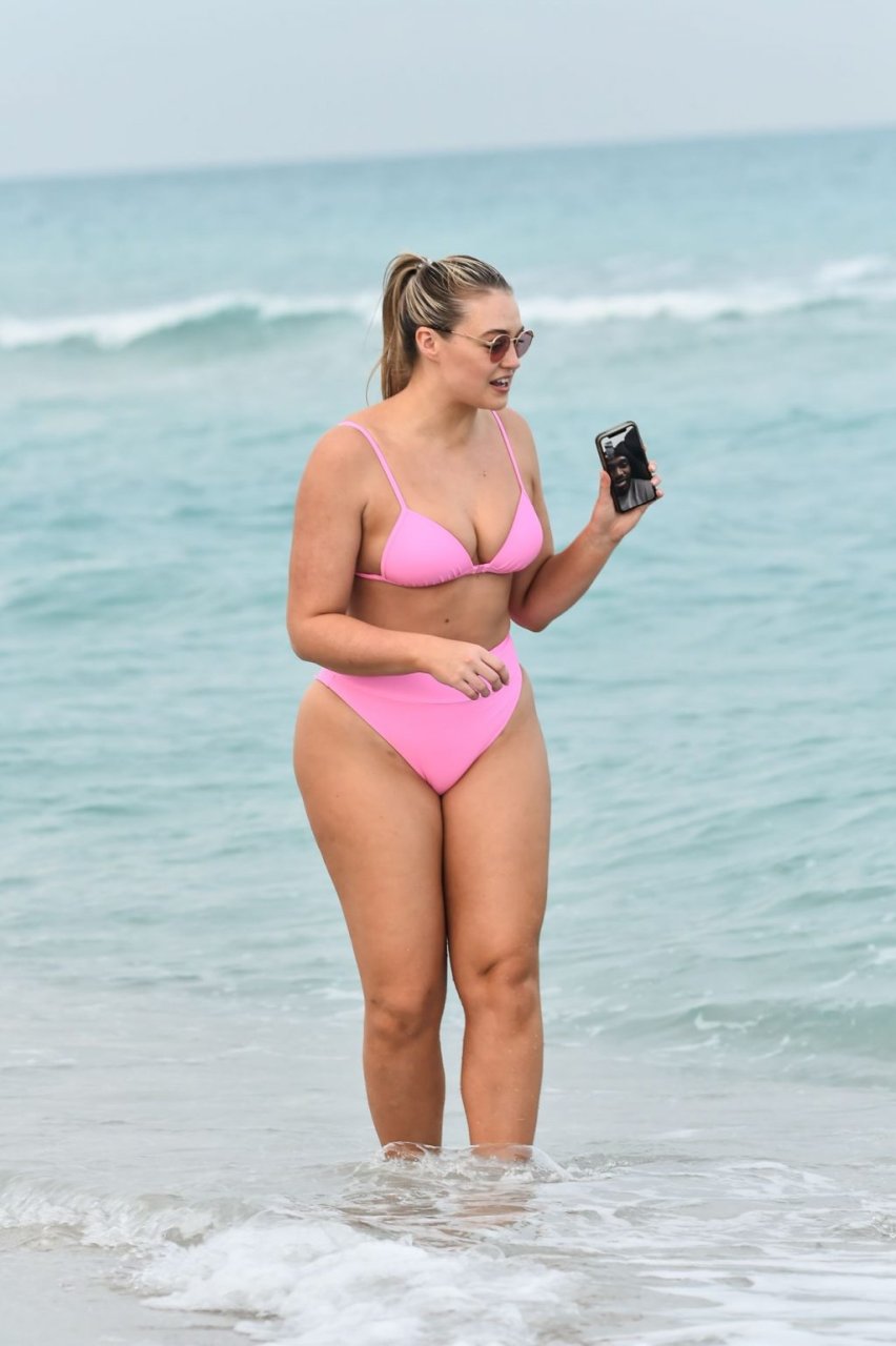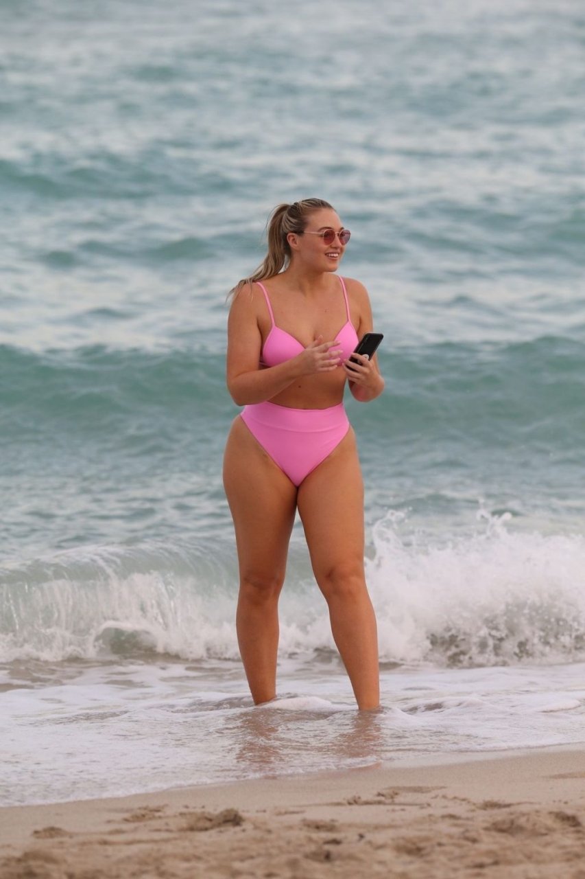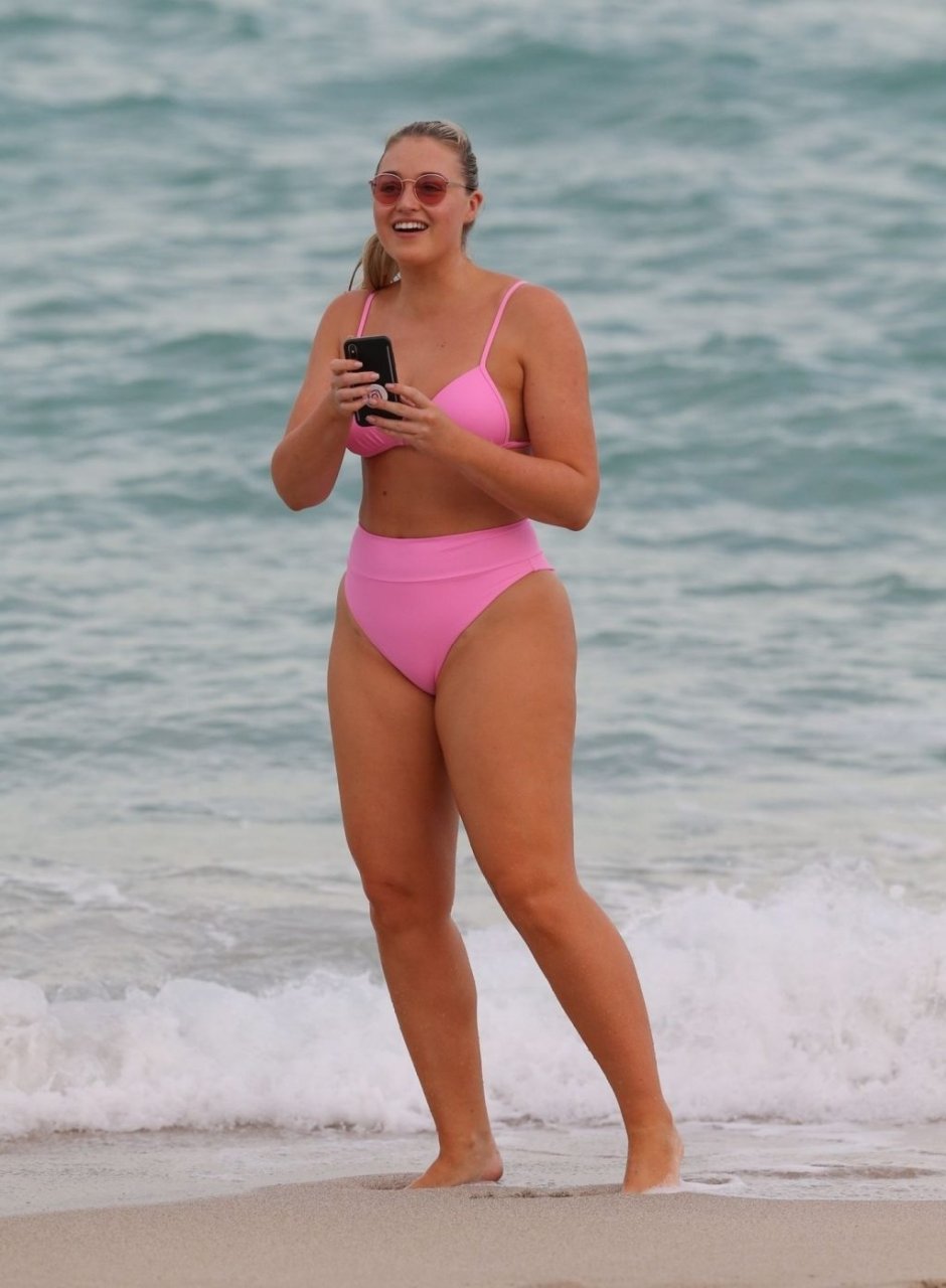 Model Iskra Lawrence exibe suas curvas na praia com um biquíni rosa em Miami, 12/09/2018. Iskra está ótima enquanto aproveita seu dia na praia.
