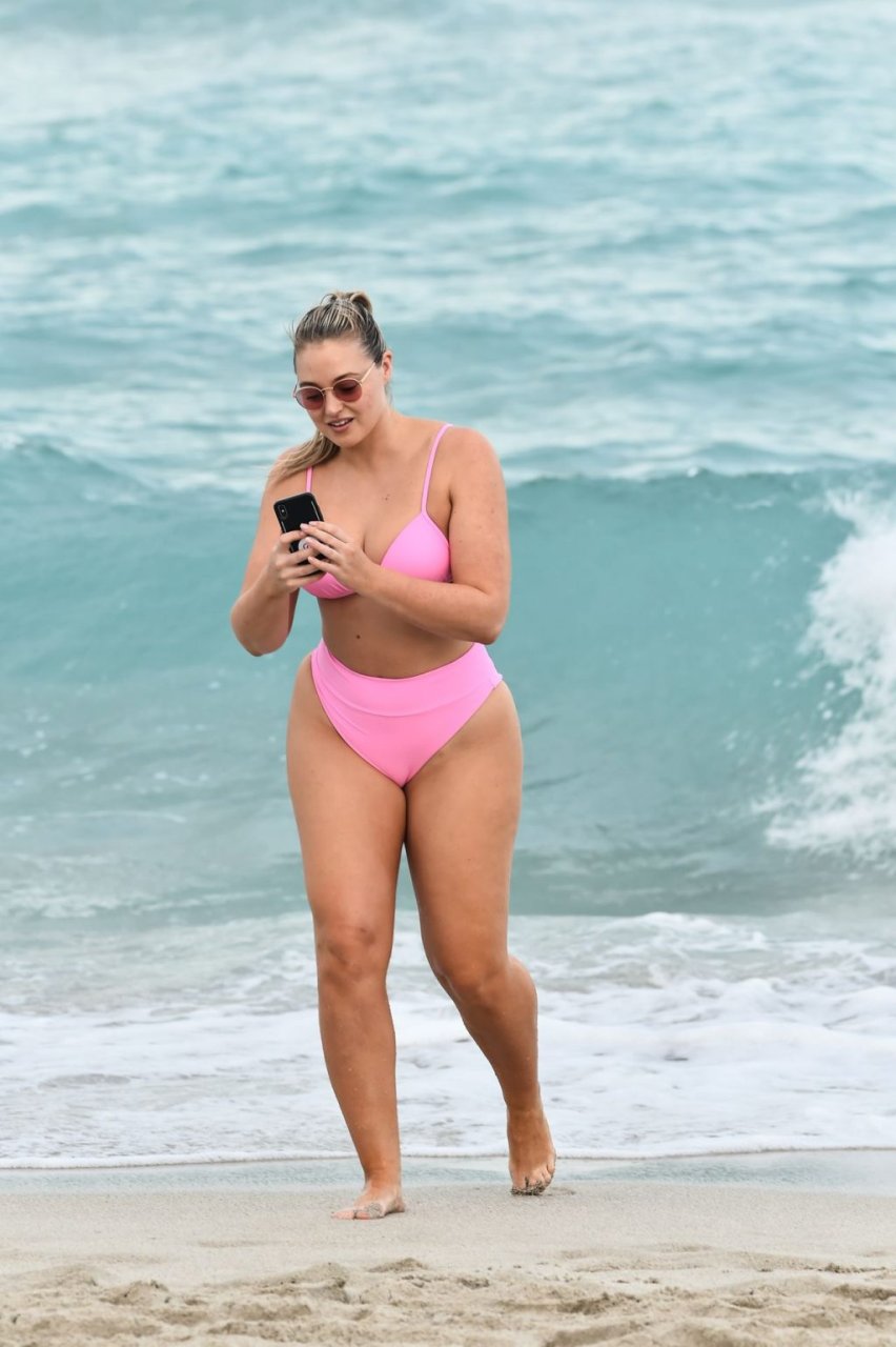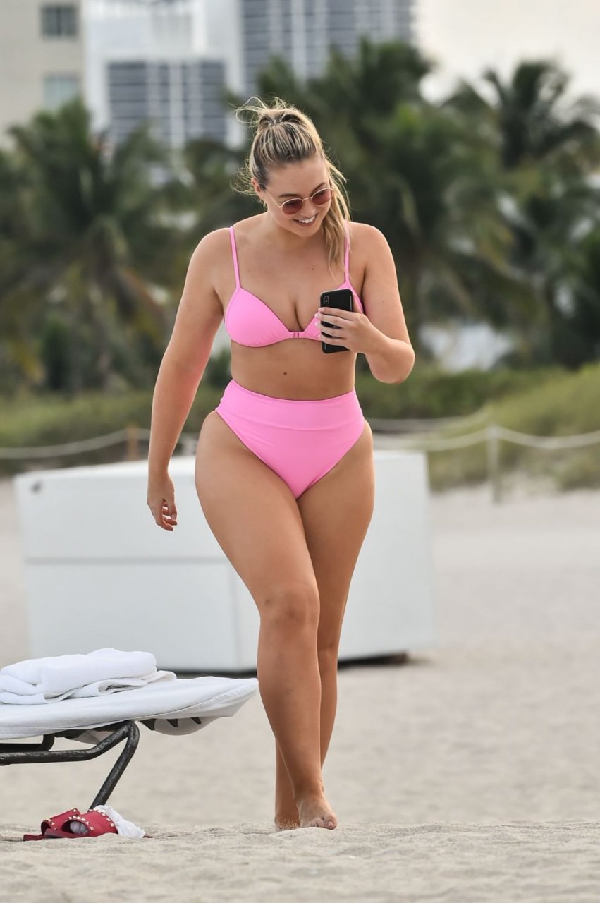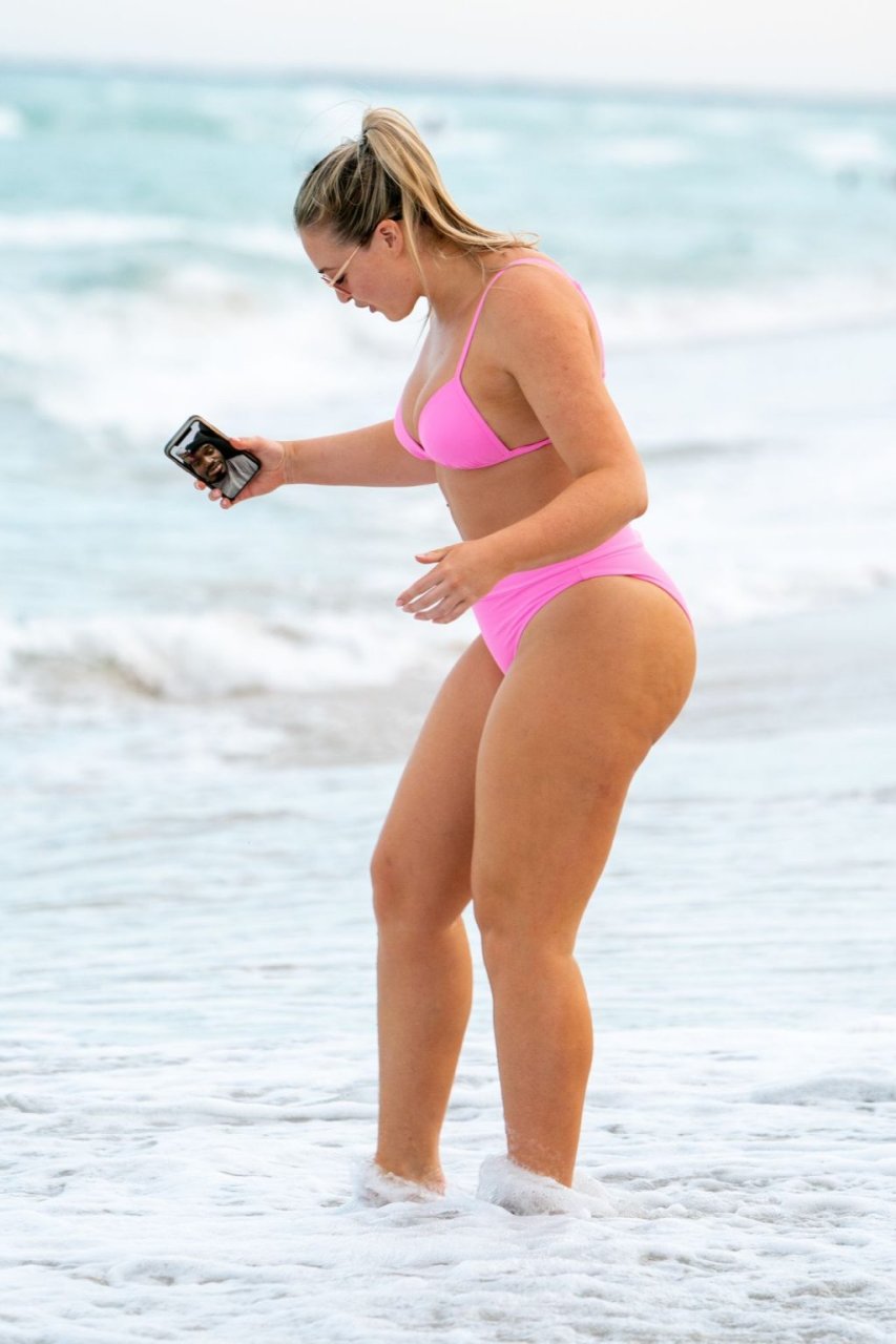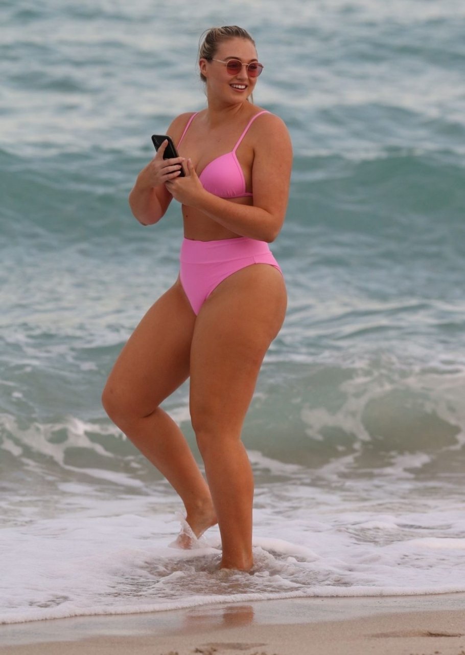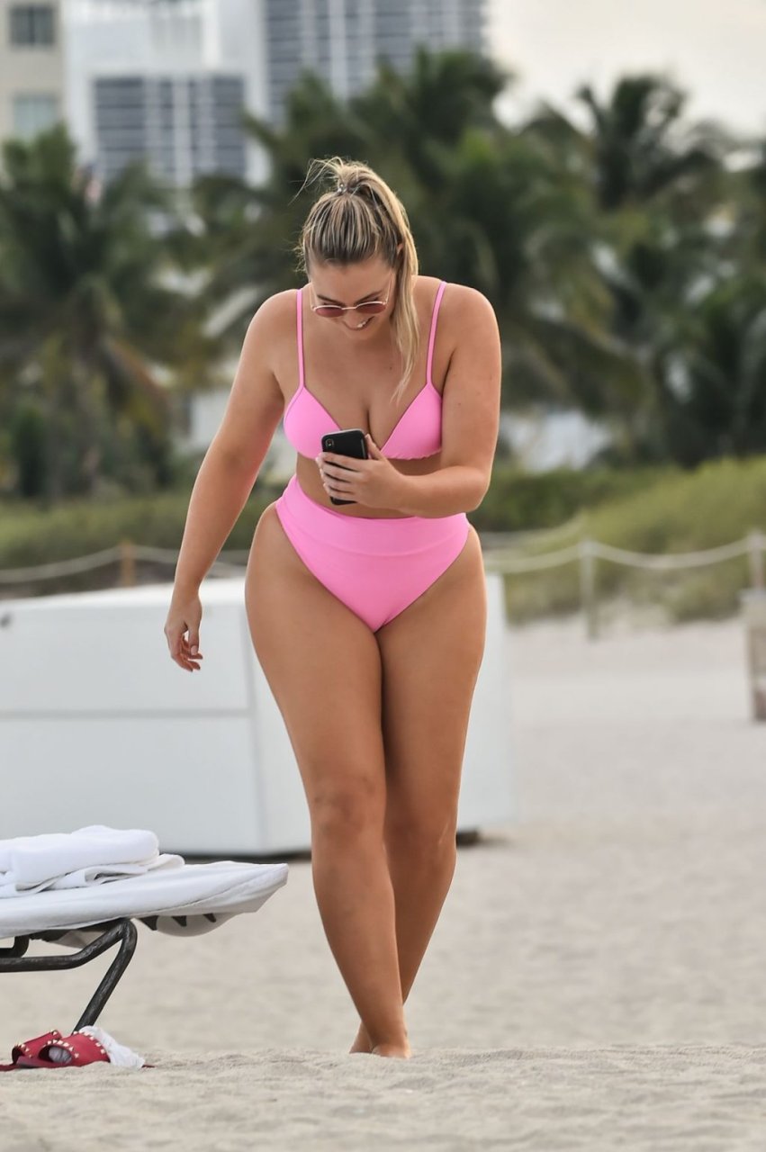 Model Iskra Lawrence exibe suas curvas na praia com um biquíni rosa em Miami, 12/09/2018. Iskra está ótima enquanto aproveita seu dia na praia.