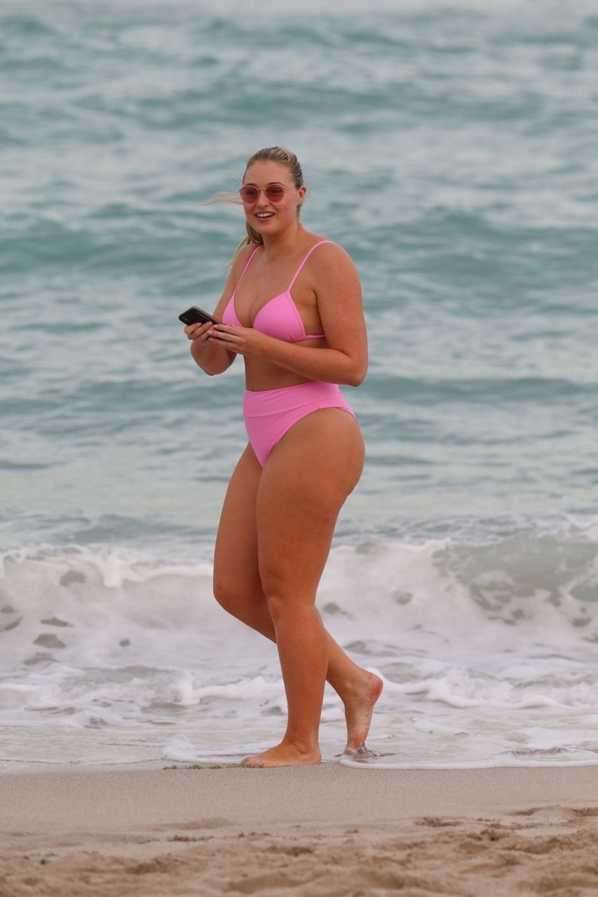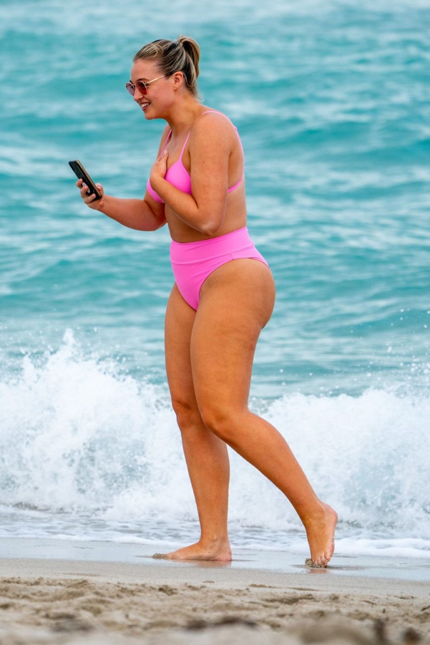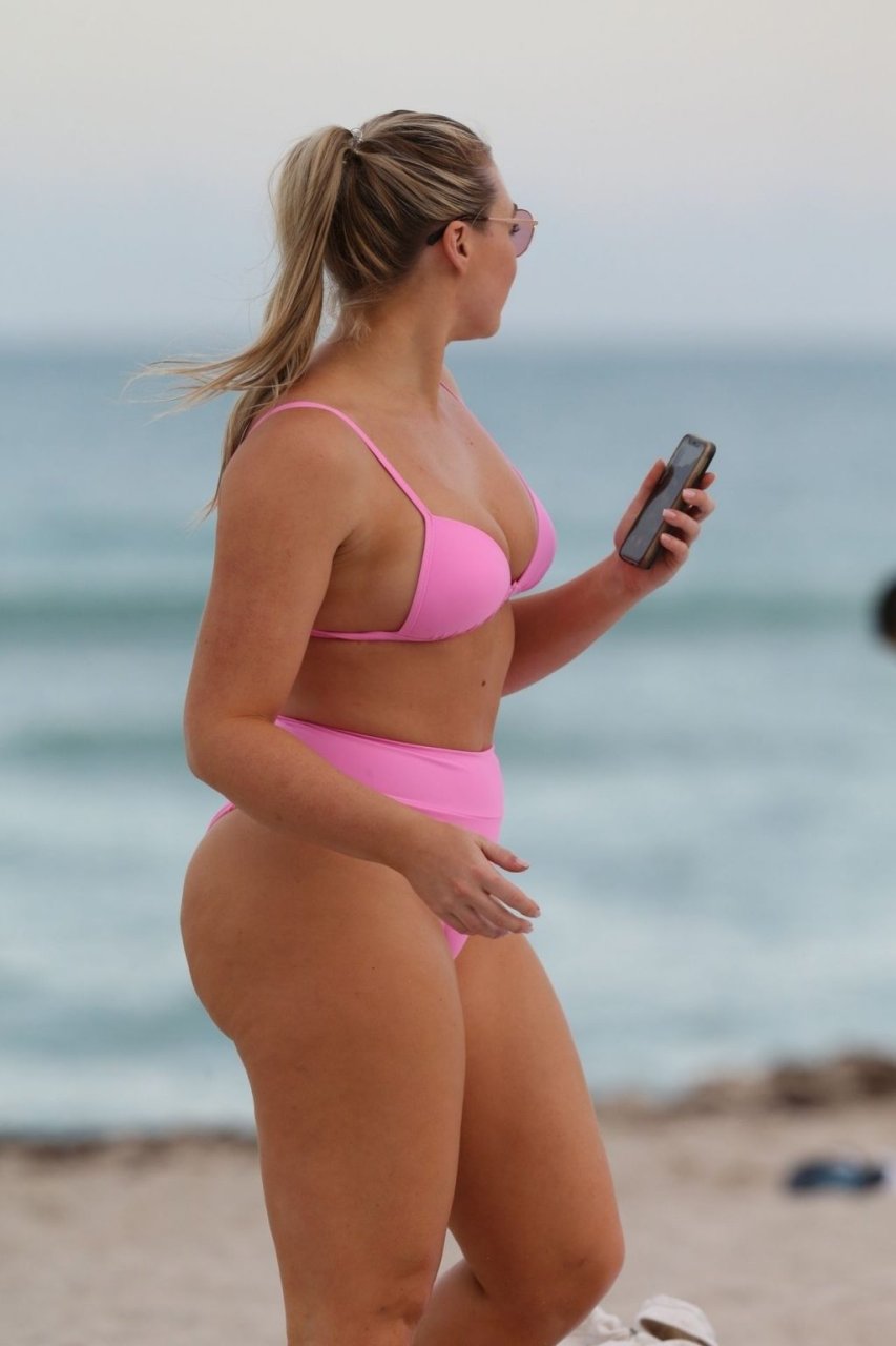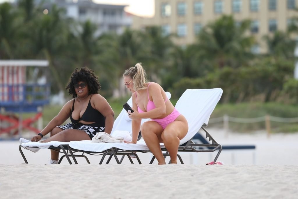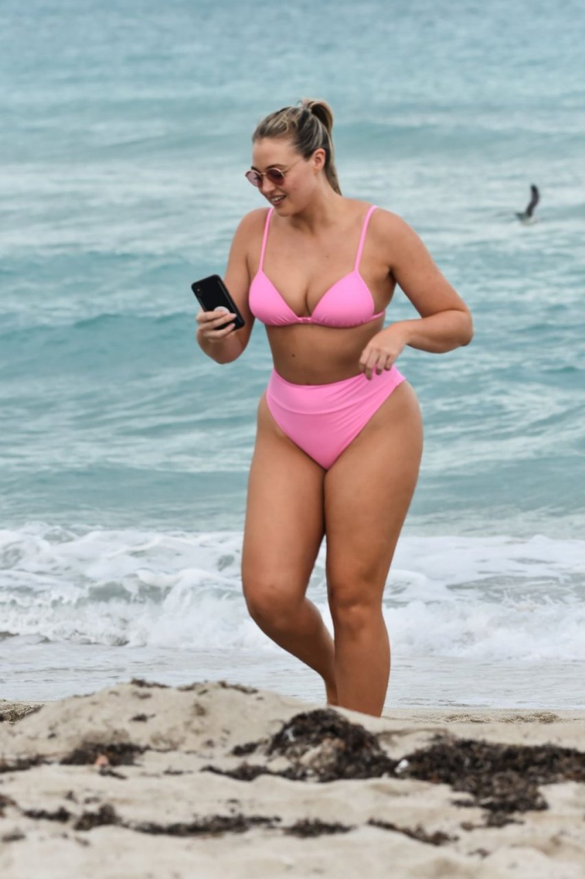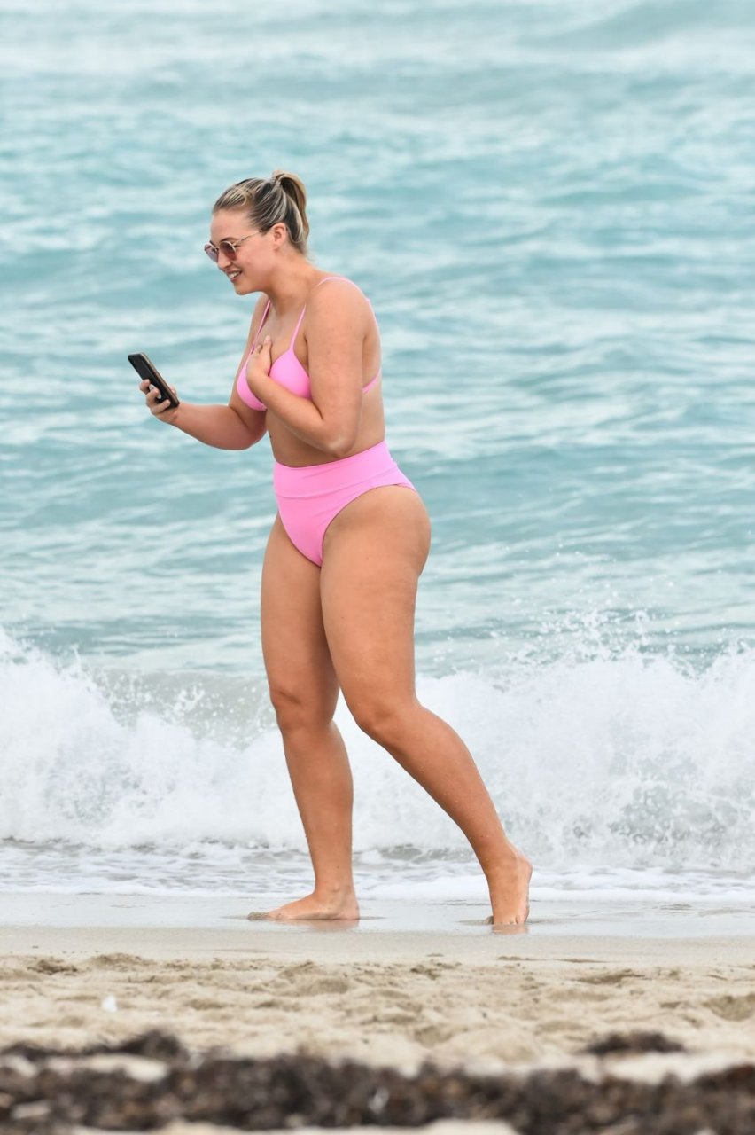 Model Iskra Lawrence exibe suas curvas na praia com um biquíni rosa em Miami, 12/09/2018. Iskra está ótima enquanto aproveita seu dia na praia.