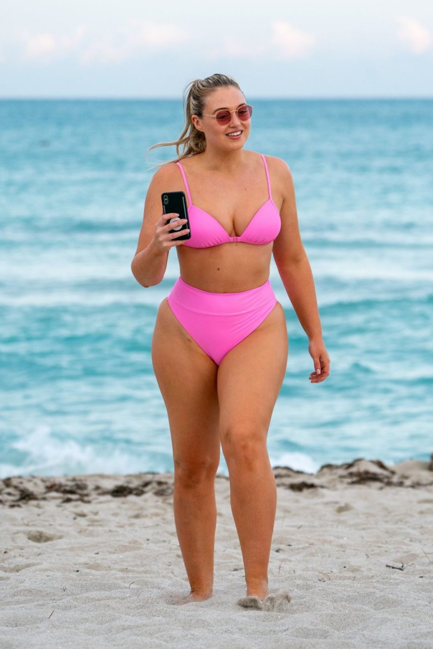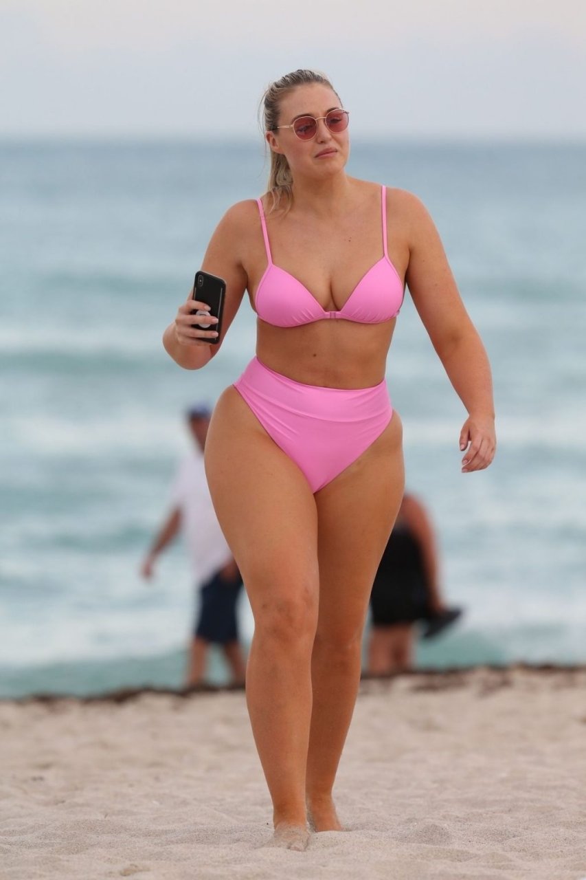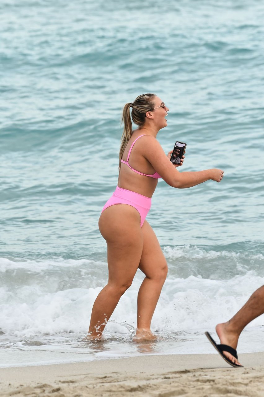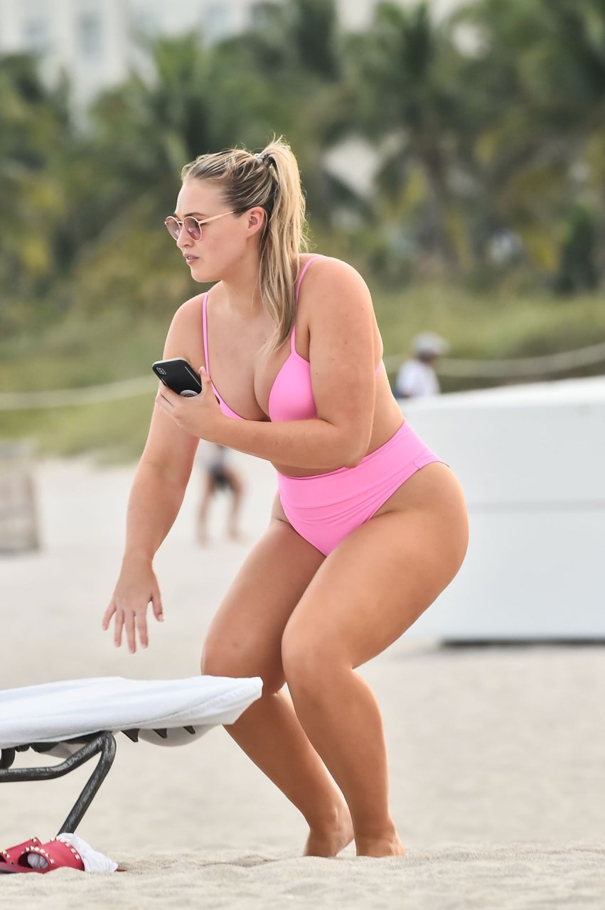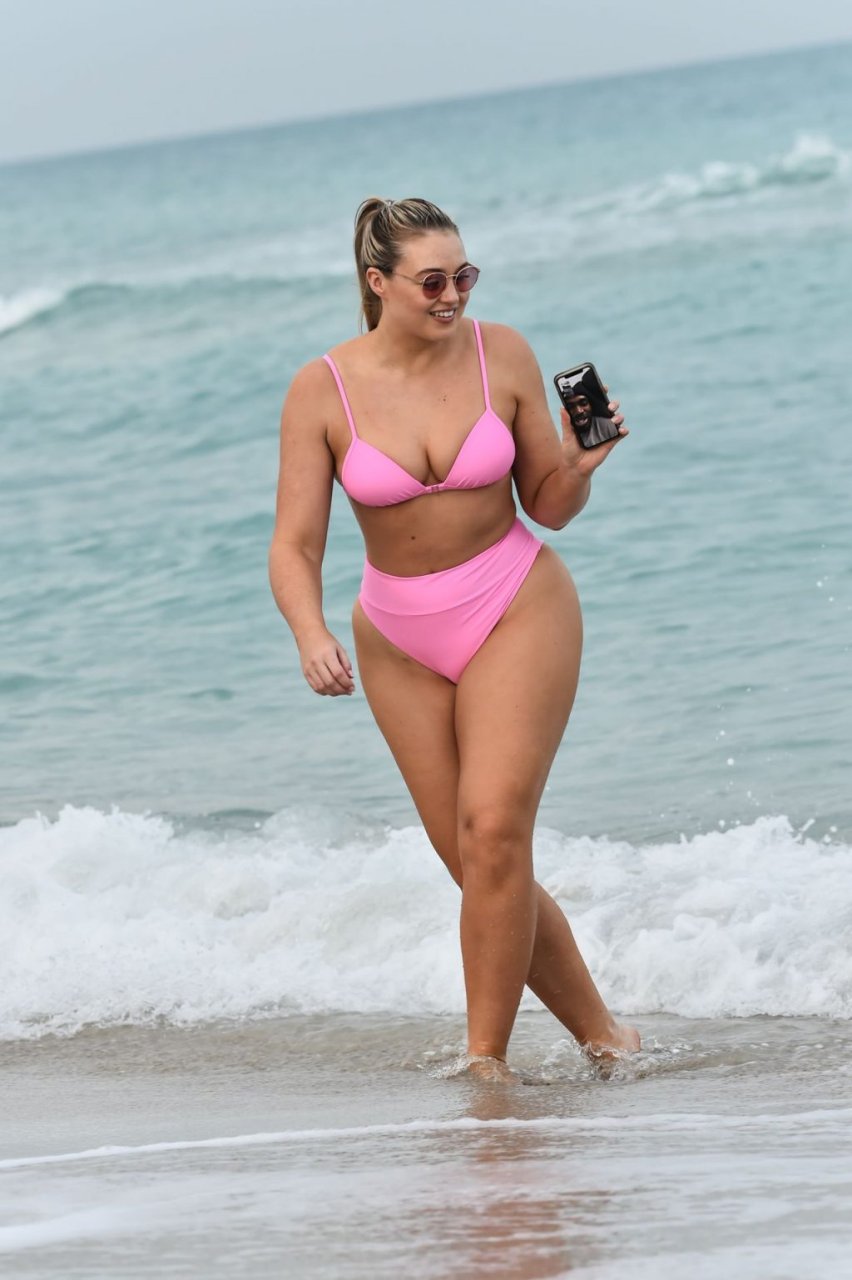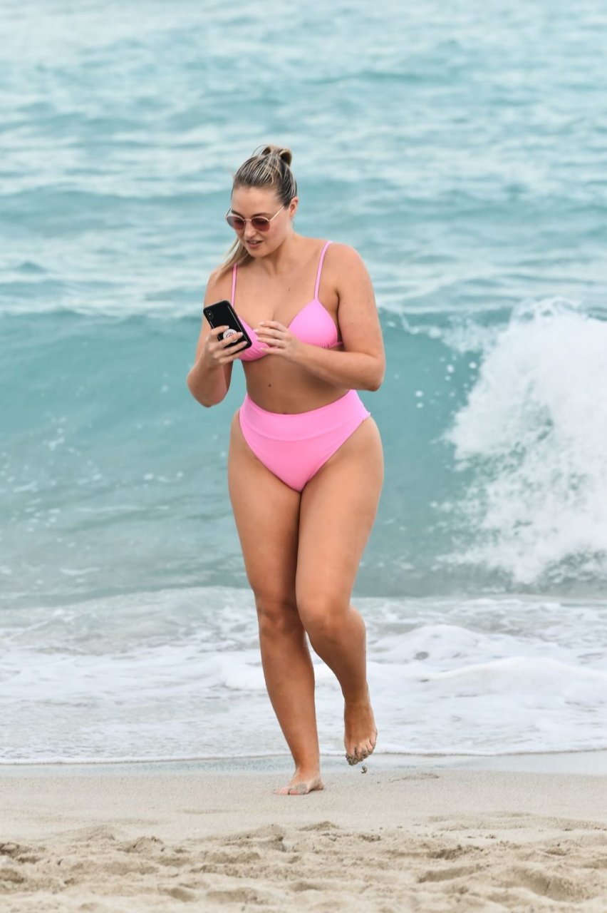 Model Iskra Lawrence exibe suas curvas na praia com um biquíni rosa em Miami, 12/09/2018. Iskra está ótima enquanto aproveita seu dia na praia.