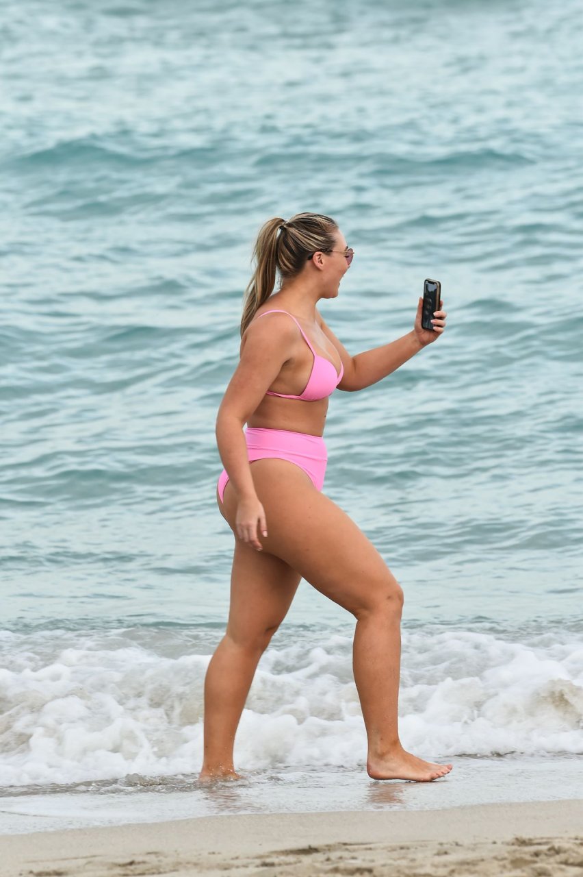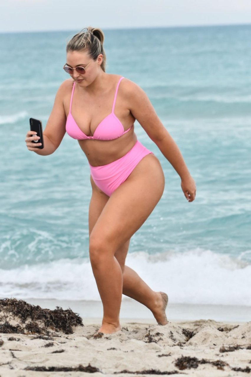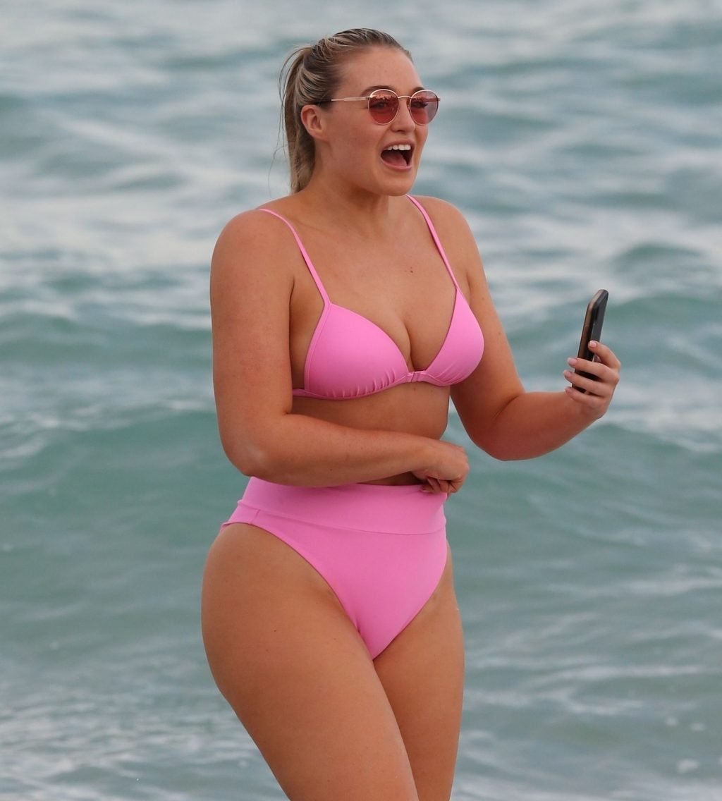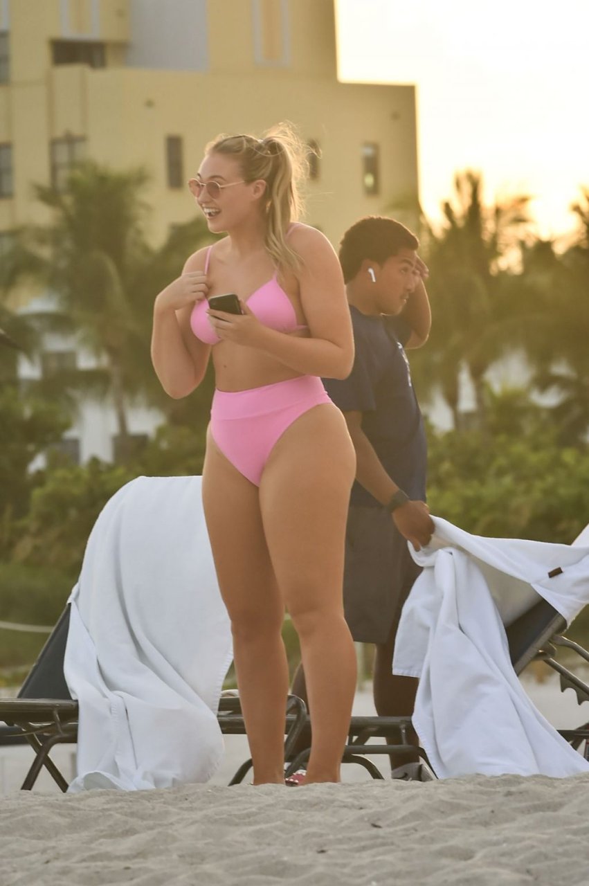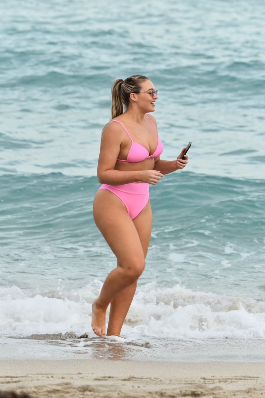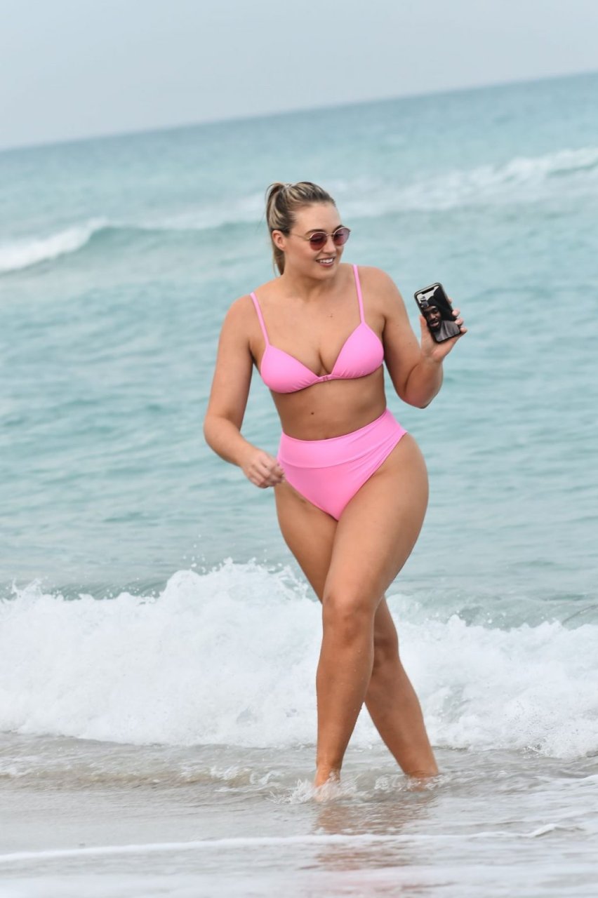 Model Iskra Lawrence exibe suas curvas na praia com um biquíni rosa em Miami, 12/09/2018. Iskra está ótima enquanto aproveita seu dia na praia.