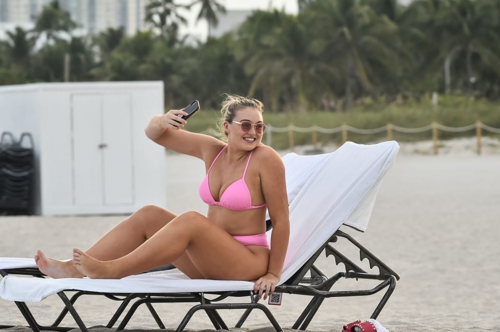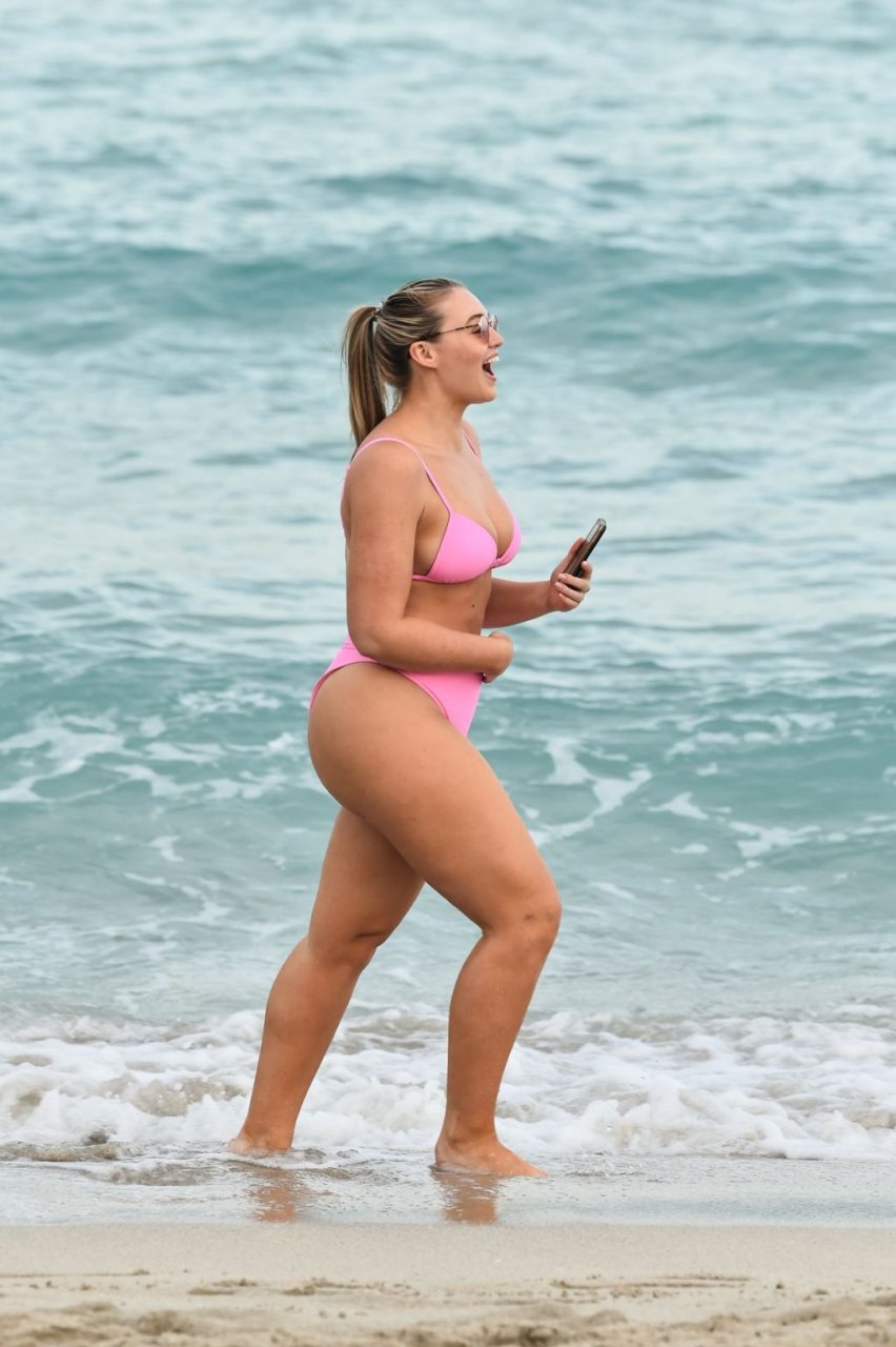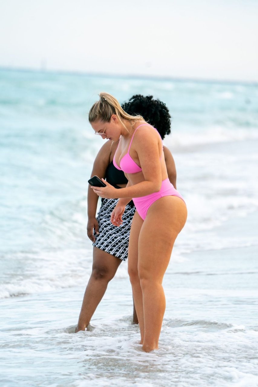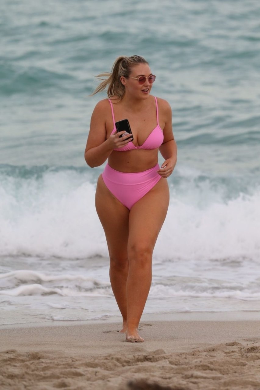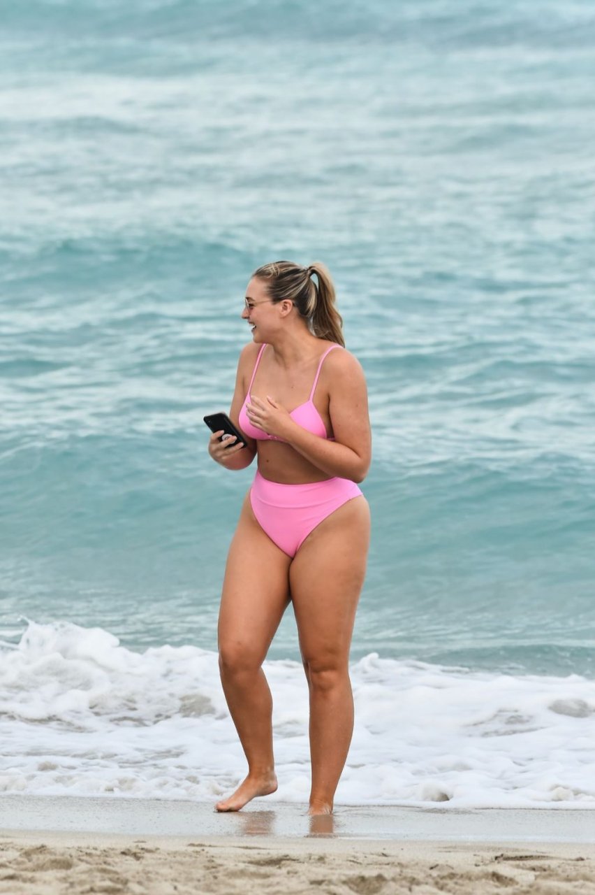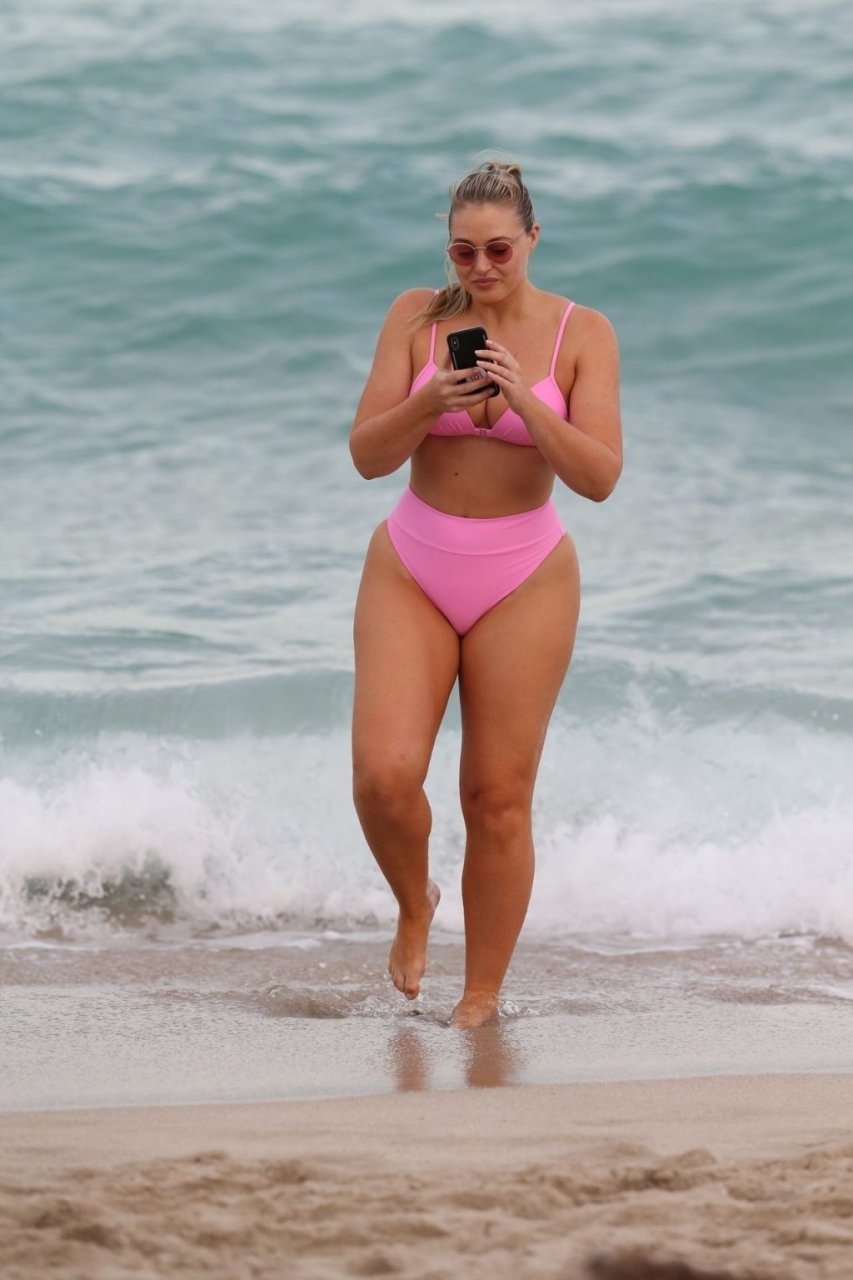 Model Iskra Lawrence exibe suas curvas na praia com um biquíni rosa em Miami, 12/09/2018. Iskra está ótima enquanto aproveita seu dia na praia.