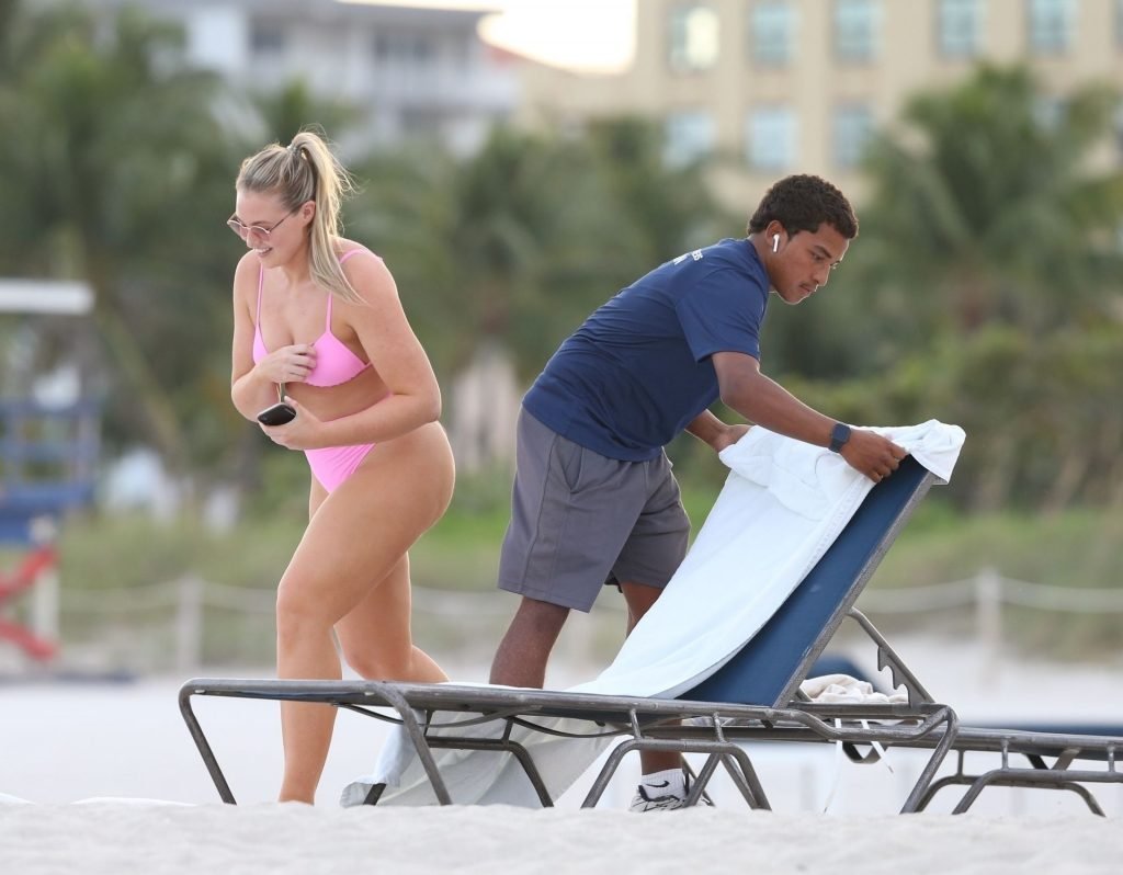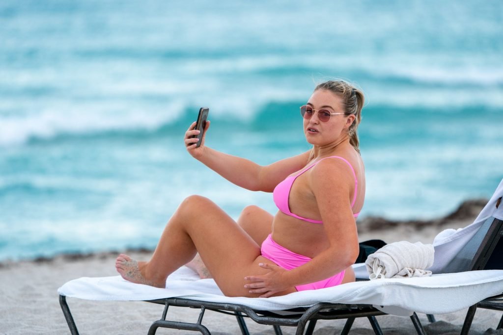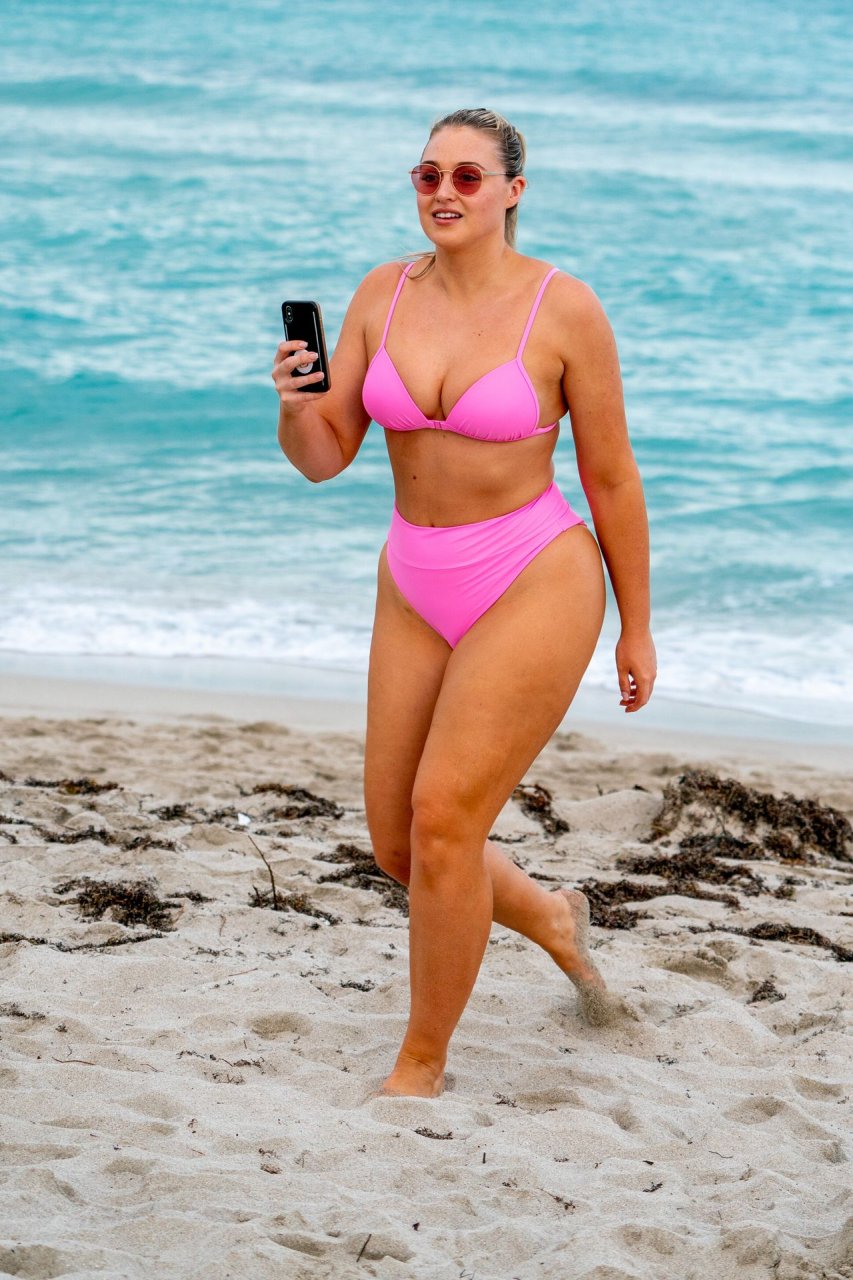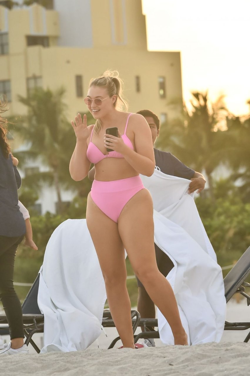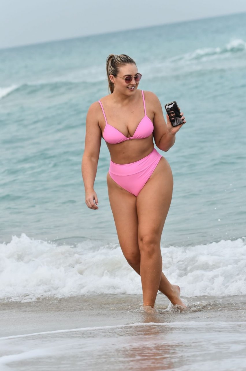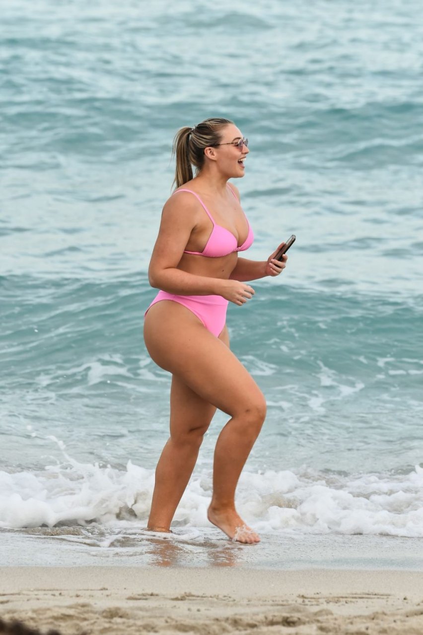 Model Iskra Lawrence exibe suas curvas na praia com um biquíni rosa em Miami, 12/09/2018. Iskra está ótima enquanto aproveita seu dia na praia.
