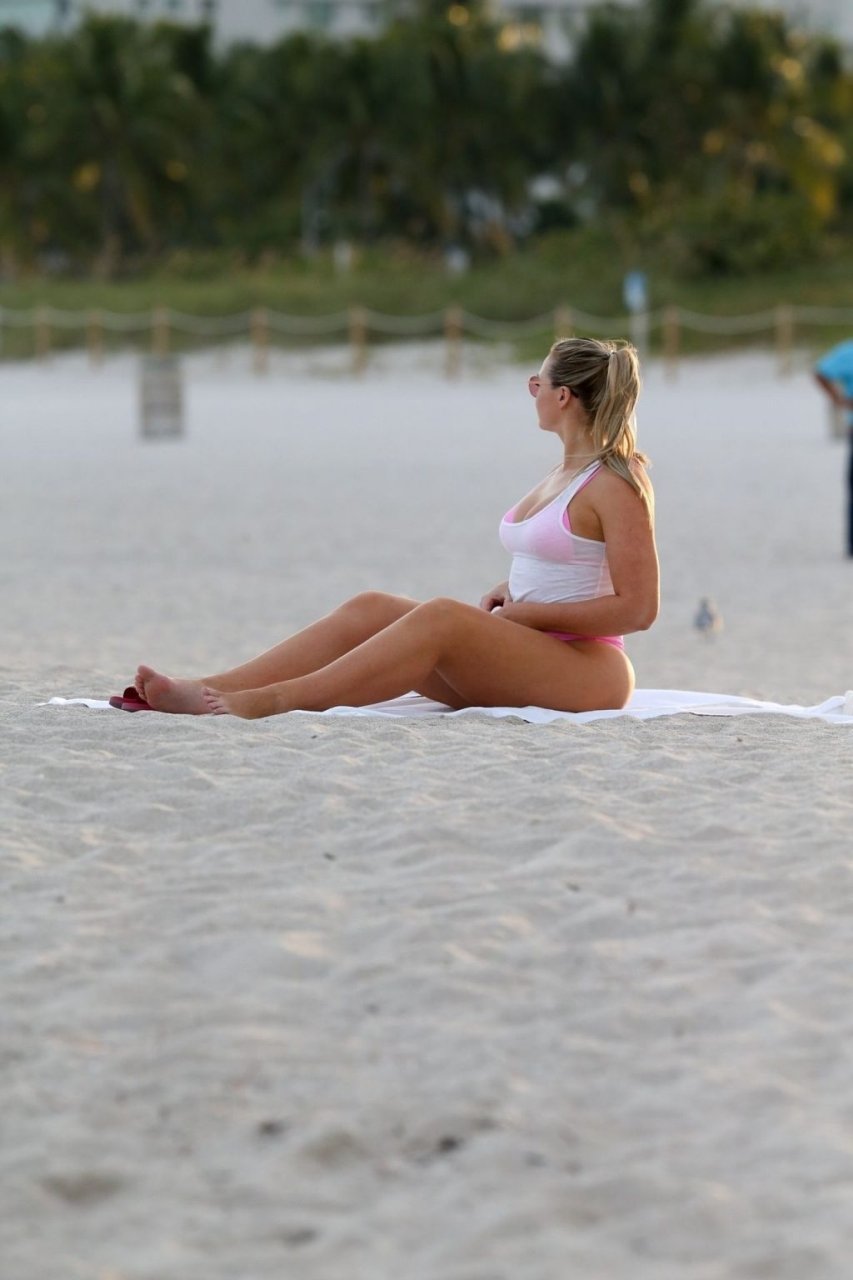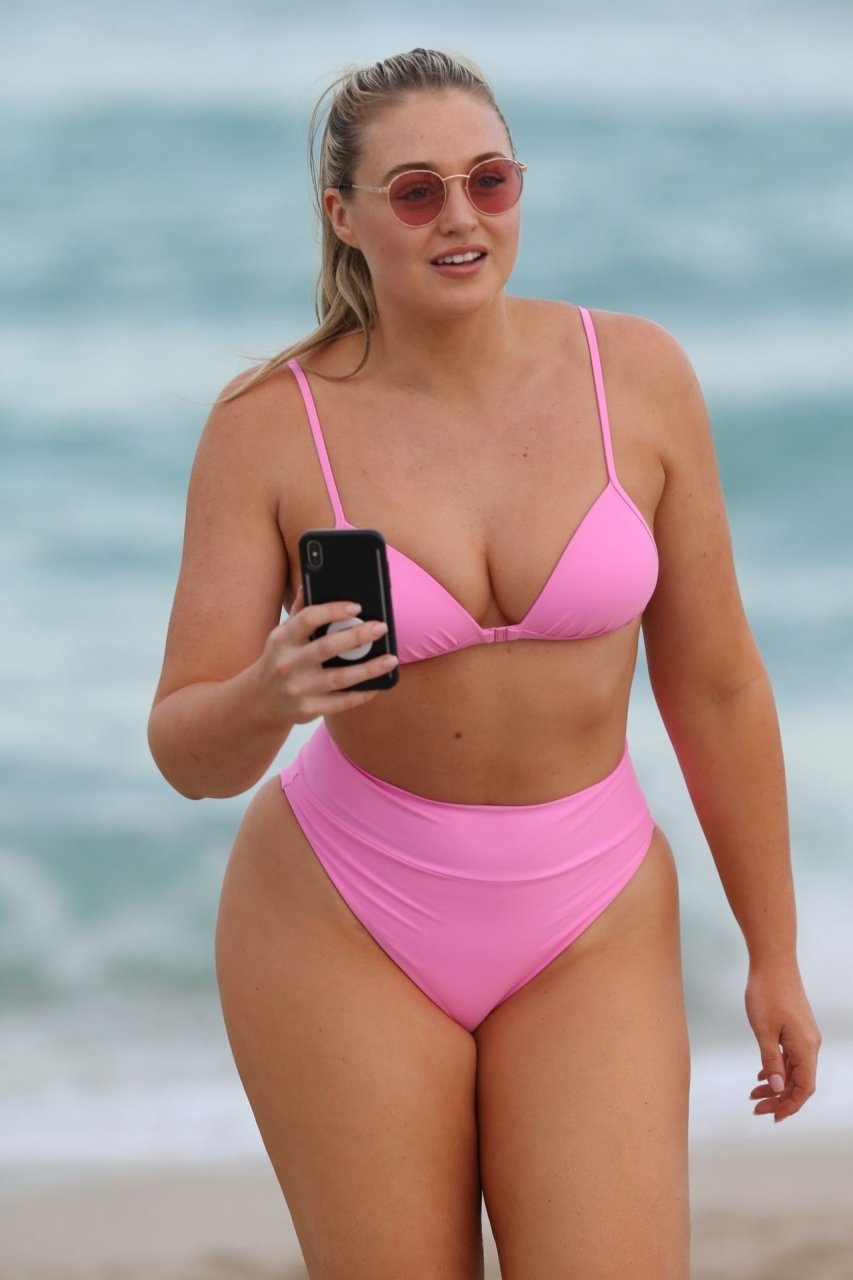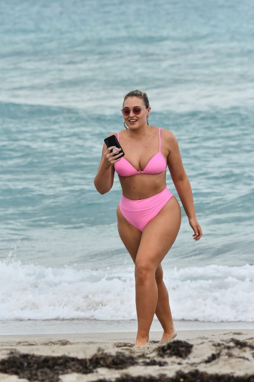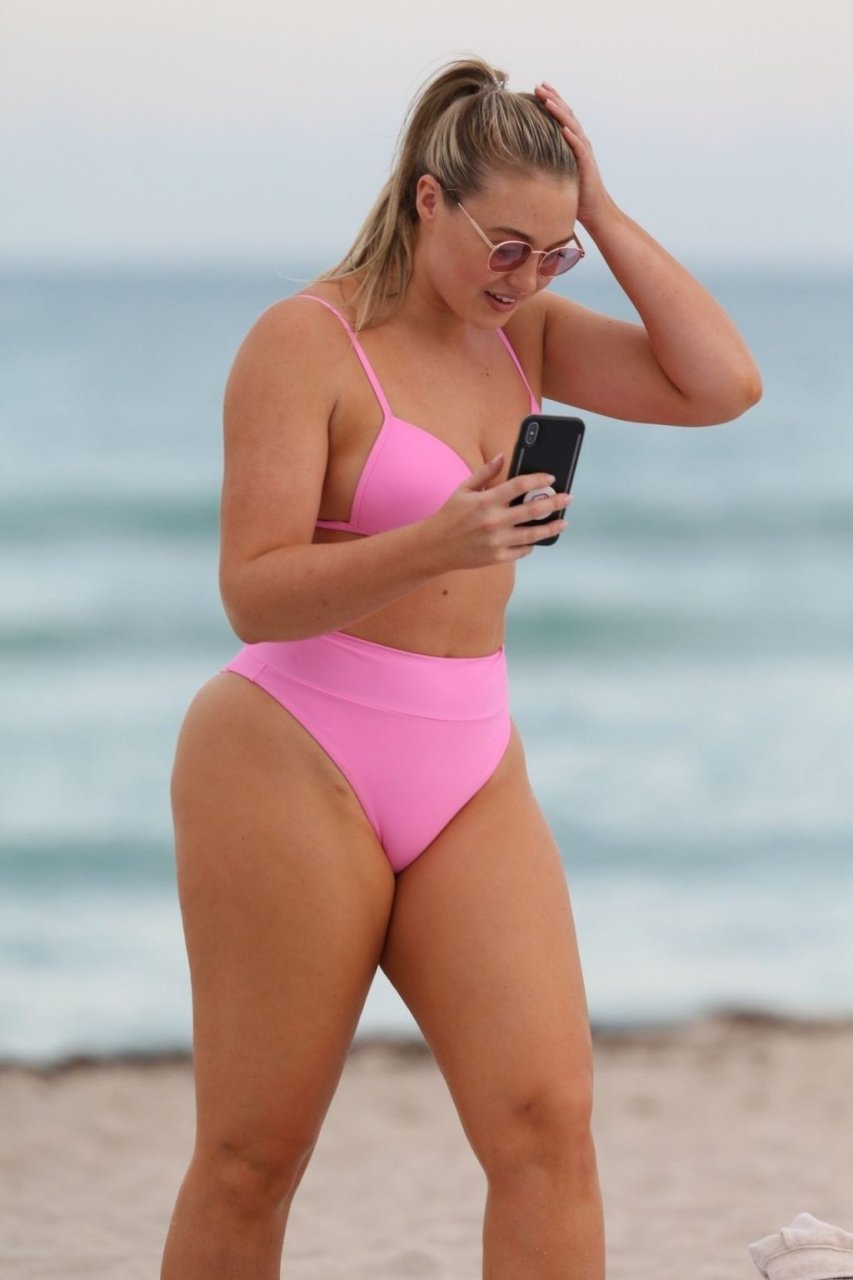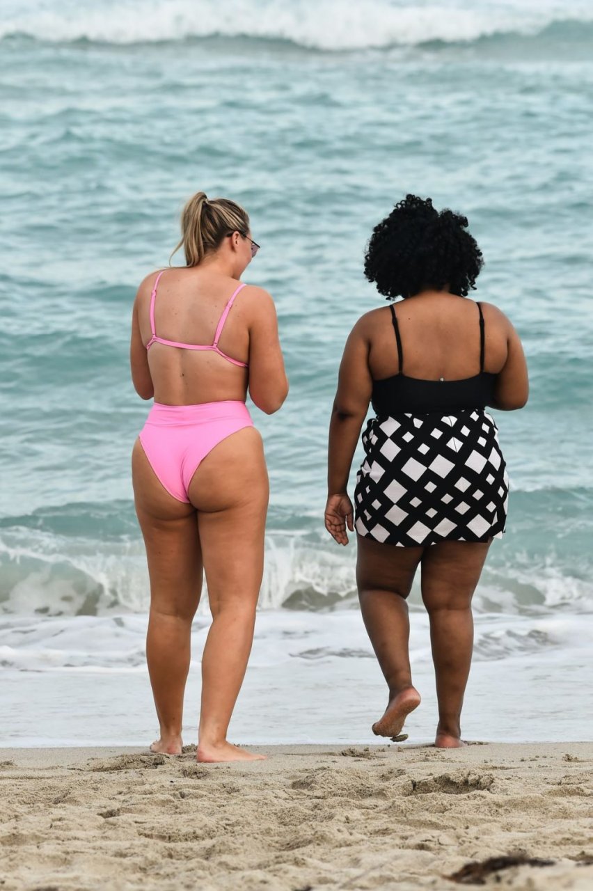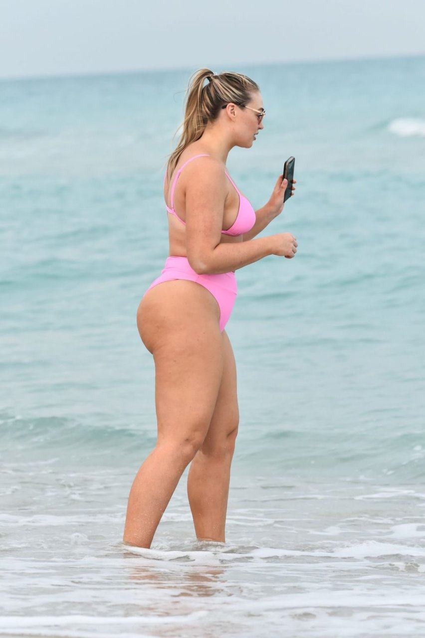 Model Iskra Lawrence exibe suas curvas na praia com um biquíni rosa em Miami, 12/09/2018. Iskra está ótima enquanto aproveita seu dia na praia.