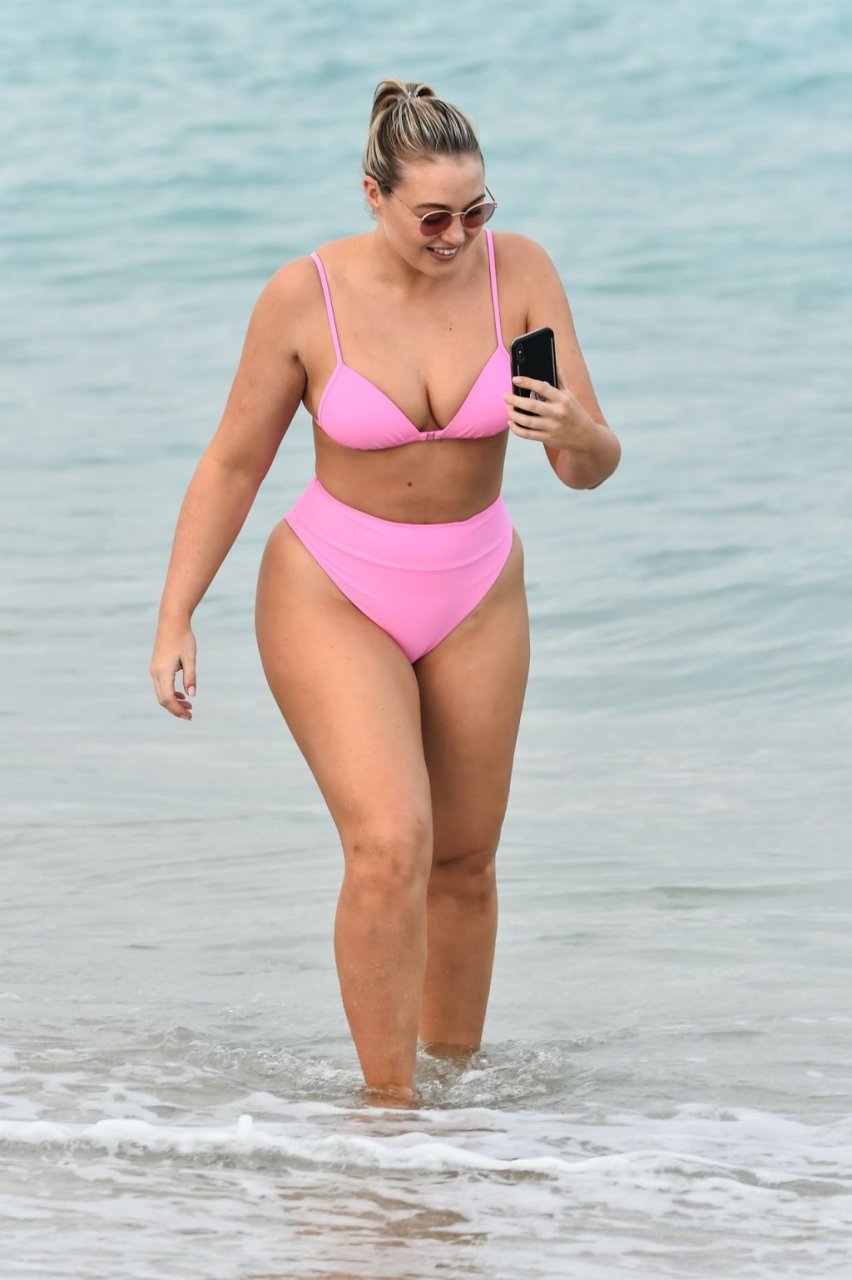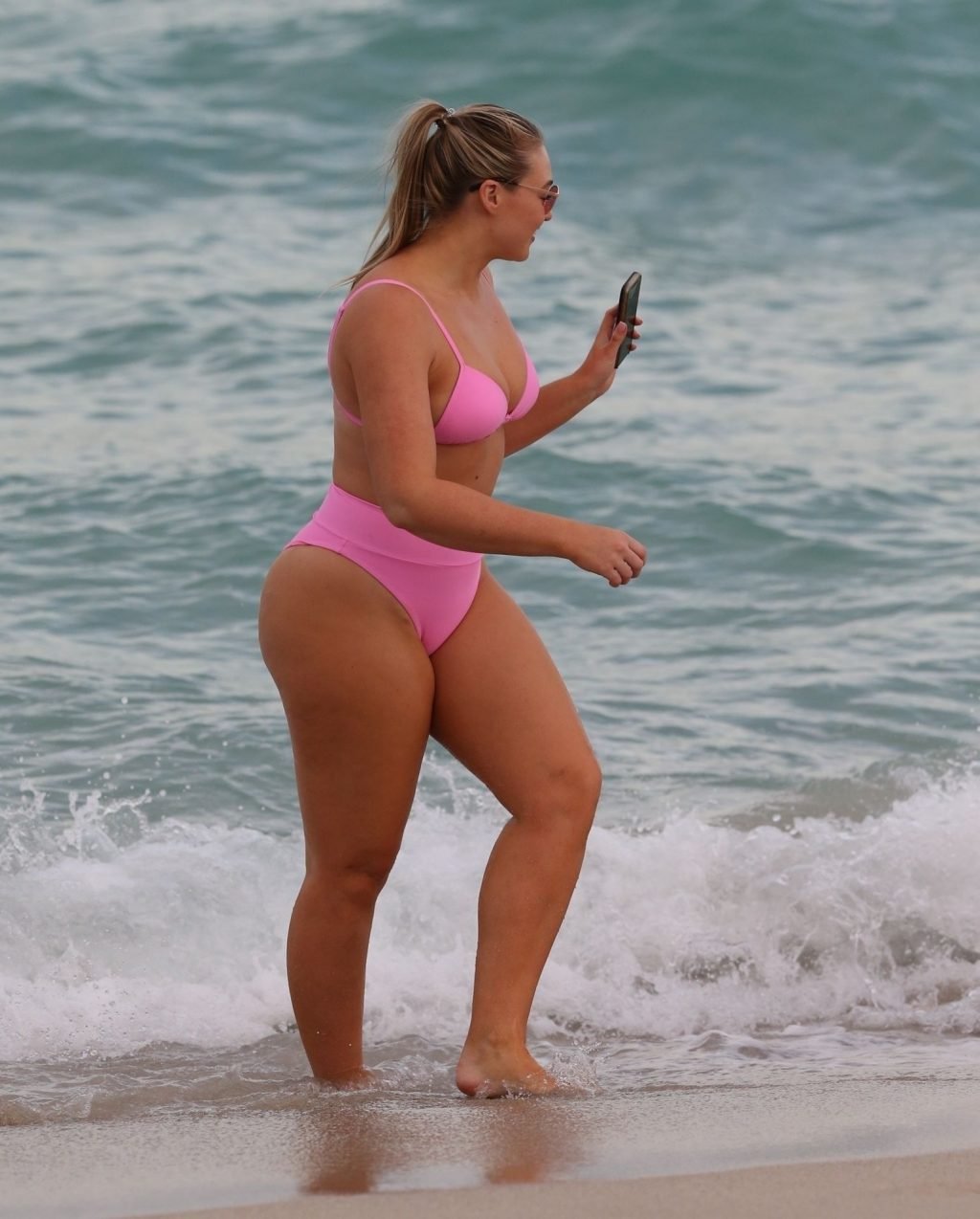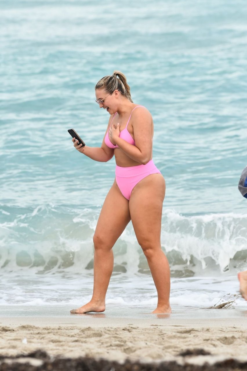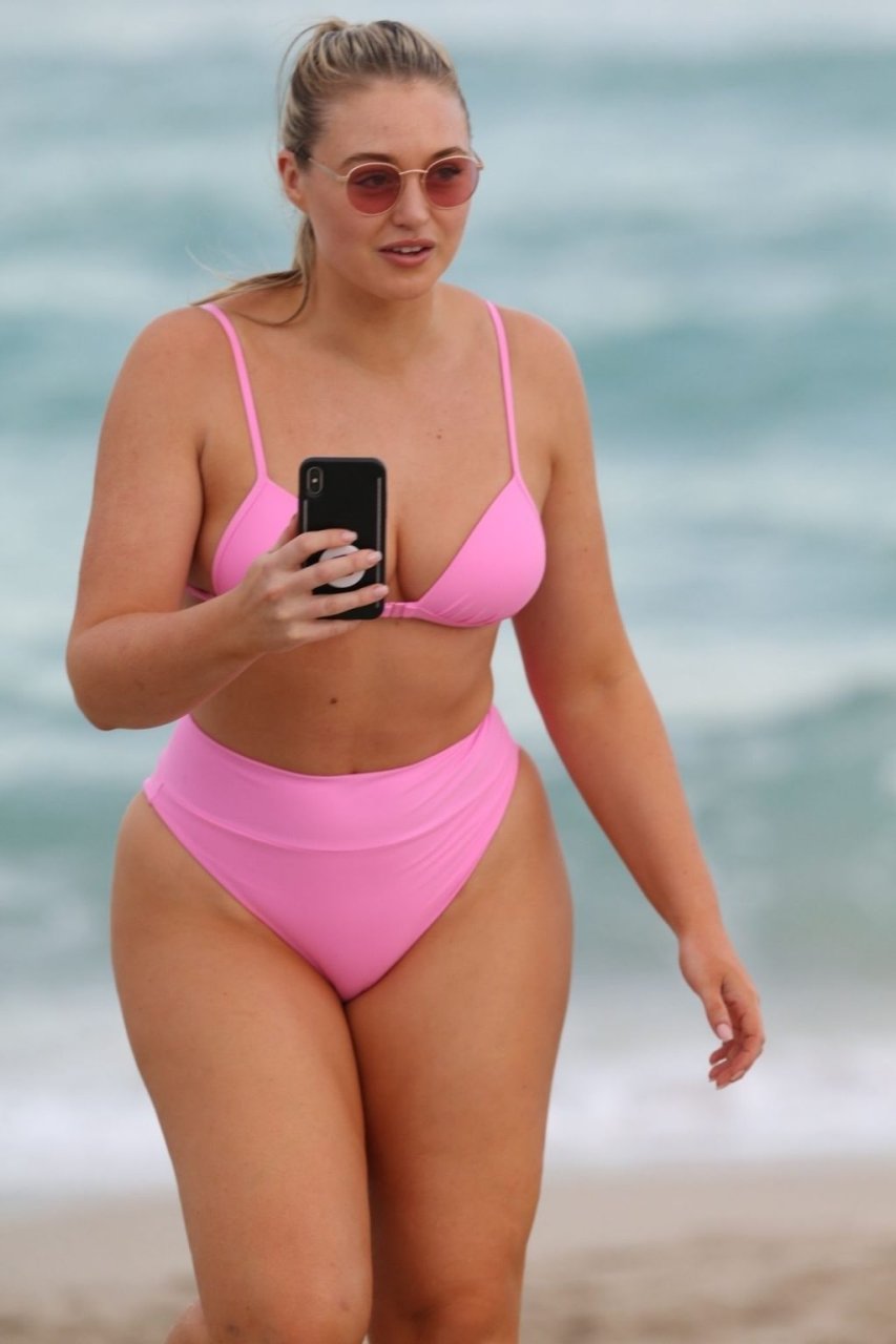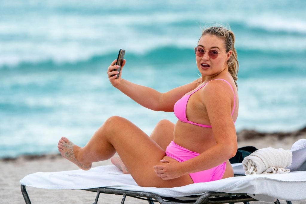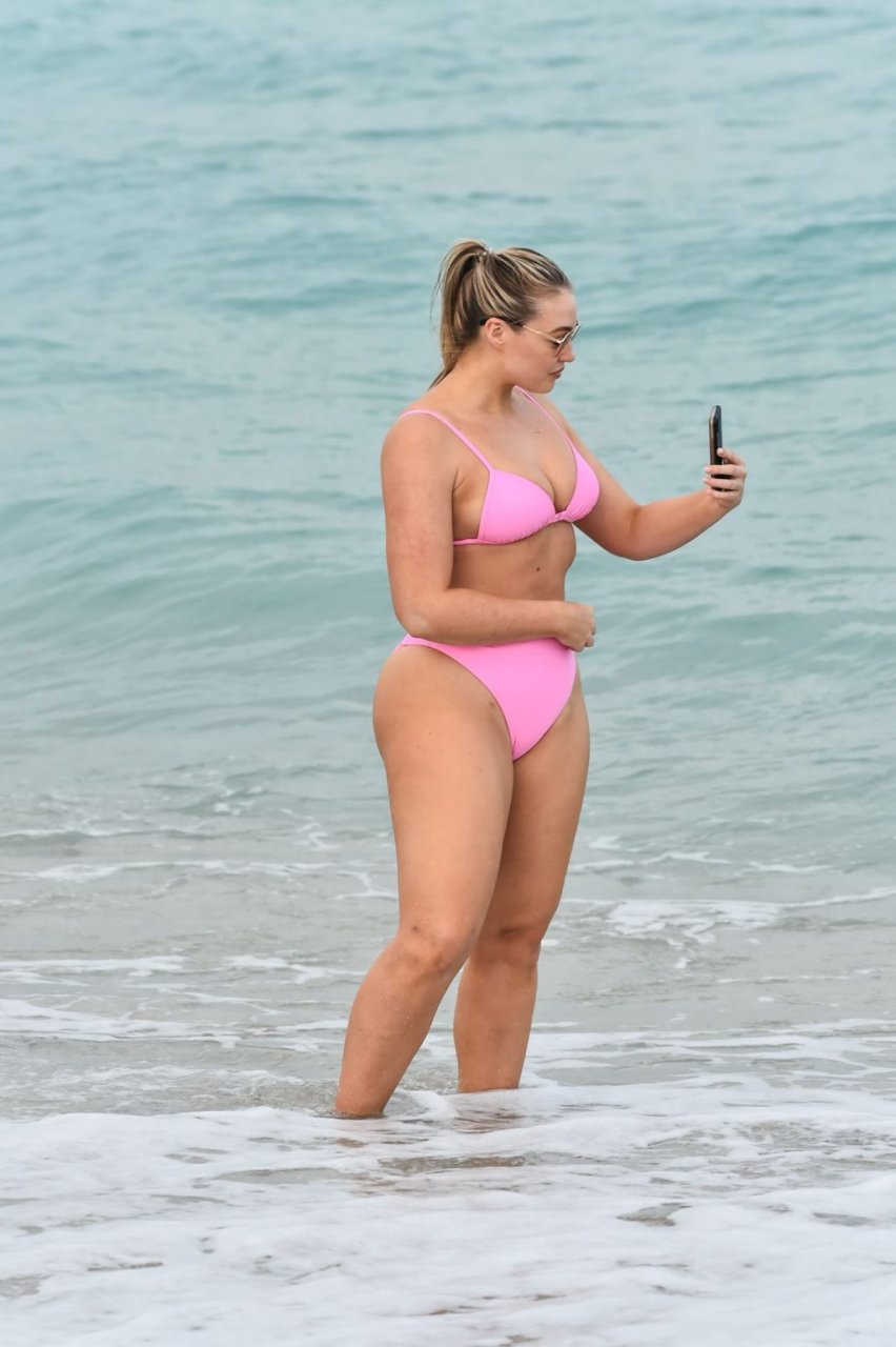 Model Iskra Lawrence exibe suas curvas na praia com um biquíni rosa em Miami, 12/09/2018. Iskra está ótima enquanto aproveita seu dia na praia.