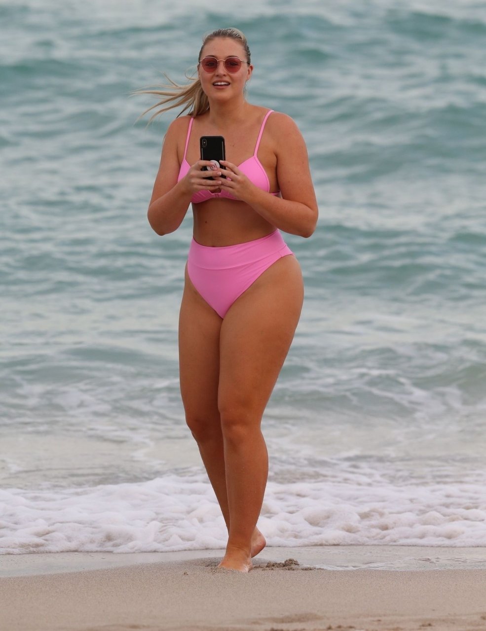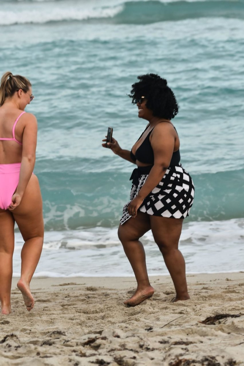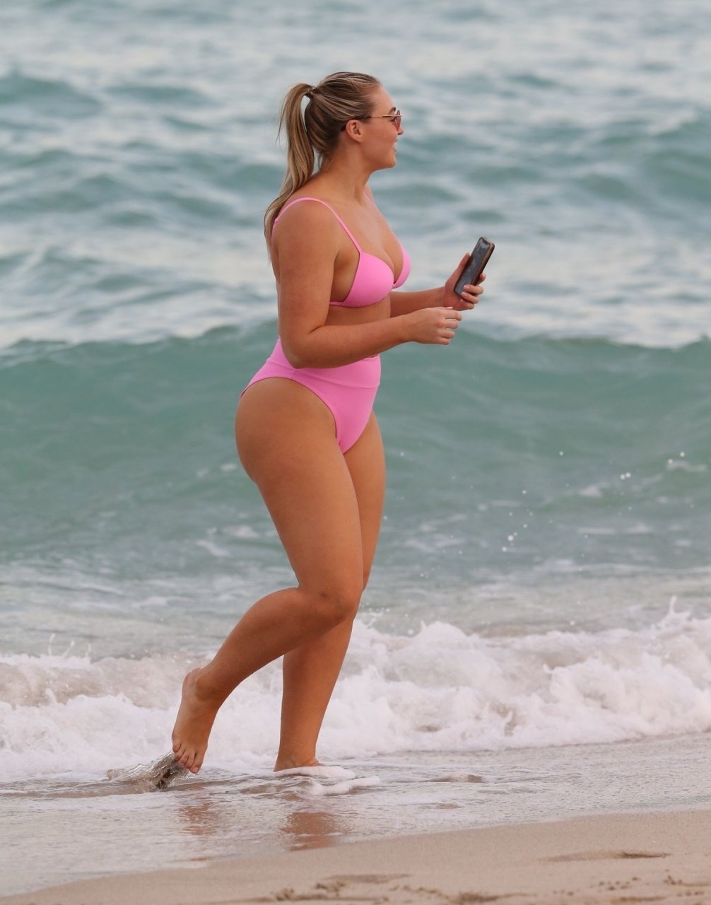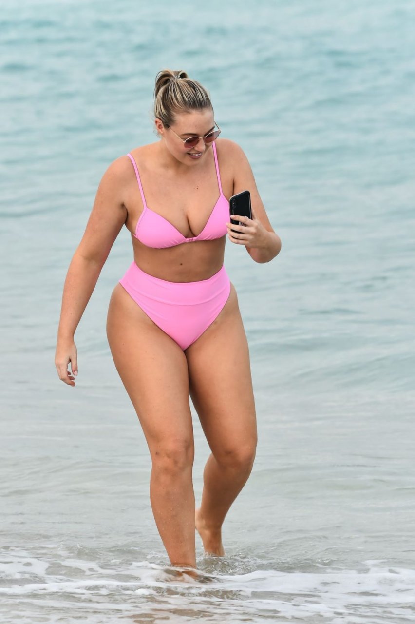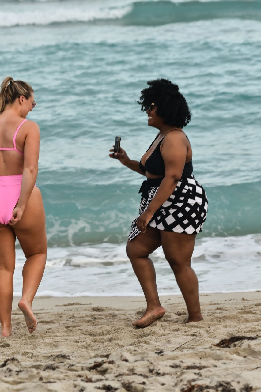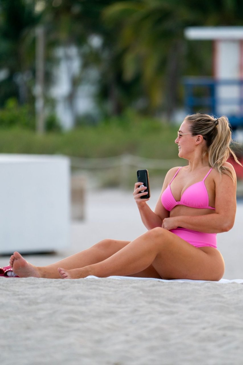 Model Iskra Lawrence exibe suas curvas na praia com um biquíni rosa em Miami, 12/09/2018. Iskra está ótima enquanto aproveita seu dia na praia.