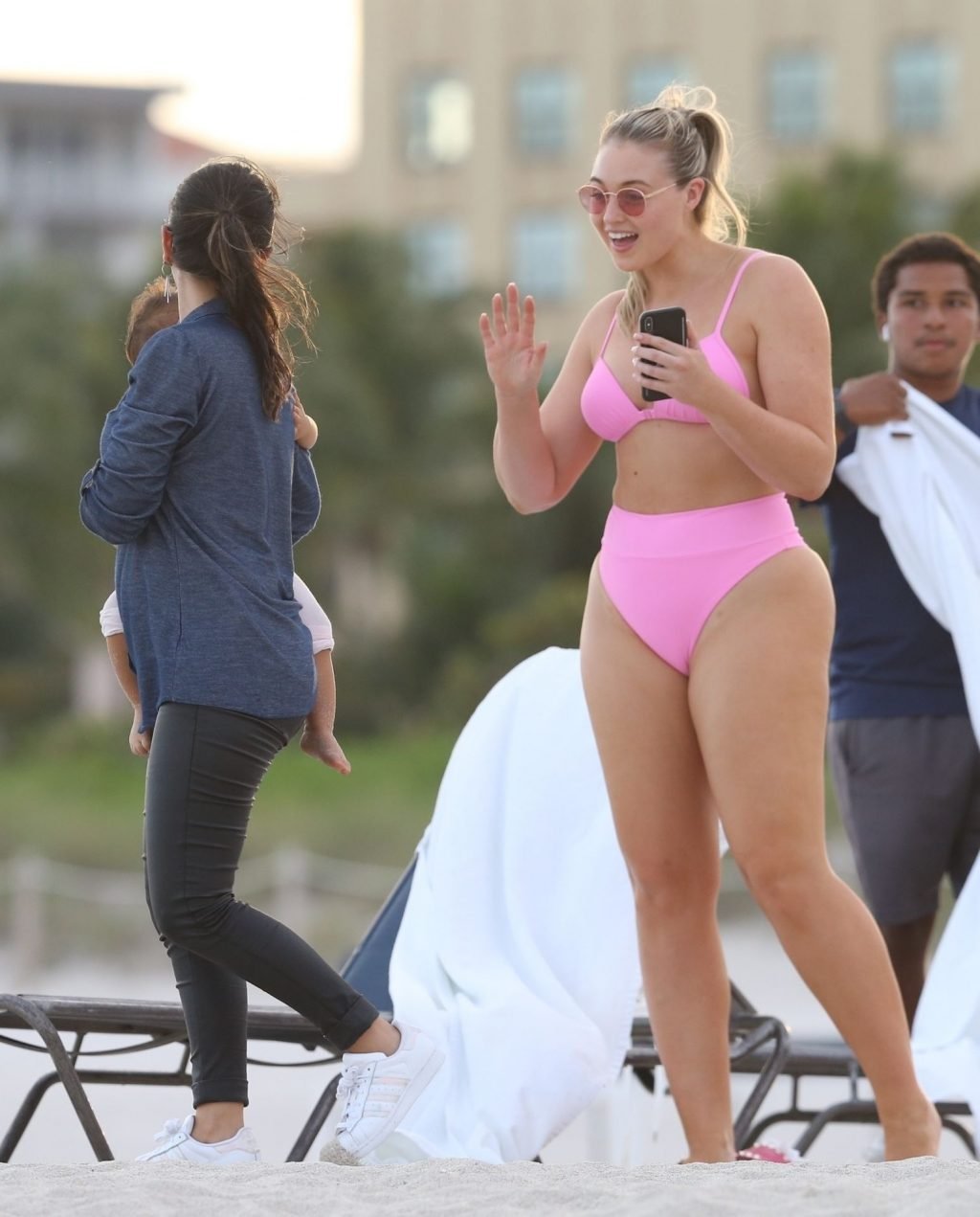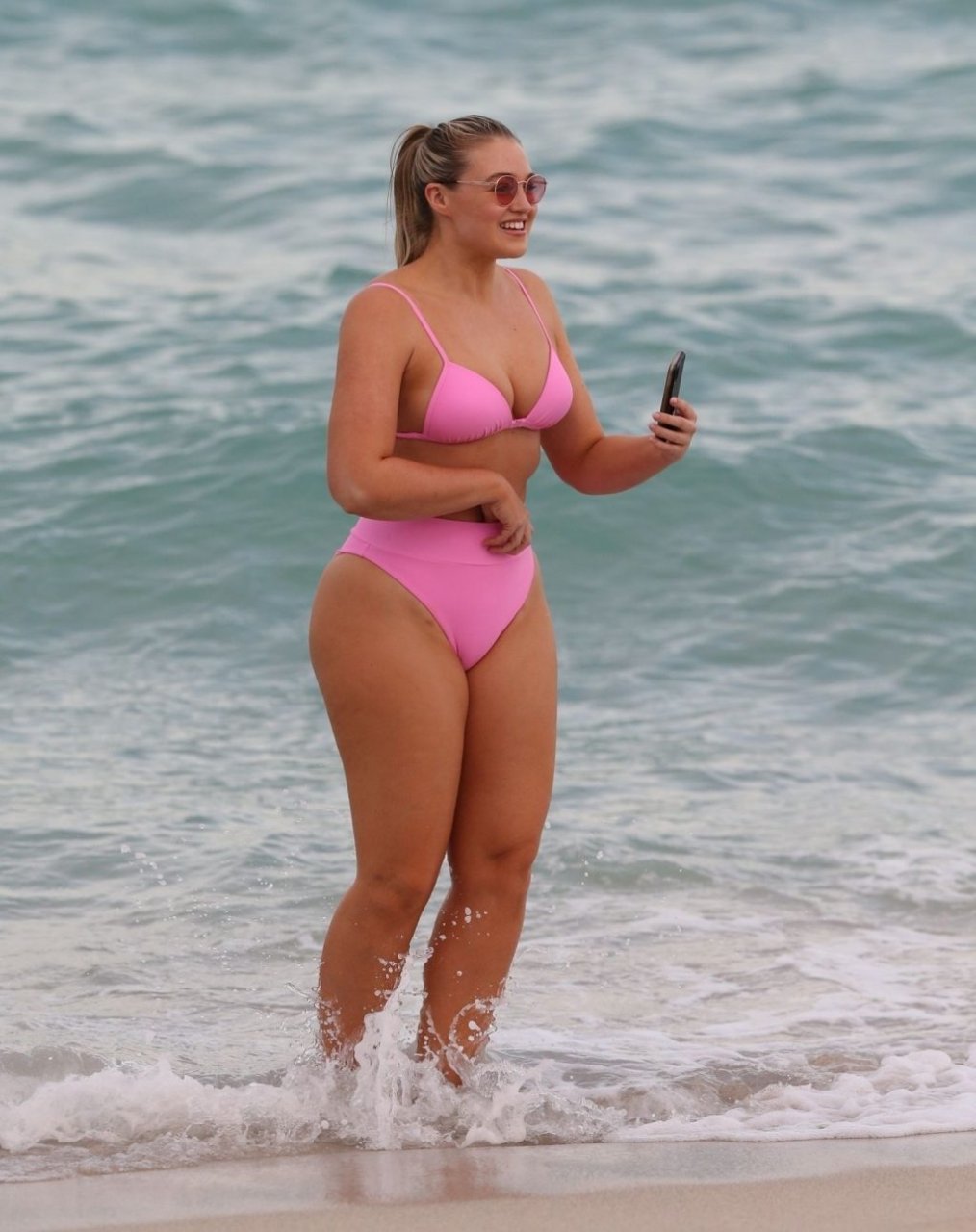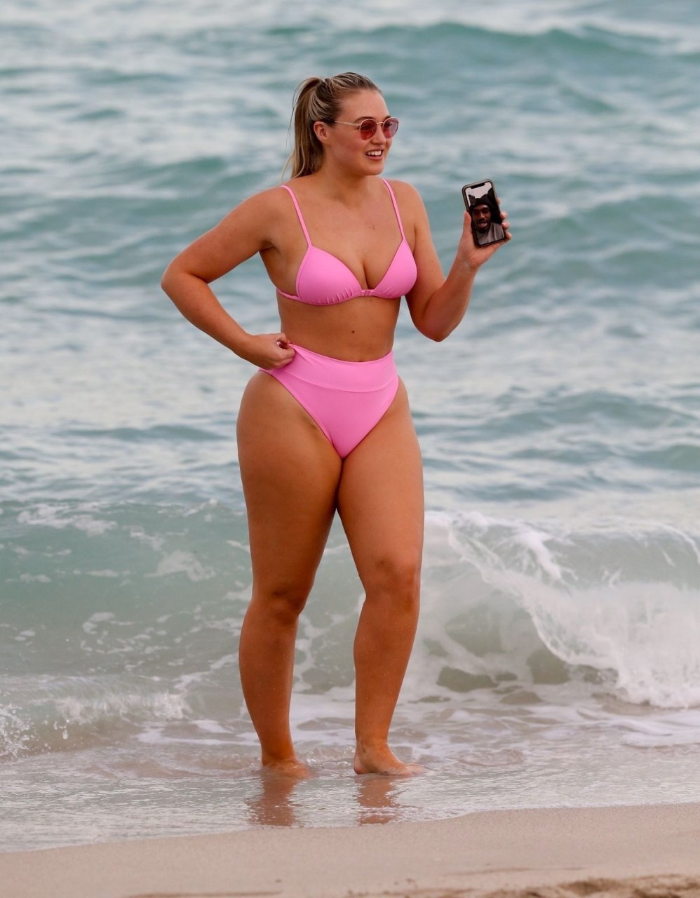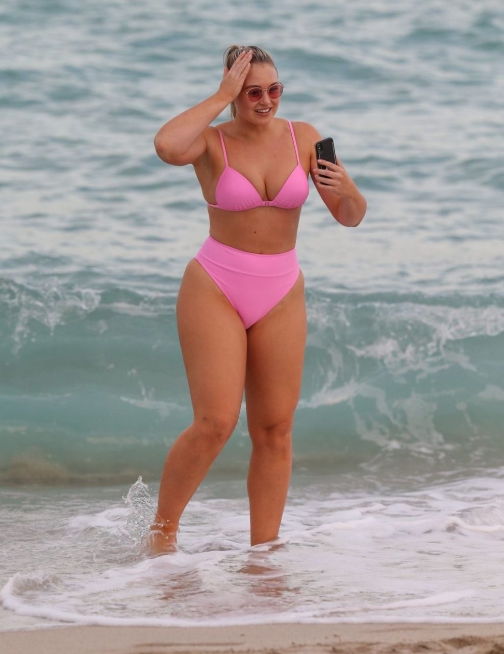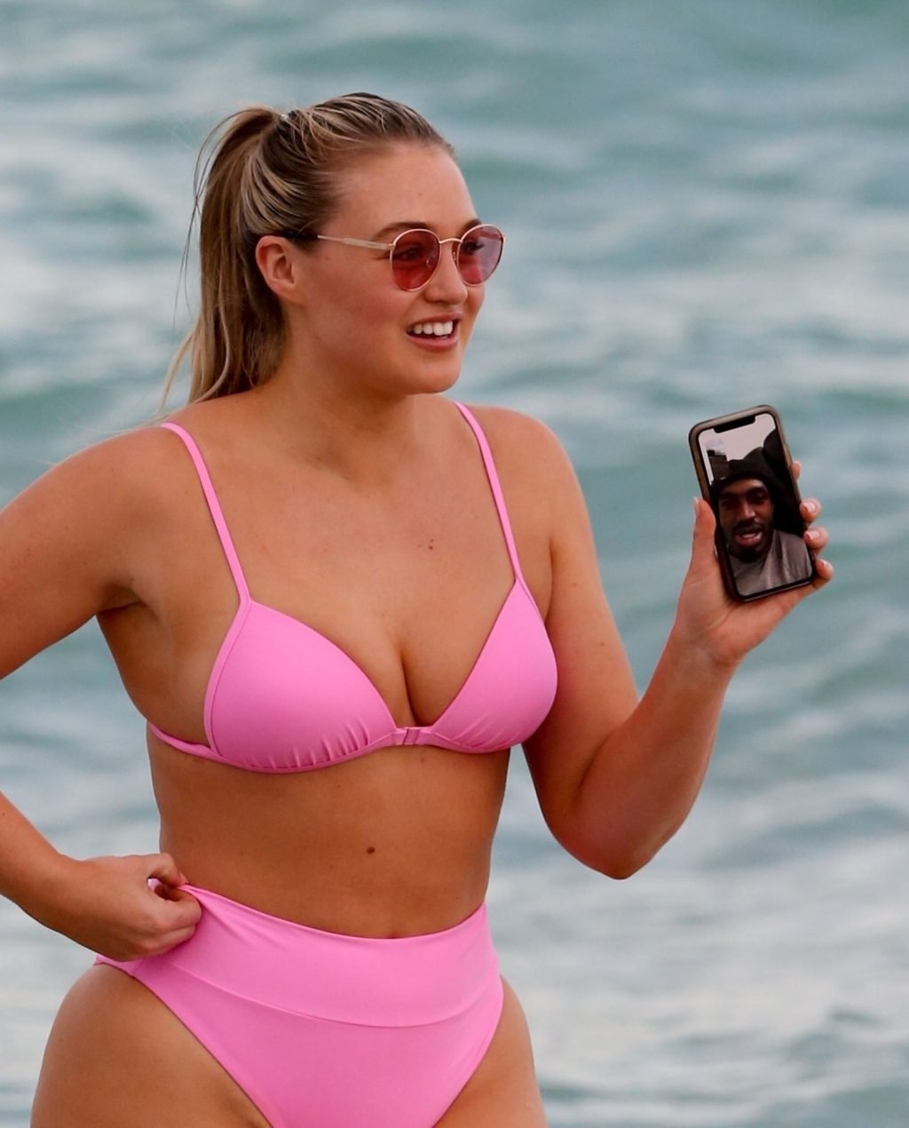 Model Iskra Lawrence exibe suas curvas na praia com um biquíni rosa em Miami, 12/09/2018. Iskra está ótima enquanto aproveita seu dia na praia.