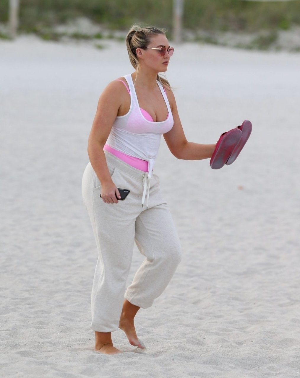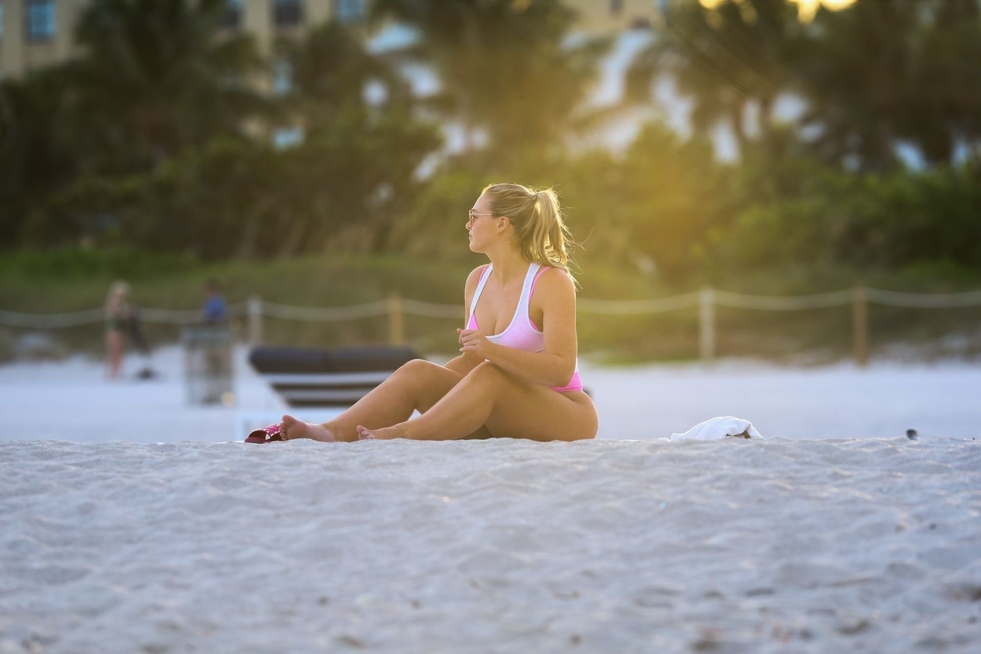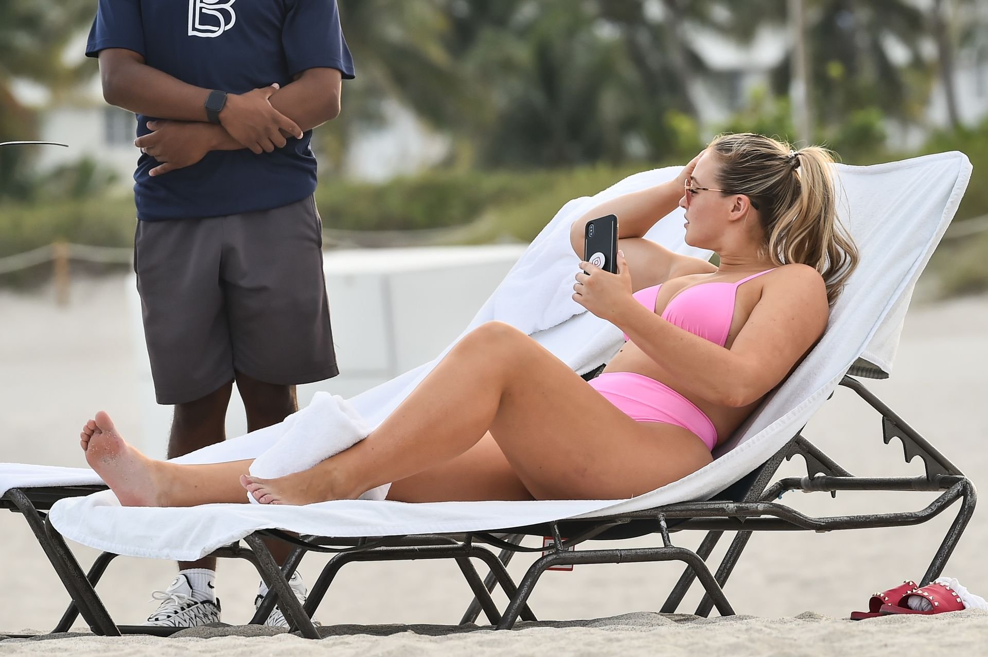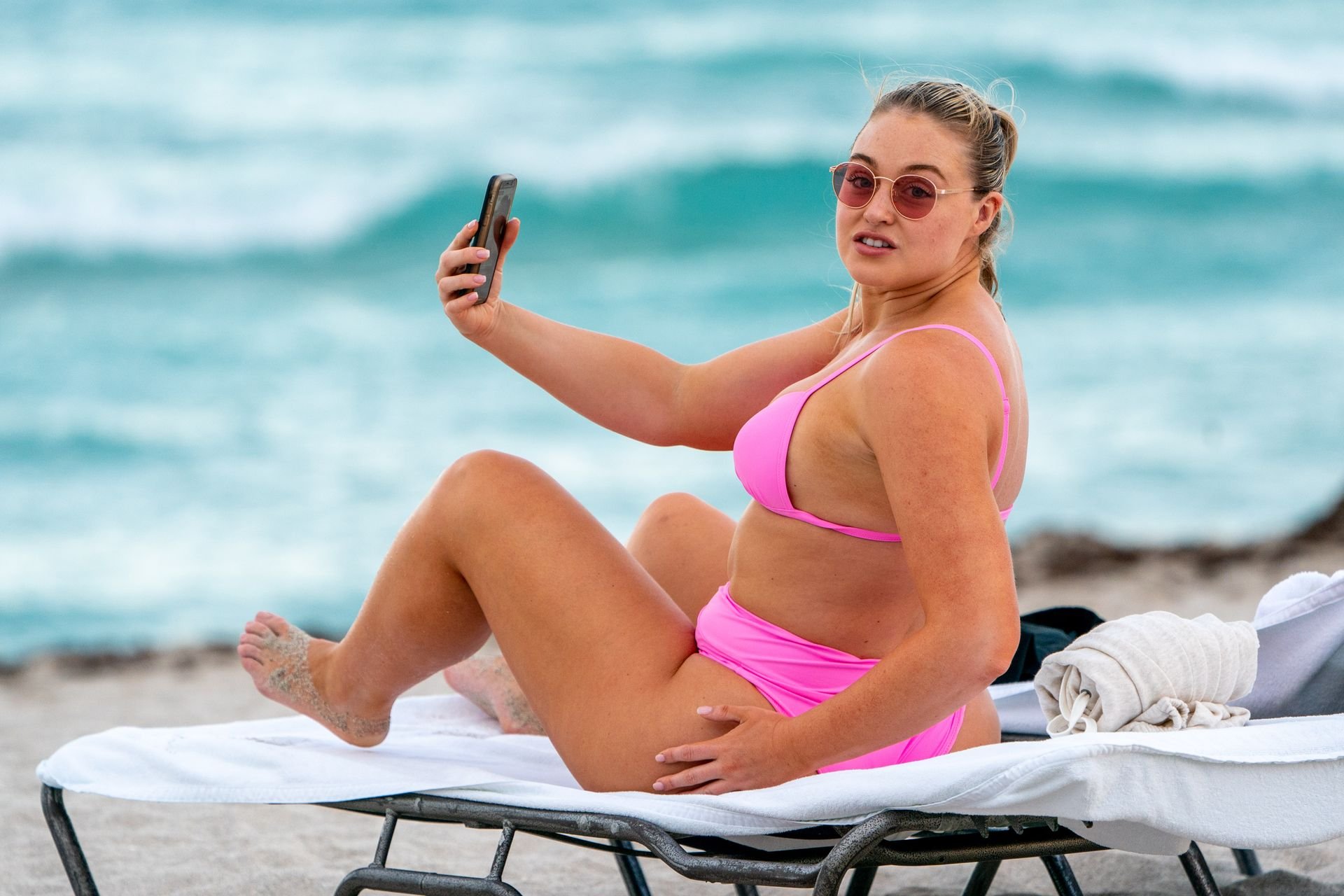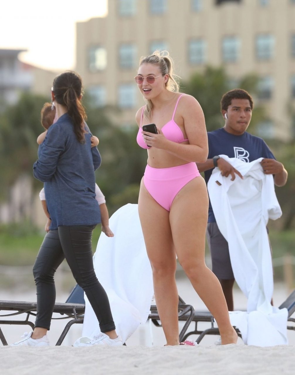Model Iskra Lawrence exibe suas curvas na praia com um biquíni rosa em Miami, 12/09/2018. Iskra está ótima enquanto aproveita seu dia na praia.