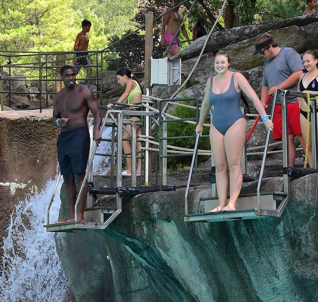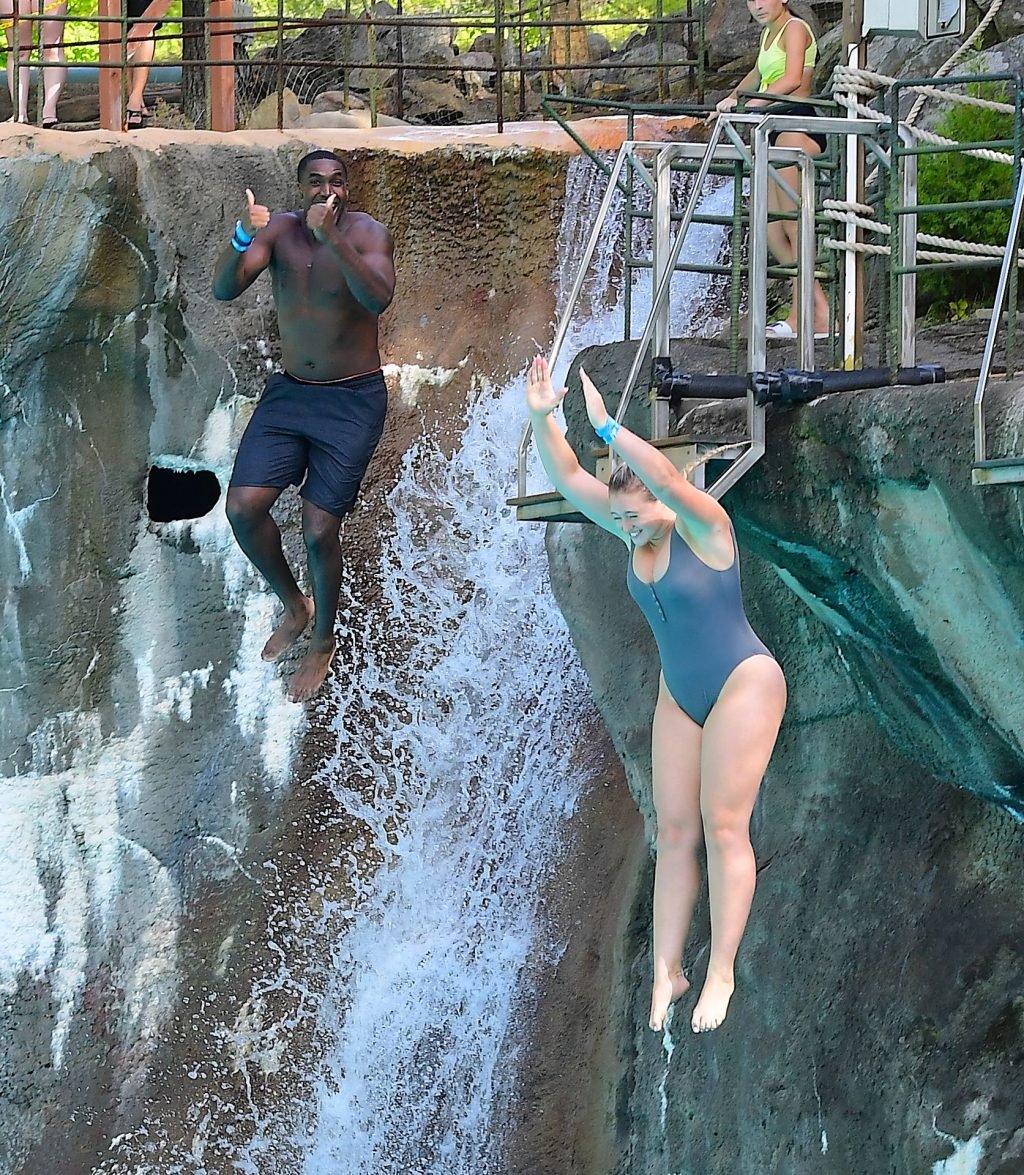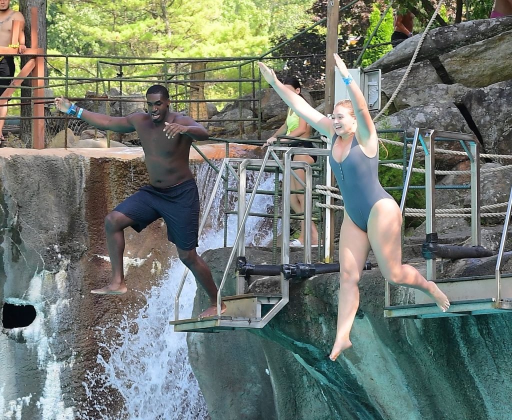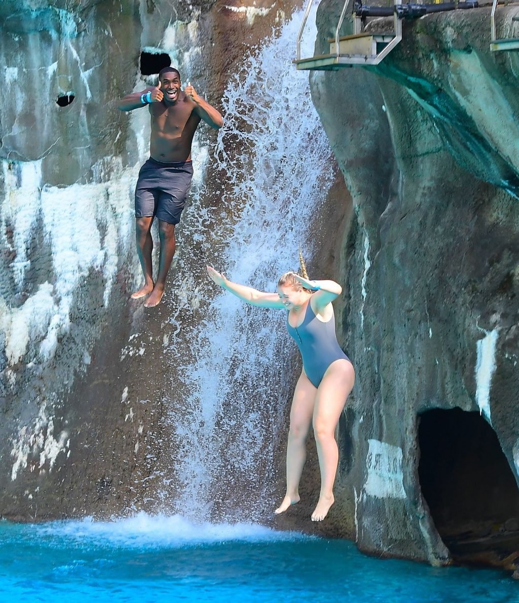 O casal apaixonado compartilhou um beijo quente enquanto se divertiam na Piscina de Ondas, antes de dar o Salto da Fé de um penhasco de 20 pés de altura. Ambos gritaram de emoção ao pularem juntos na água azul cristalina. Iskra parecia assustada, mas Philip a assegurou que ela estaria segura.