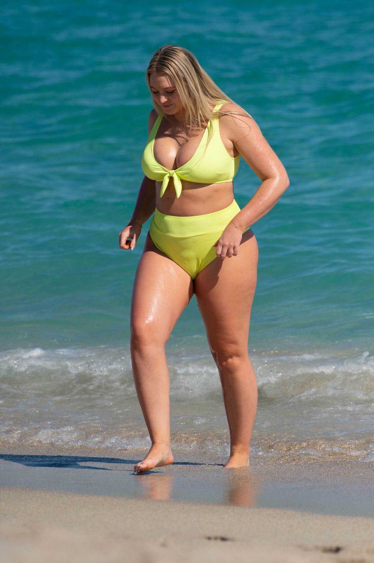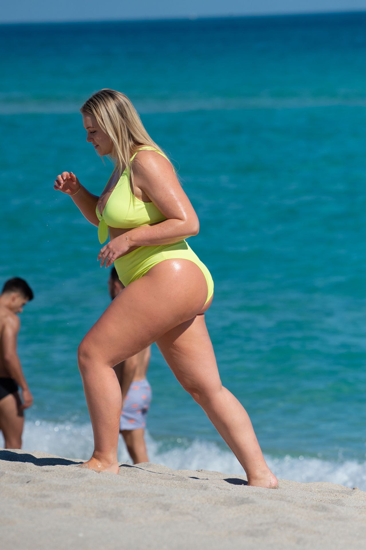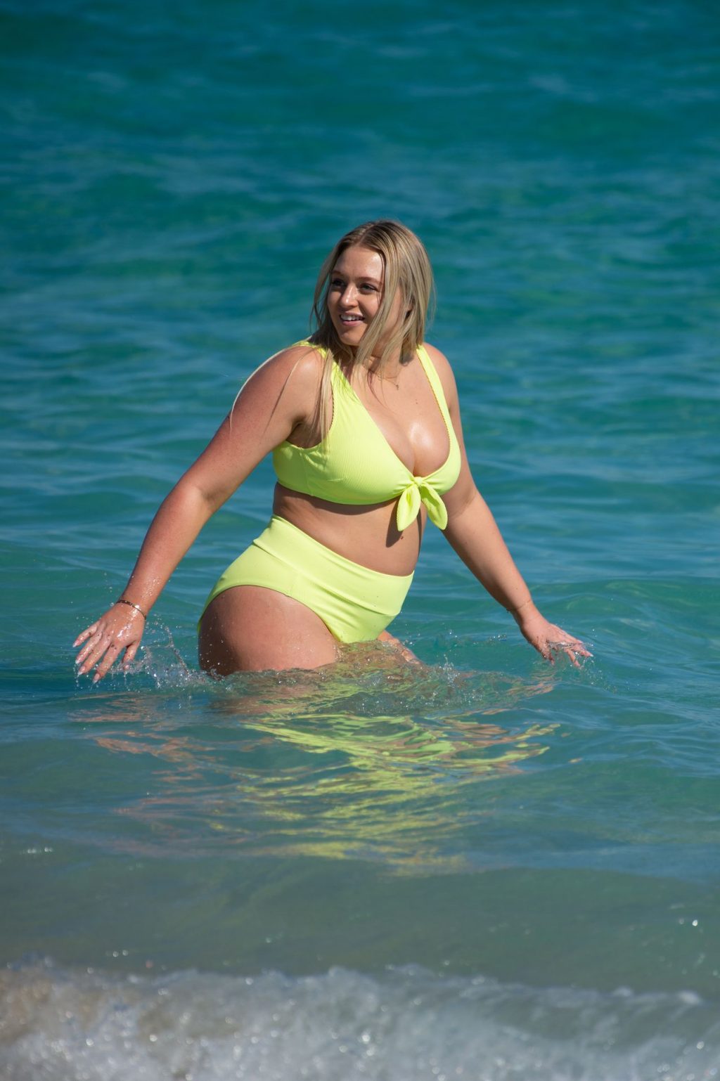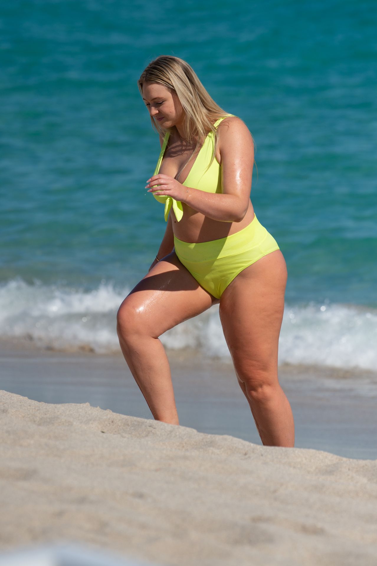 Grávida, Iskra Lawrence exibe sua crescente barriga de bebê em Miami Beach. A modelo curvilínea foi vista usando um biquíni amarelo chamativo enquanto se refrescava com um mergulho no oceano na sexta-feira.