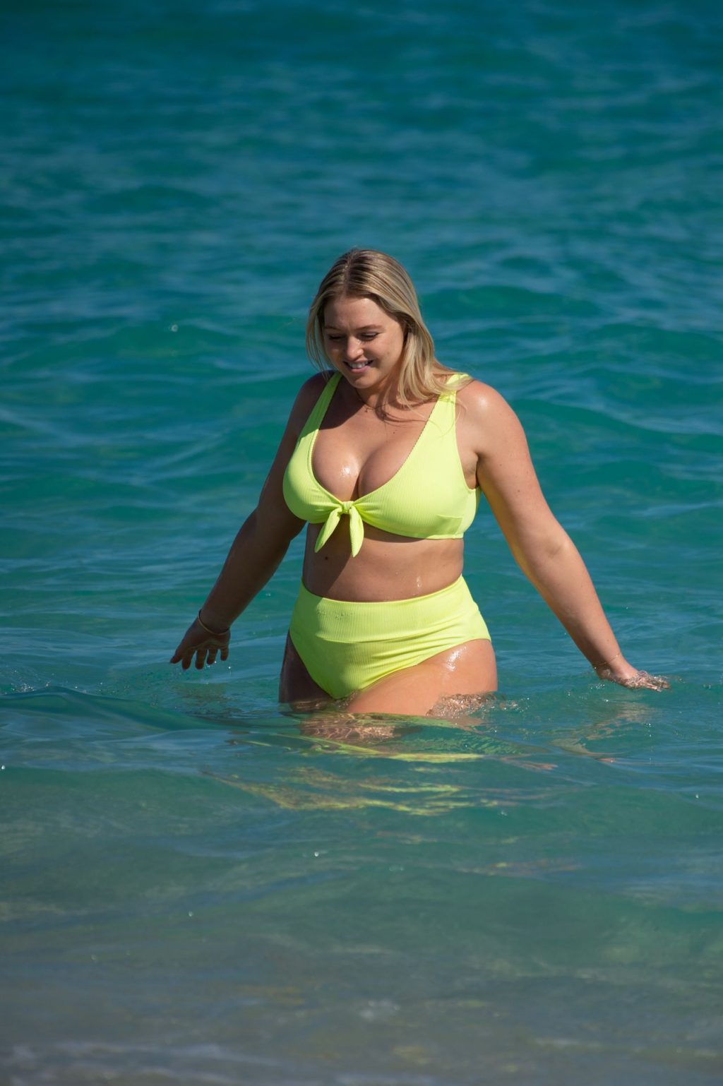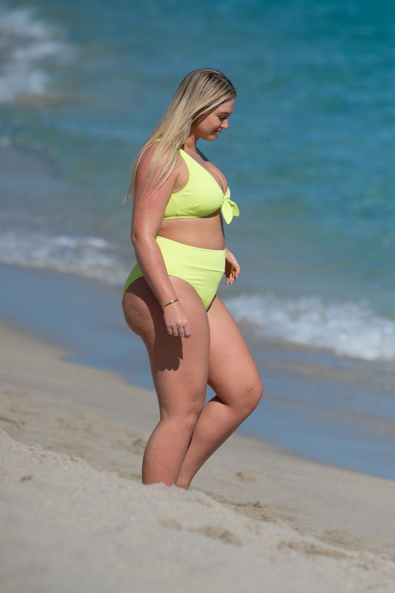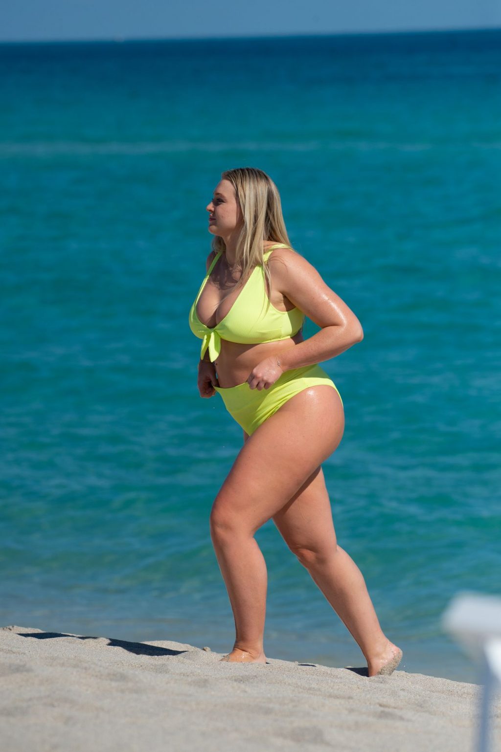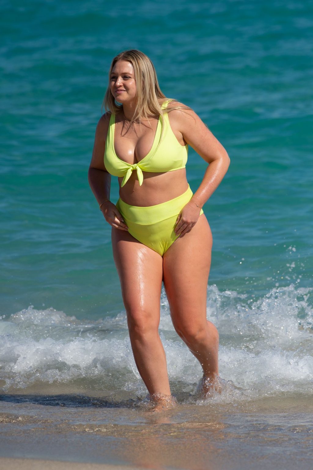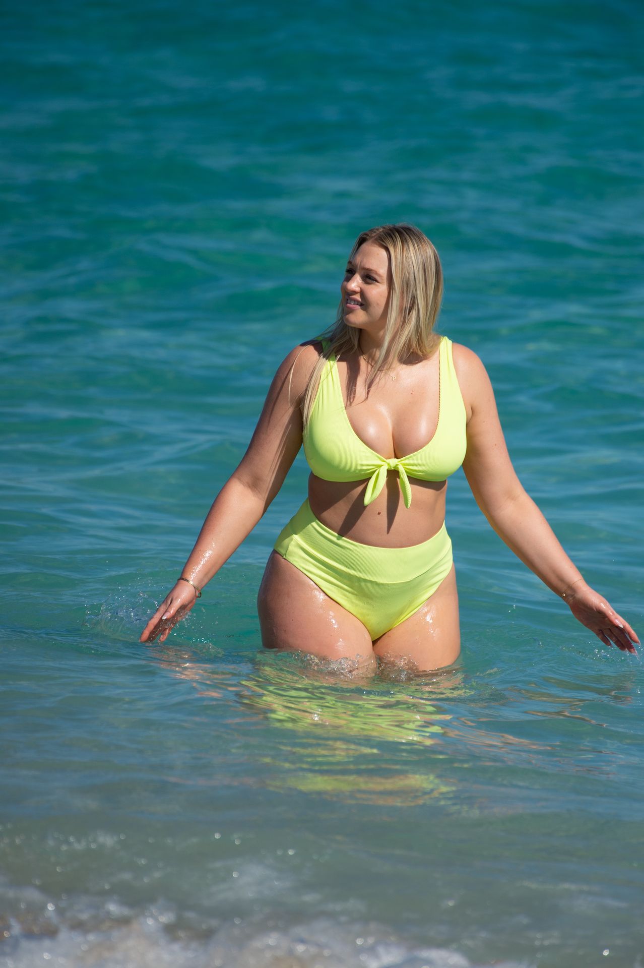 Grávida, Iskra Lawrence exibe sua crescente barriga de bebê em Miami Beach. A modelo curvilínea foi vista usando um biquíni amarelo chamativo enquanto se refrescava com um mergulho no oceano na sexta-feira.