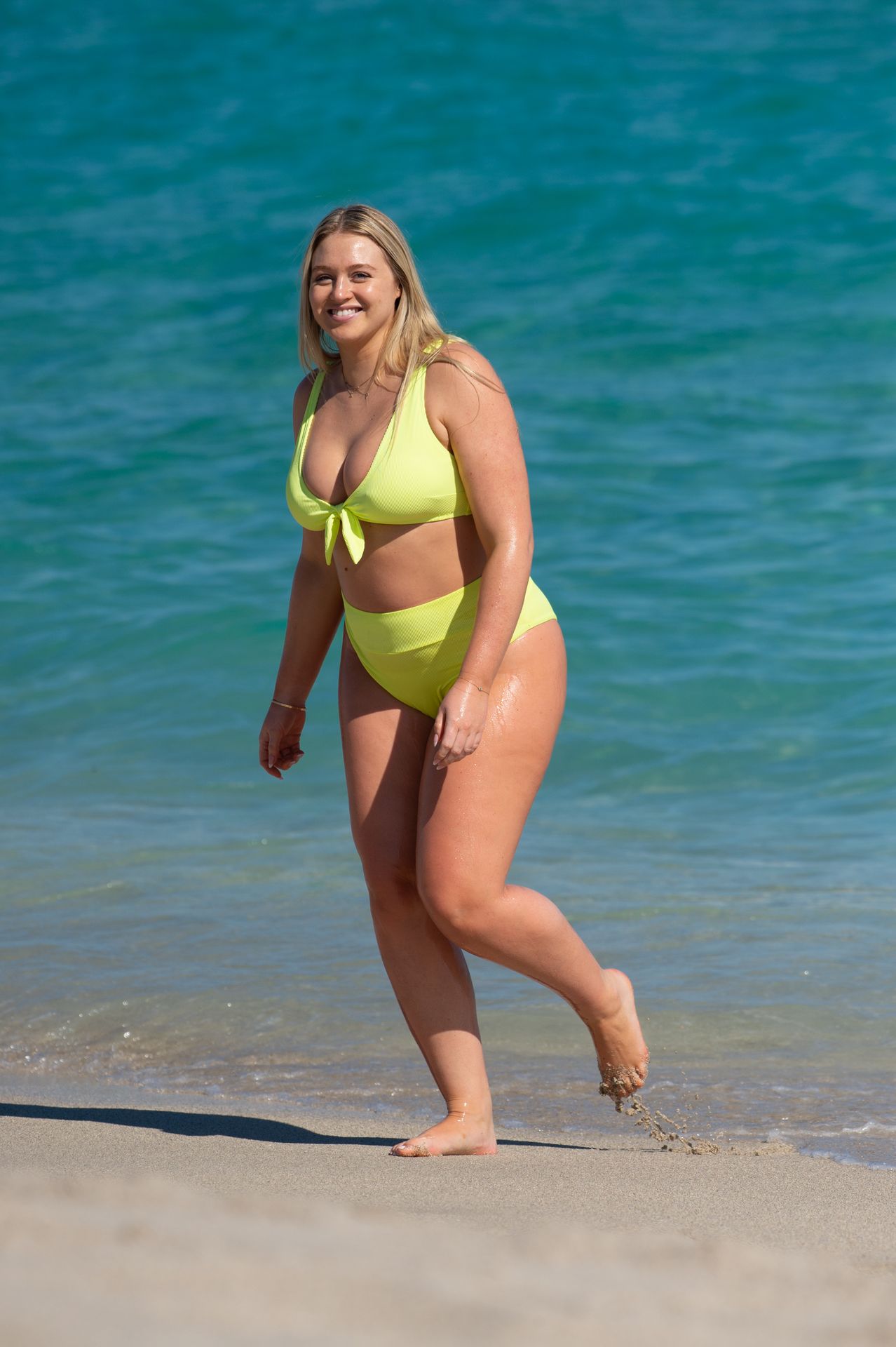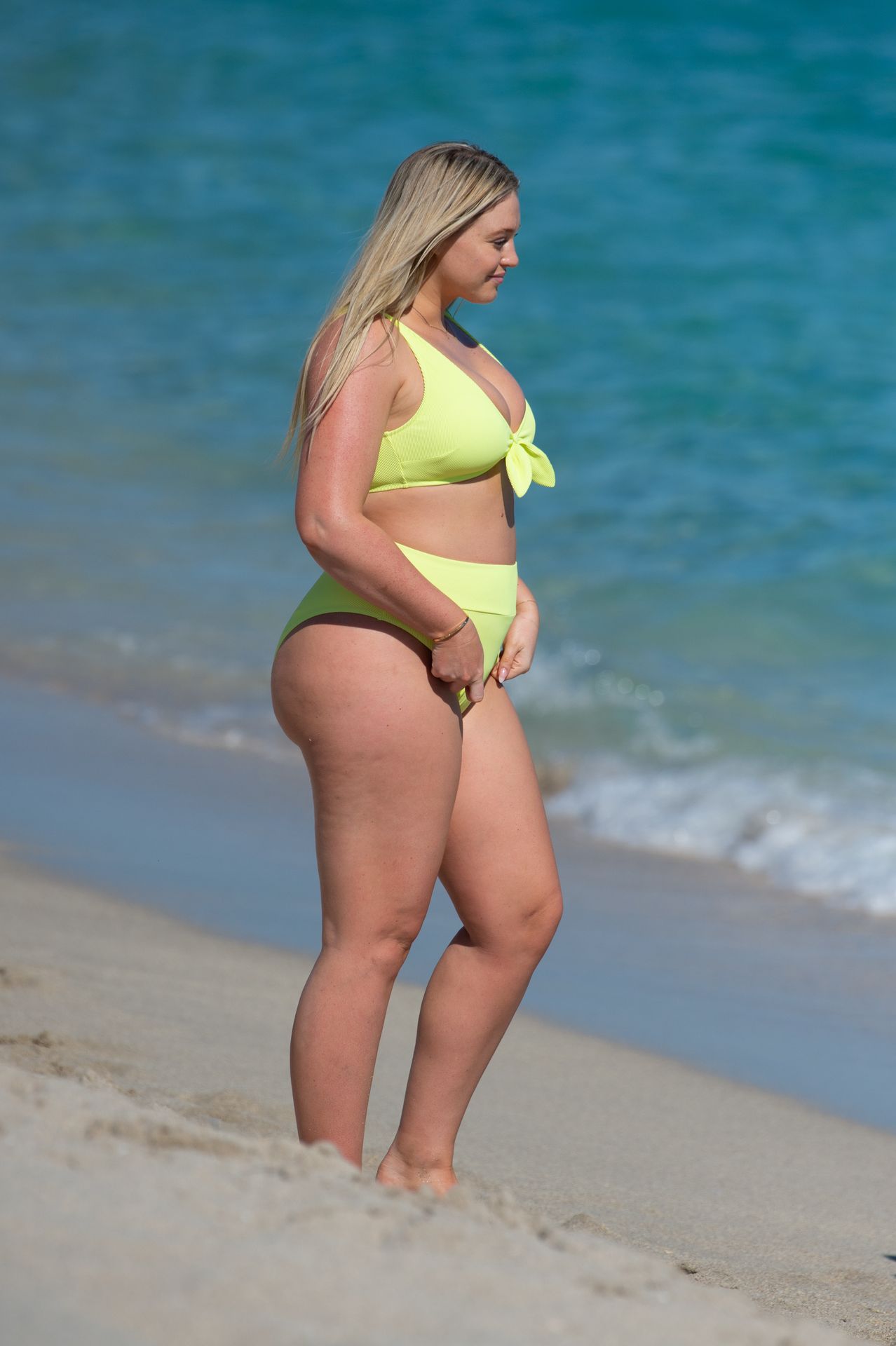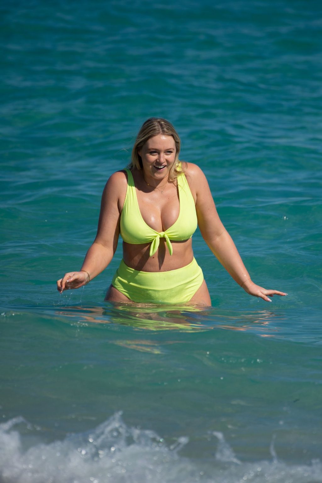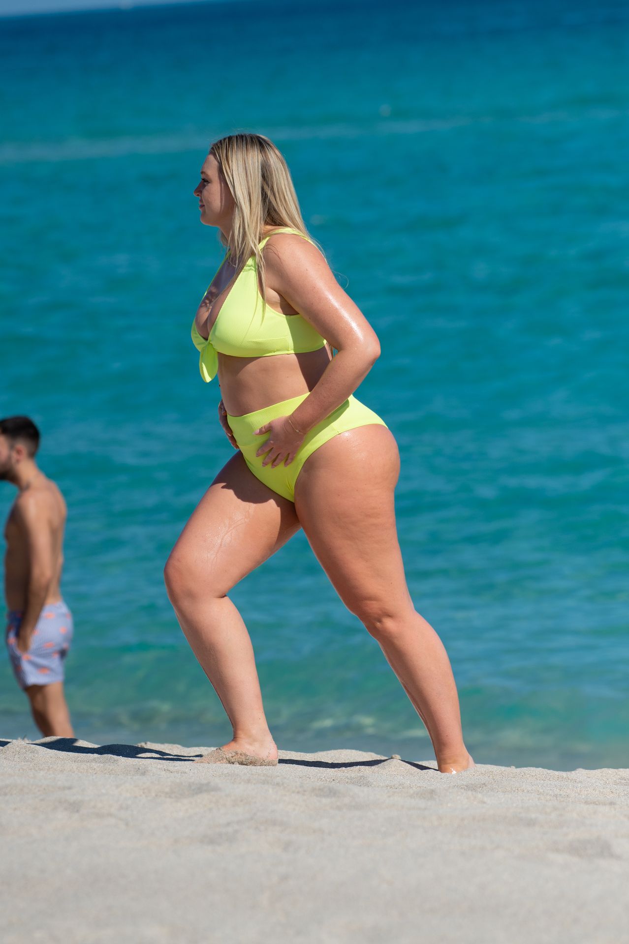Grávida, Iskra Lawrence exibe sua crescente barriga de bebê em Miami Beach. A modelo curvilínea foi vista usando um biquíni amarelo chamativo enquanto se refrescava com um mergulho no oceano na sexta-feira.