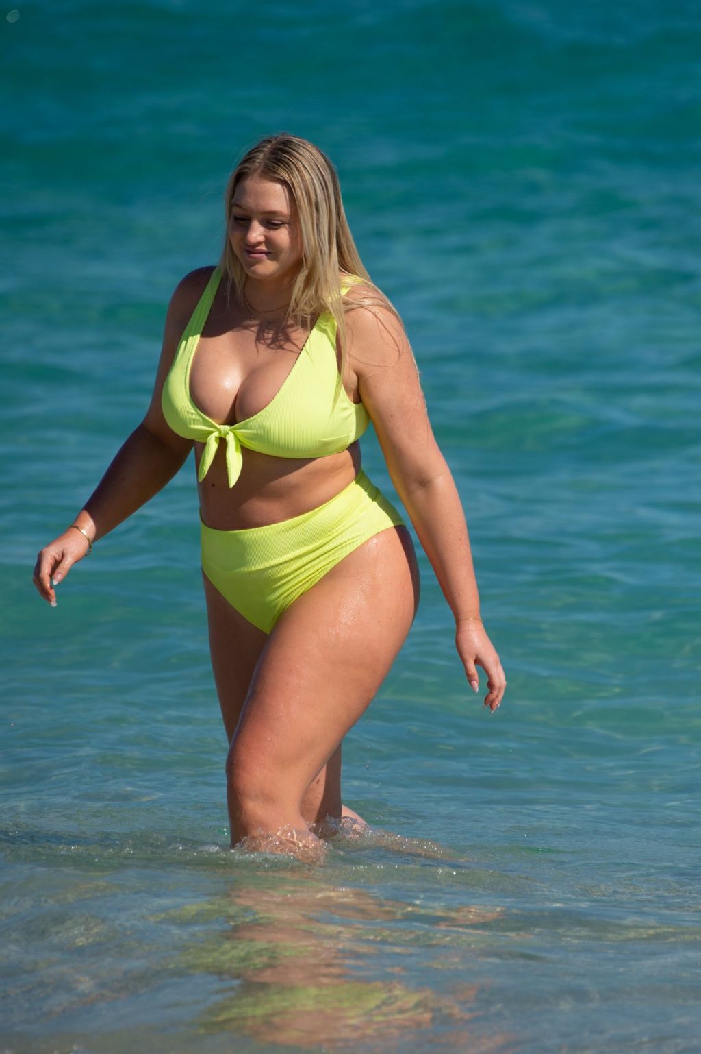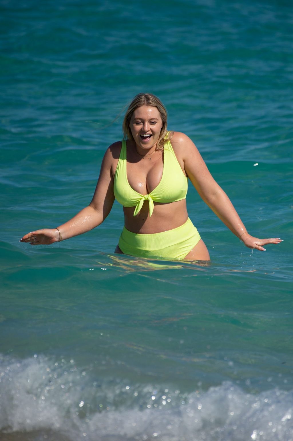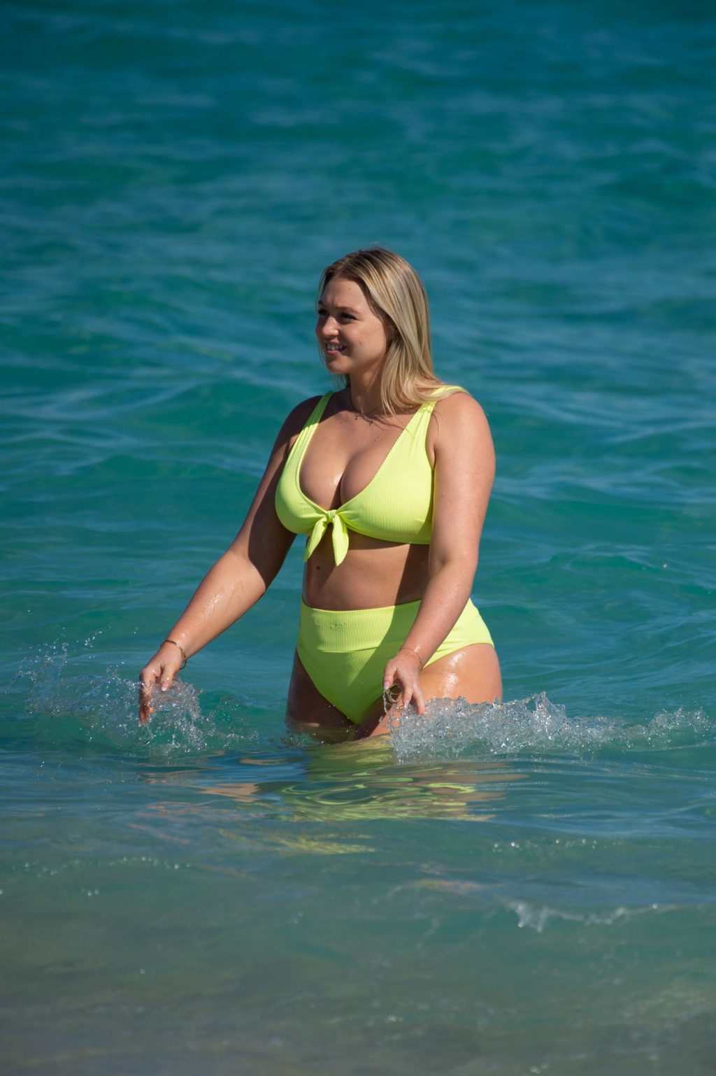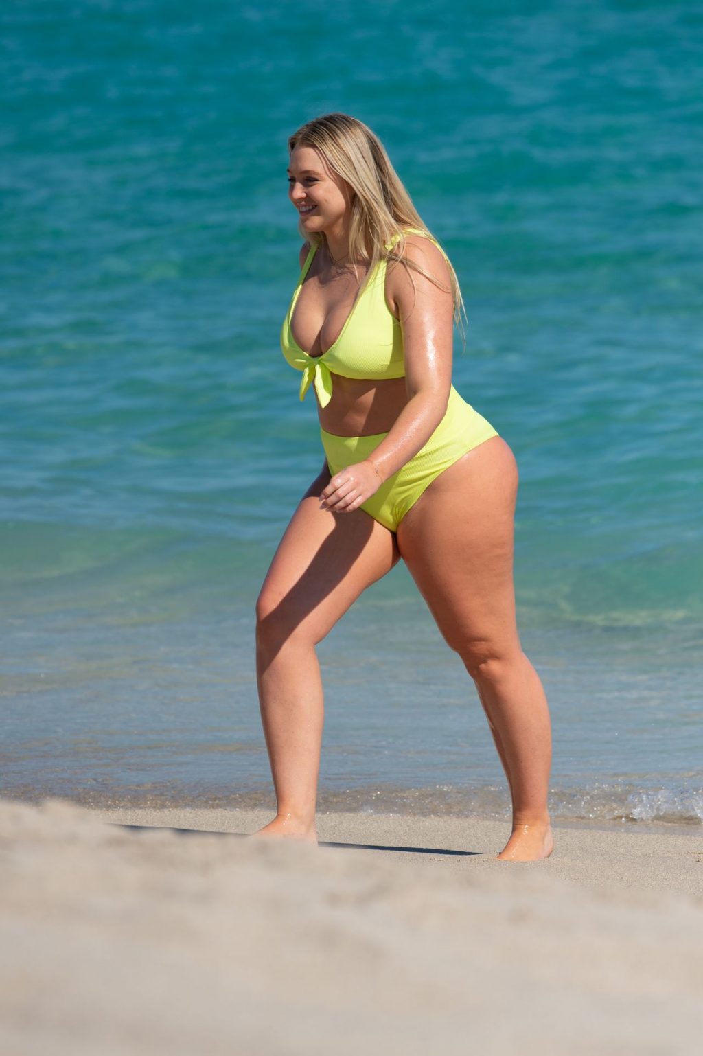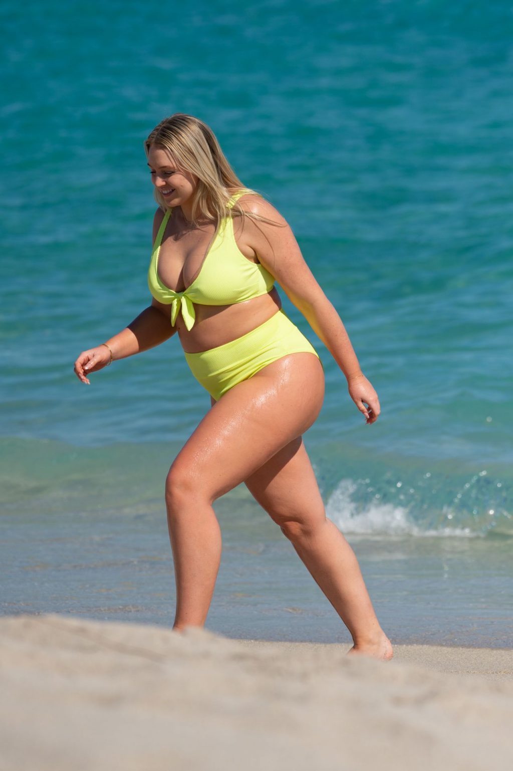 Grávida, Iskra Lawrence exibe sua crescente barriga de bebê em Miami Beach. A modelo curvilínea foi vista usando um biquíni amarelo chamativo enquanto se refrescava com um mergulho no oceano na sexta-feira.