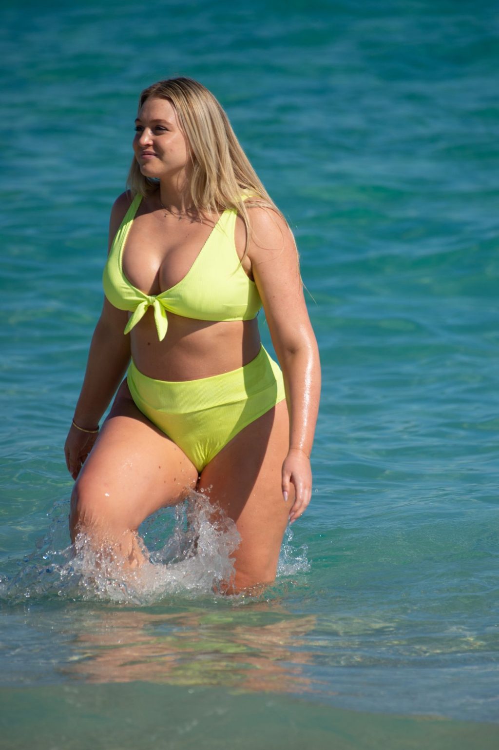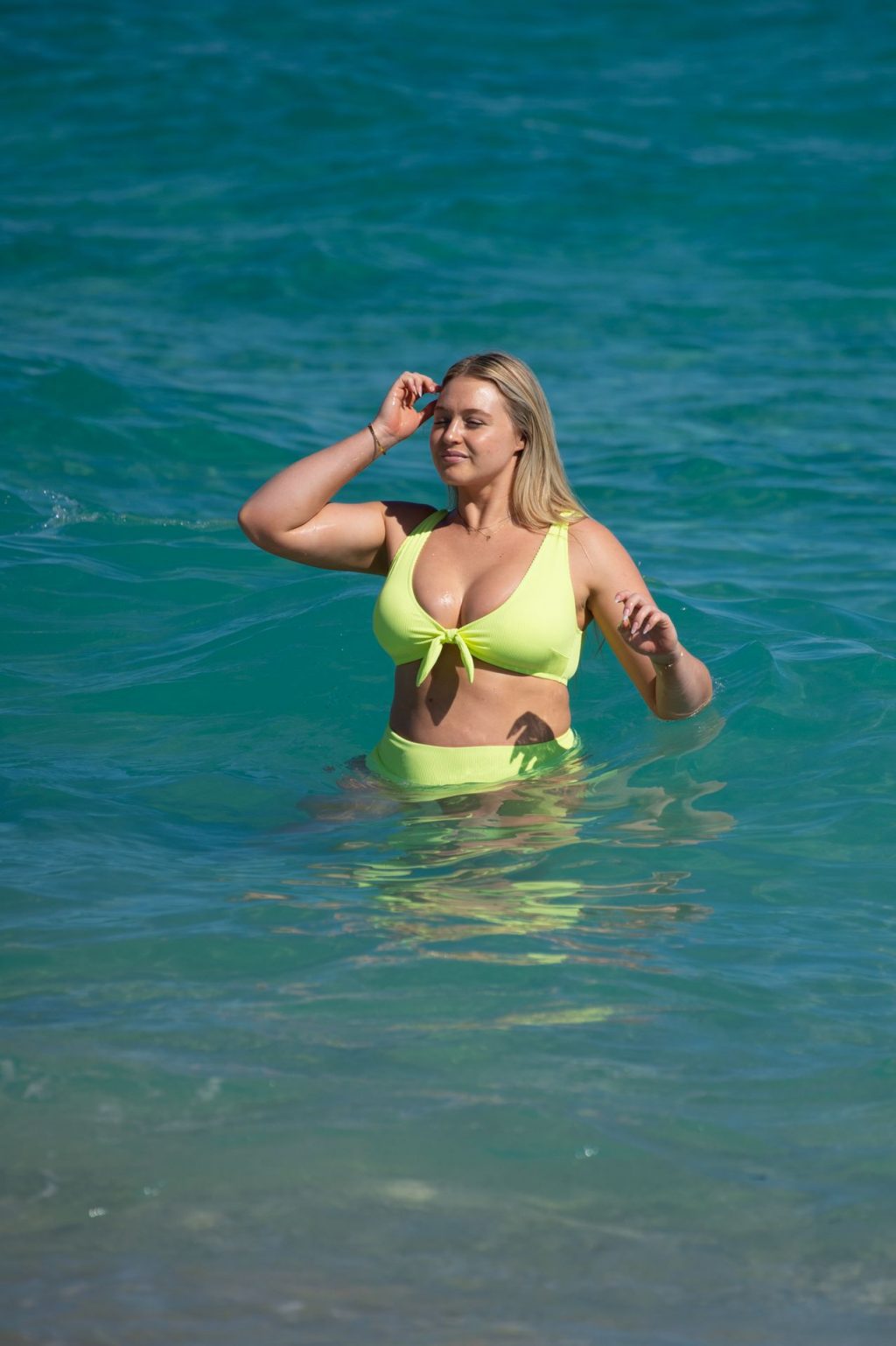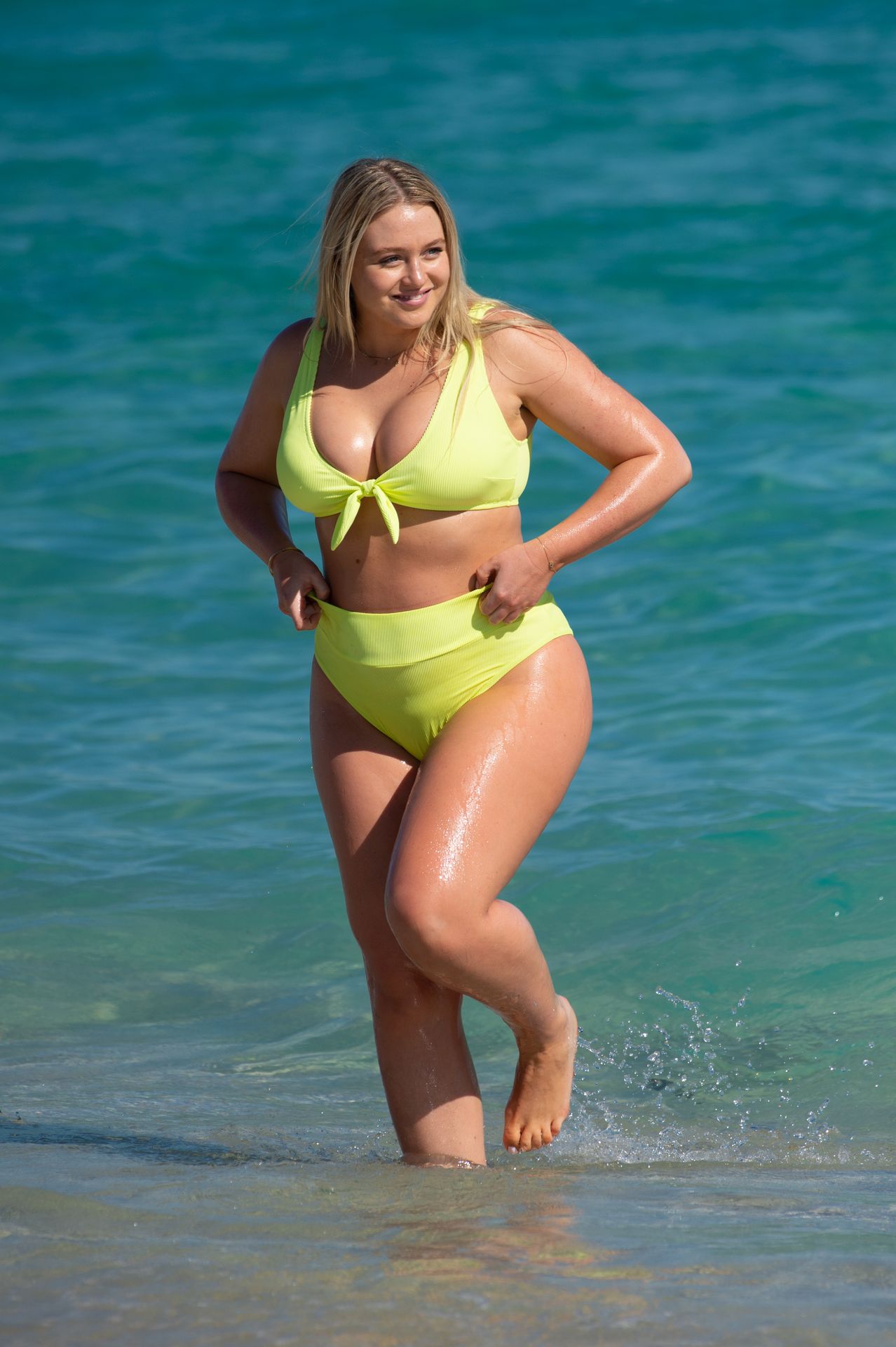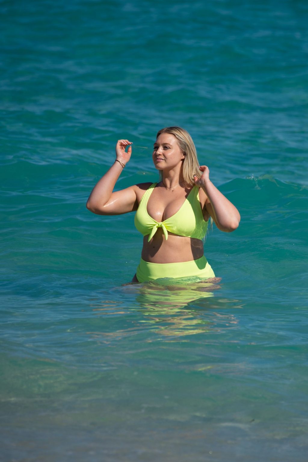 Grávida, Iskra Lawrence exibe sua crescente barriga de bebê em Miami Beach. A modelo curvilínea foi vista usando um biquíni amarelo chamativo enquanto se refrescava com um mergulho no oceano na sexta-feira.