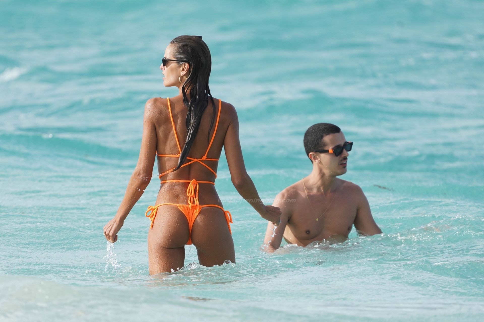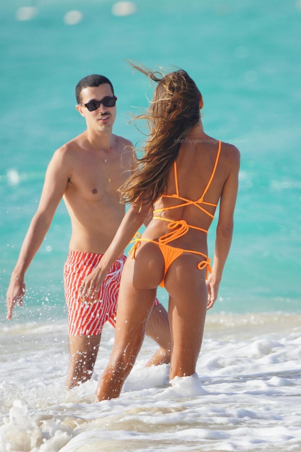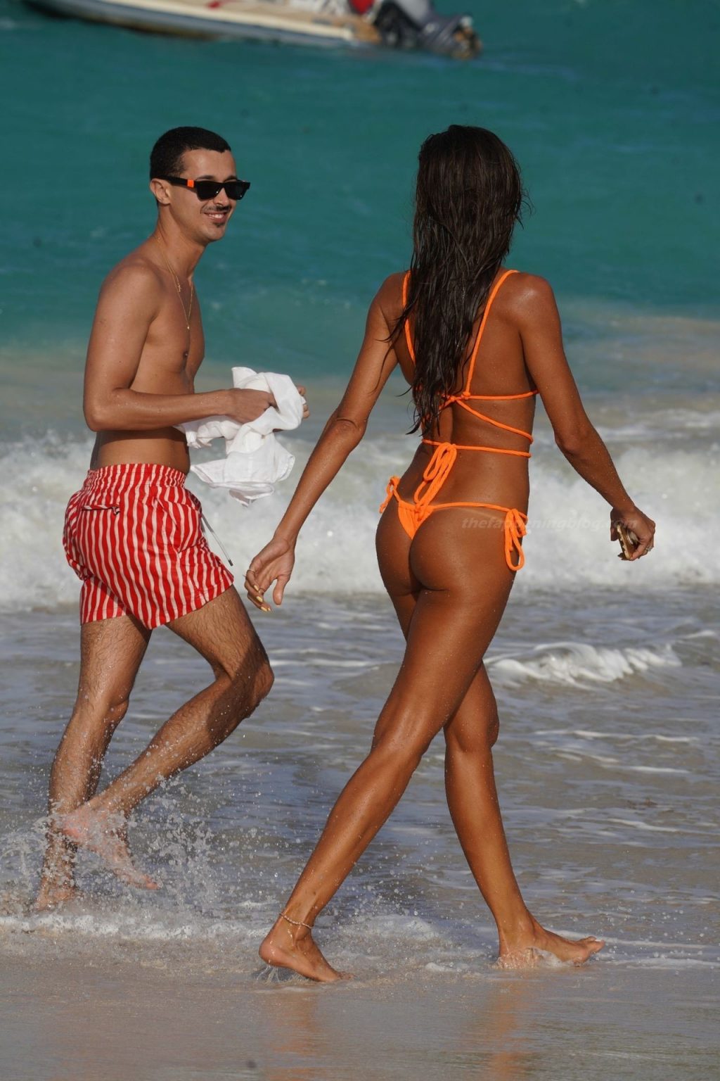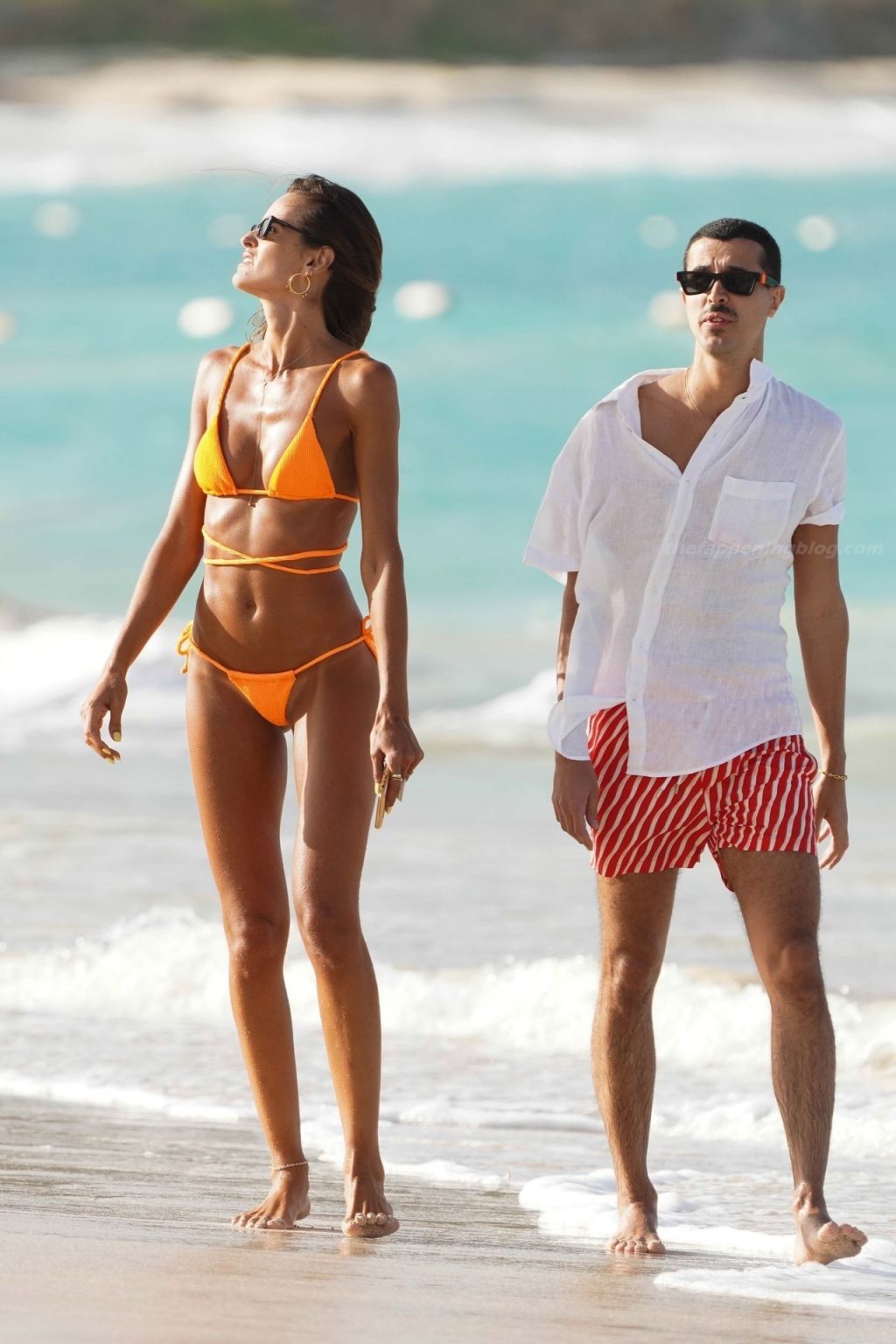 Supermodelo Izabel Goulart exibe sua figura impressionantemente tonificada, pernas longas e pubis depilado em um biquíni laranja minúsculo enquanto aproveita um tempo na praia em St Barts, 31/12/2020.