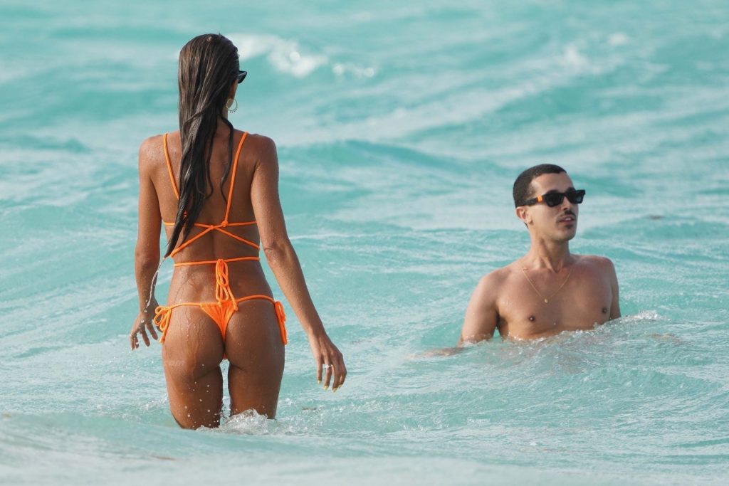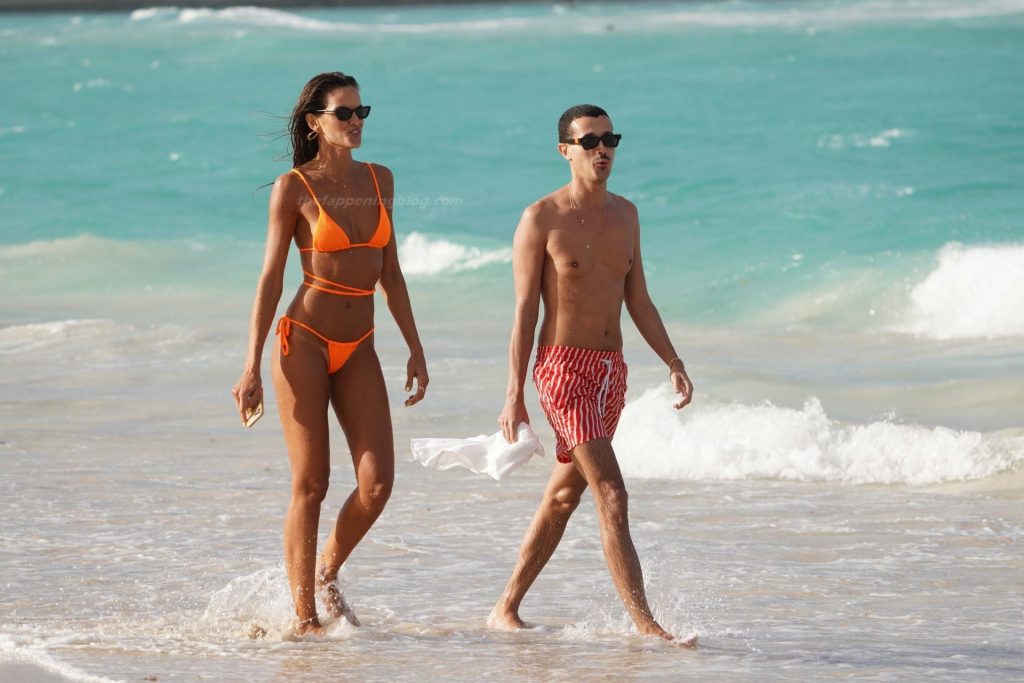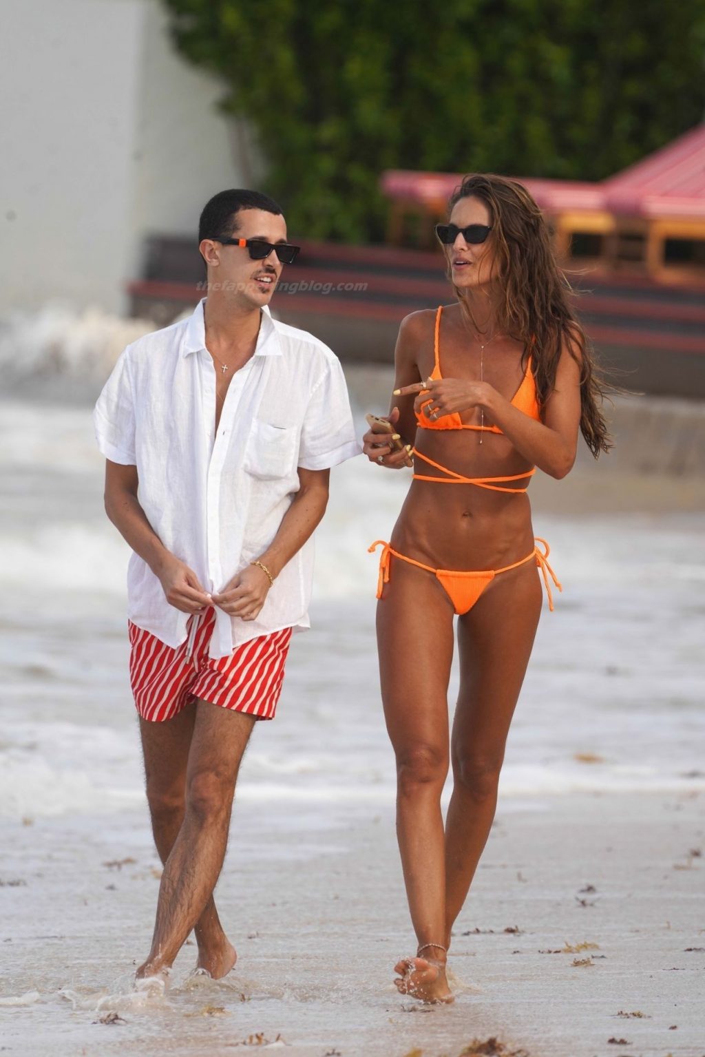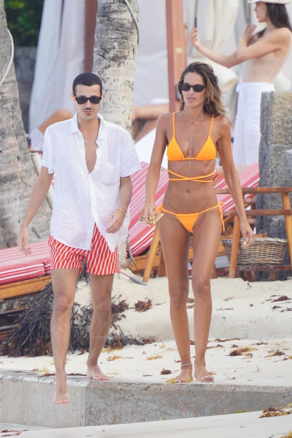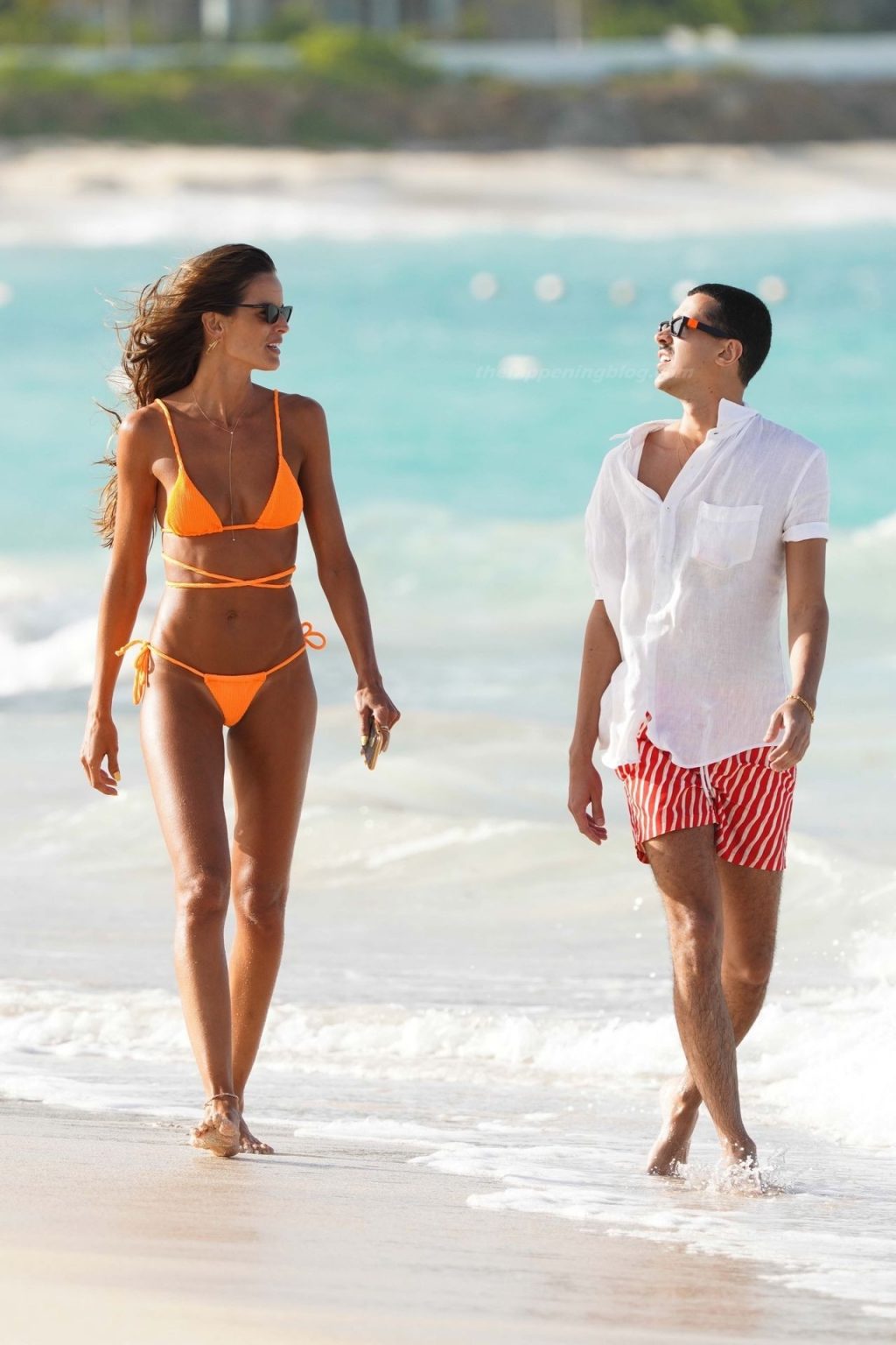 Supermodelo Izabel Goulart exibe sua figura impressionantemente tonificada, pernas longas e pubis depilado em um biquíni laranja minúsculo enquanto aproveita um tempo na praia em St Barts, 31/12/2020.