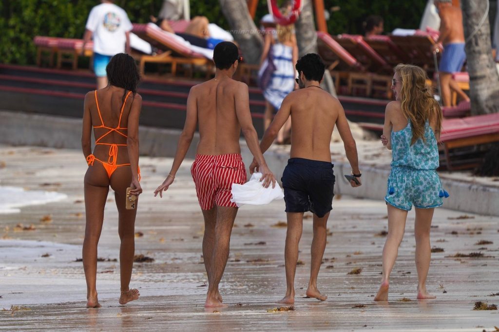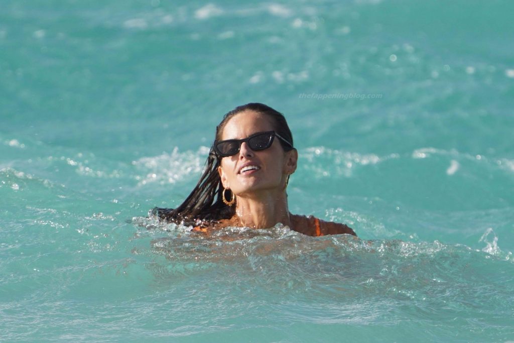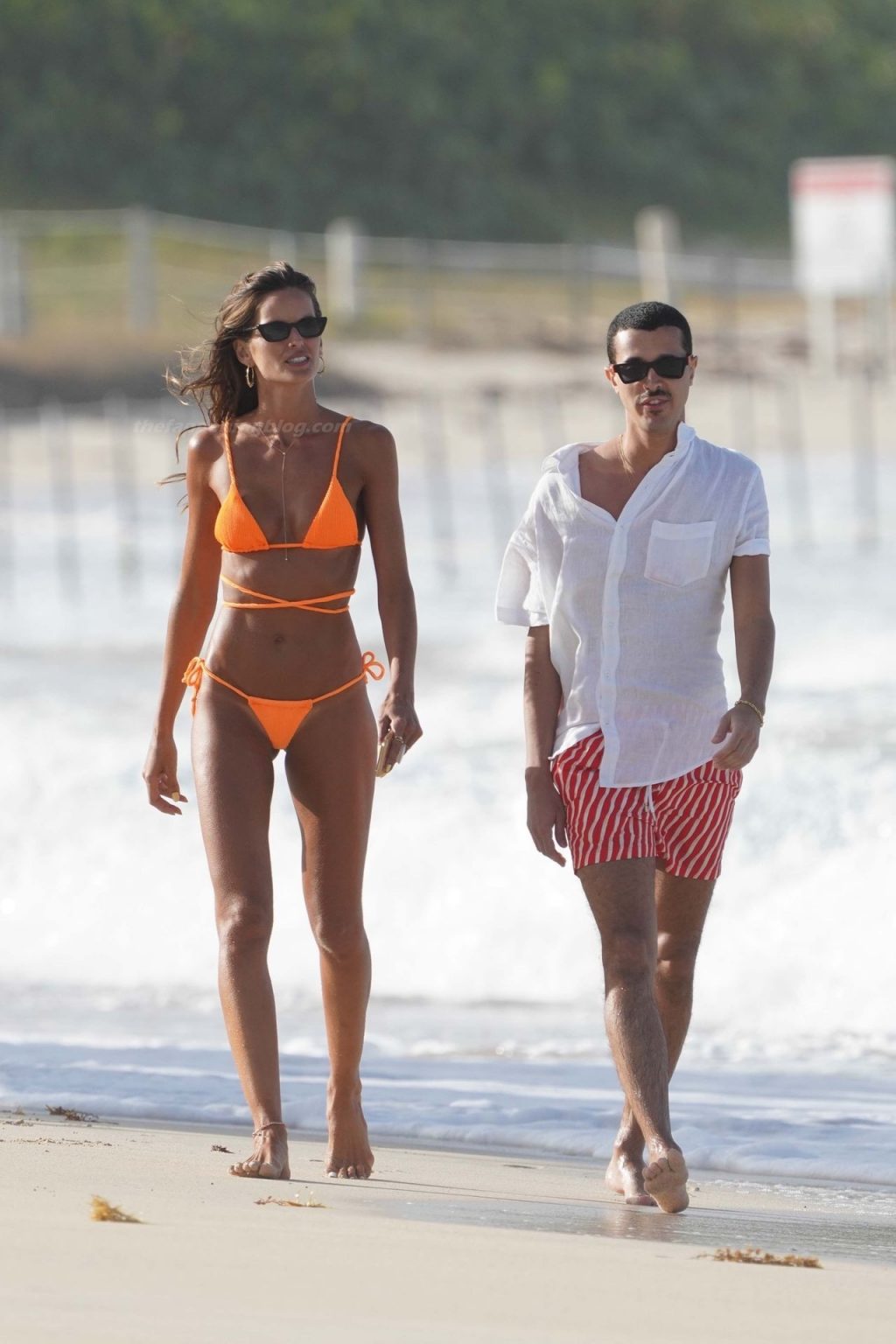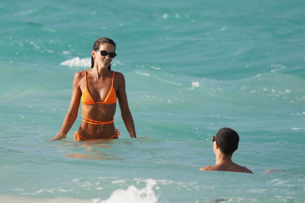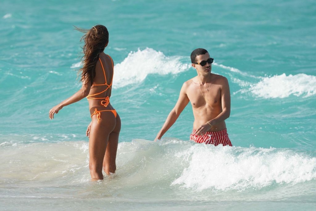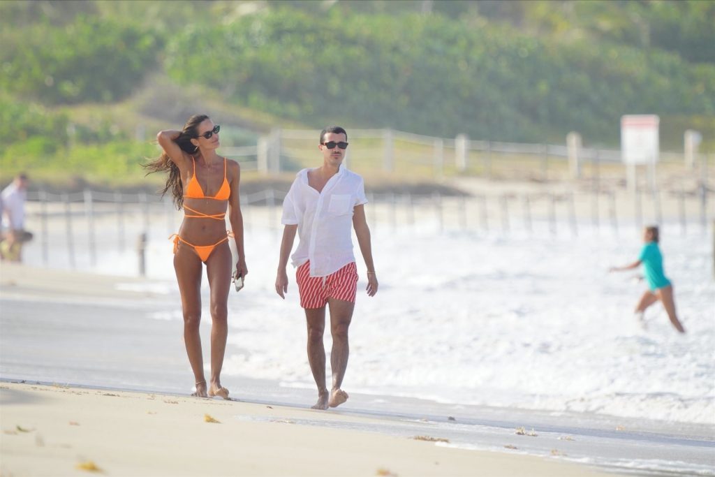Supermodelo Izabel Goulart exibe sua figura impressionantemente tonificada, pernas longas e pubis depilado em um biquíni laranja minúsculo enquanto aproveita um tempo na praia em St Barts, 31/12/2020.