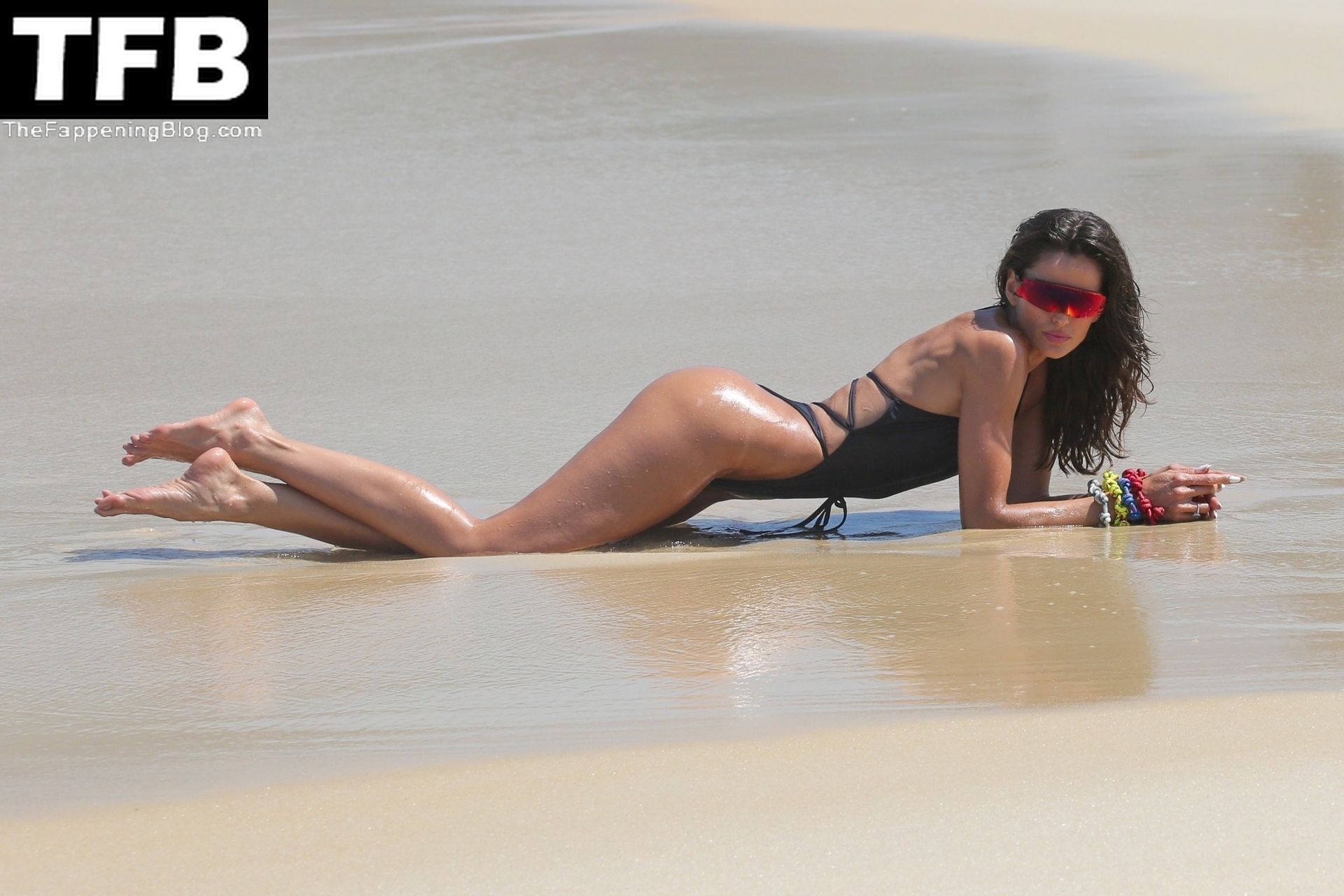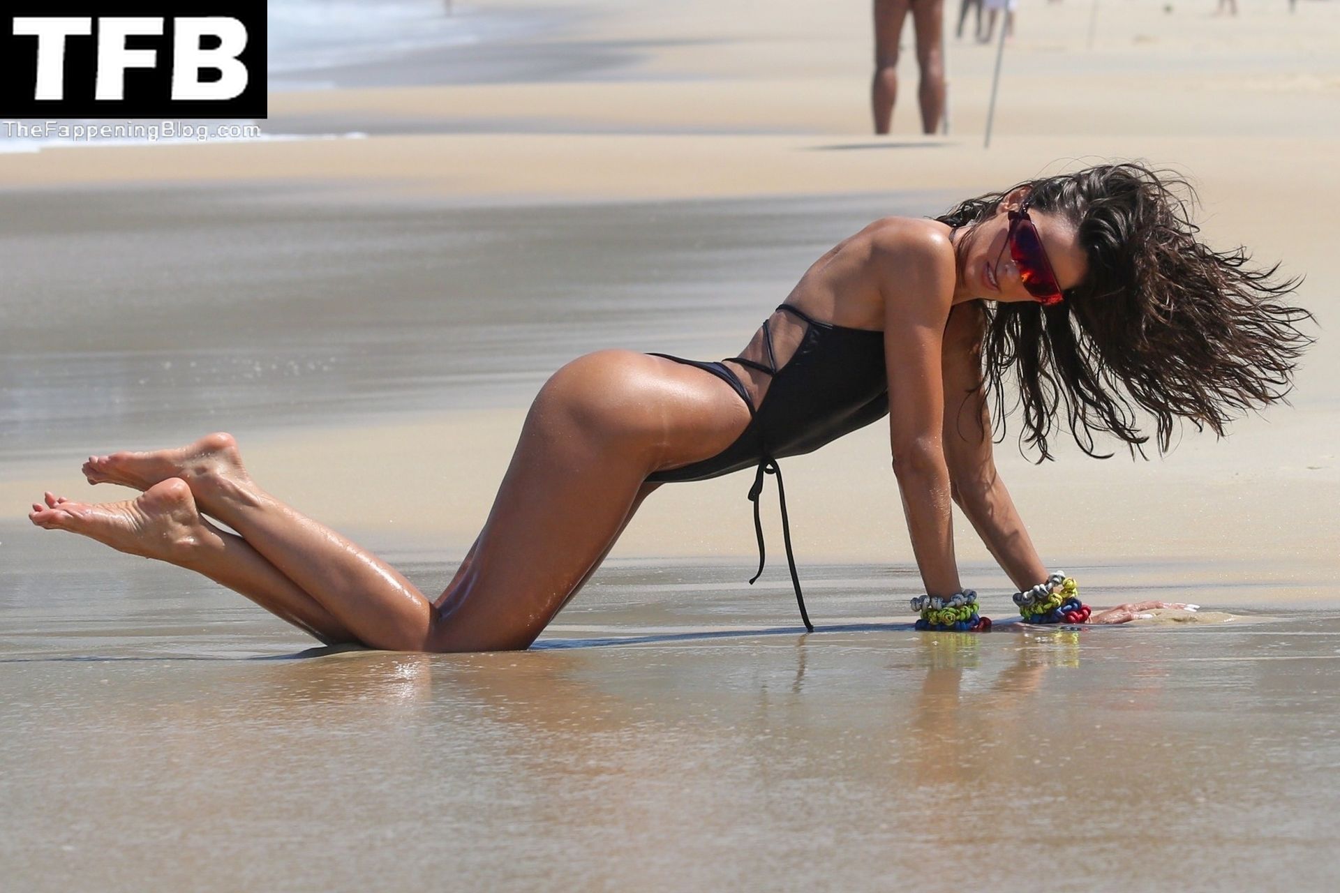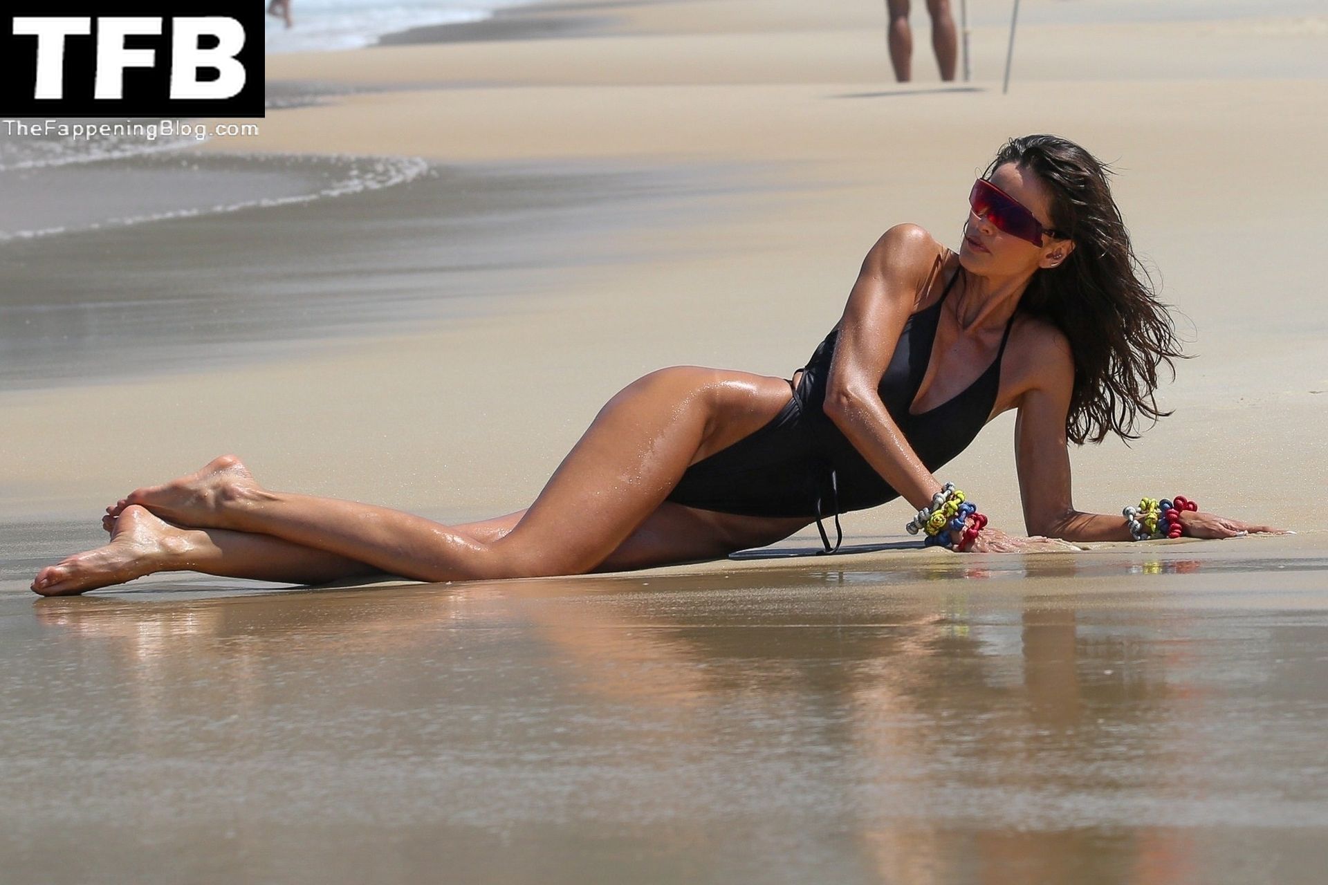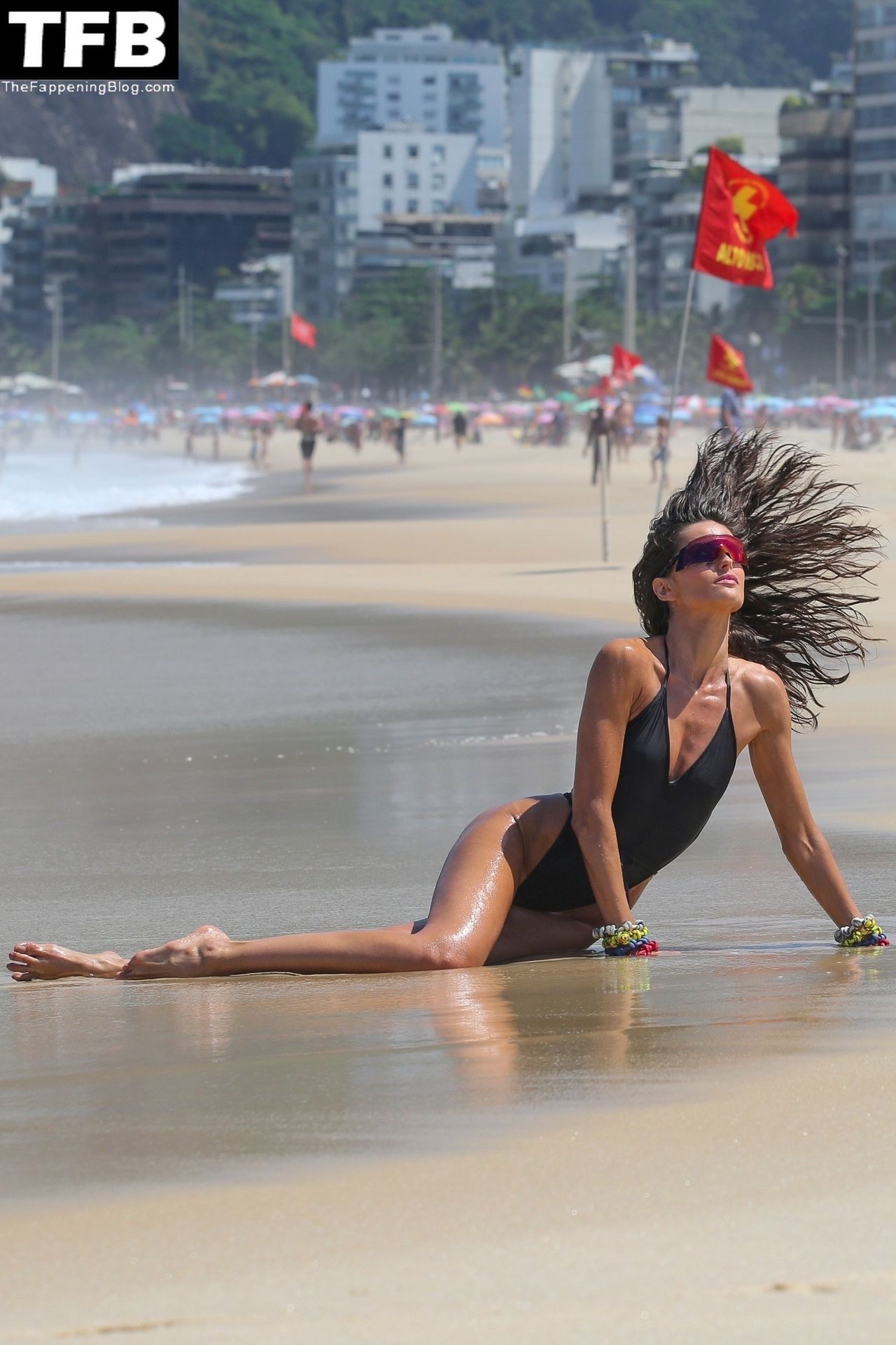 Izabel Goulart, 37, exibe suas marcas de bronzeado com um maiô preto enquanto posa durante um ensaio fotográfico no Rio esta tarde.