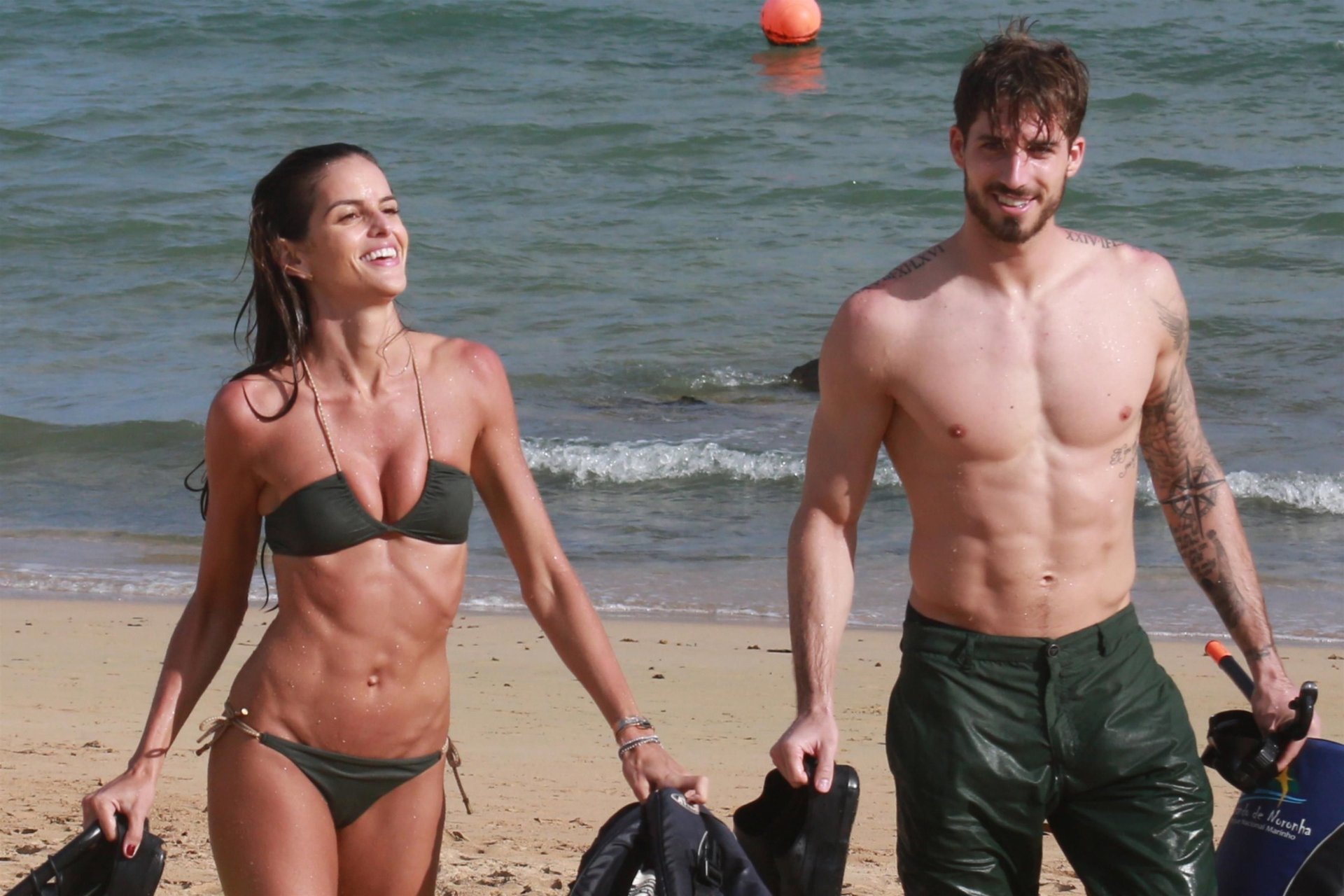 Izabel Goulart e seu namorado Kevin Trapp aproveitam um dia na praia no Brasil, 26/12/2017. A modelo brasileira de 33 anos exibiu sua barriga e bumbum tonificados enquanto o casal colocava seus coletes salva-vidas para mergulhar.