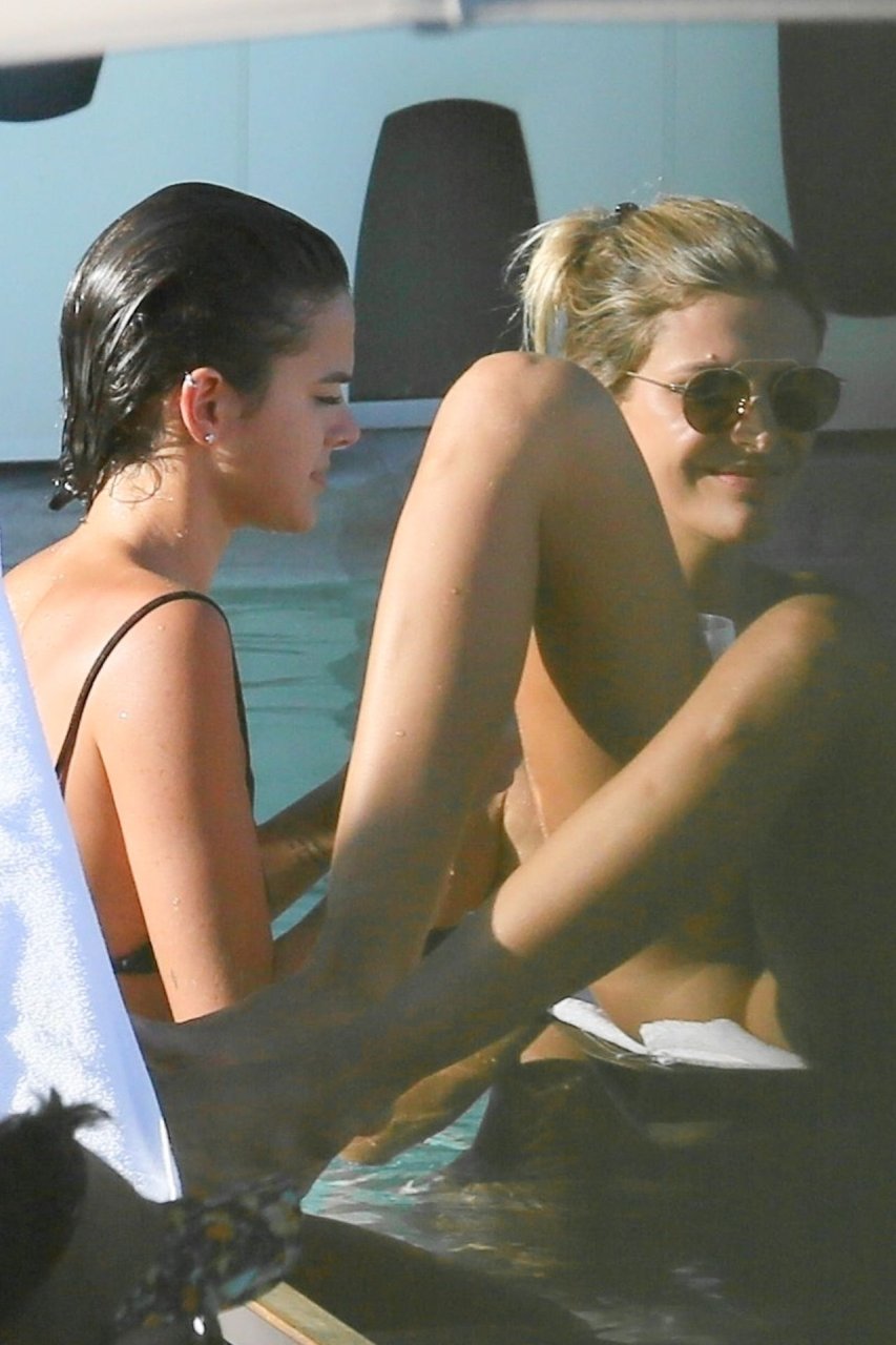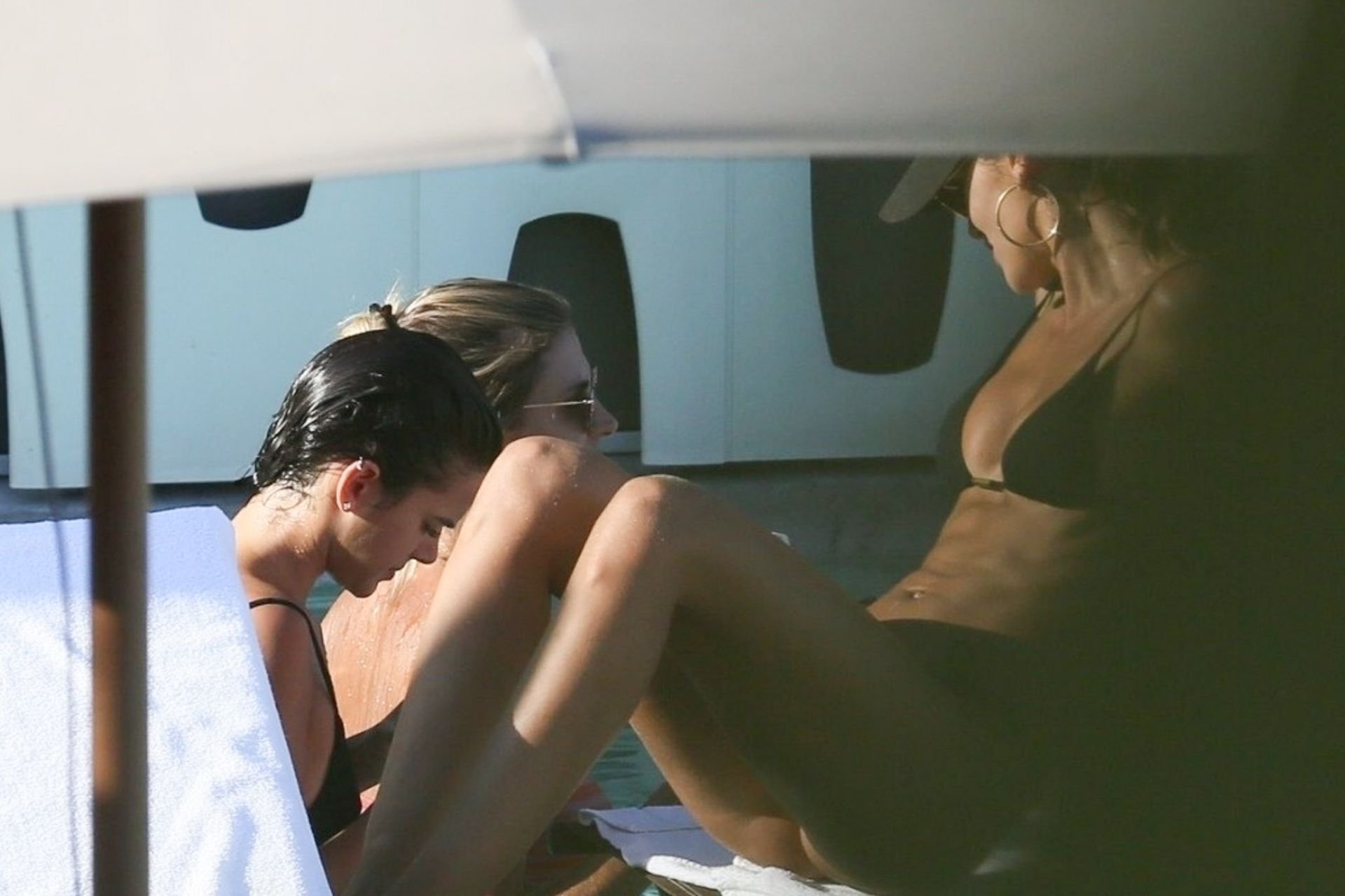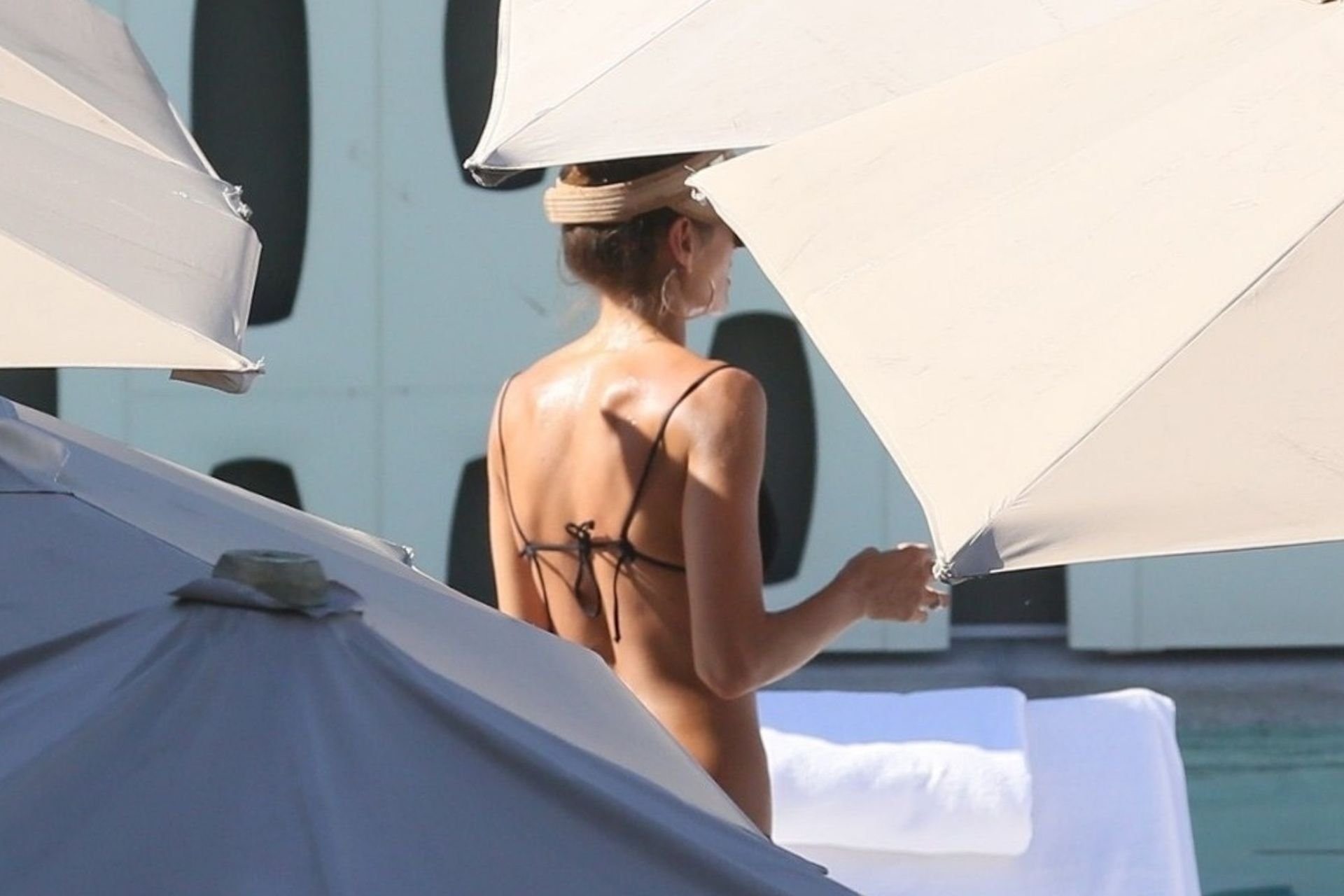 Model Izabel Goulart aproveita um tempo de descanso após festejar durante as festividades do Carnaval no Rio, 08/03/2019. A magra gata mostrou seu doce e pequeno bumbum na piscina com amigos.