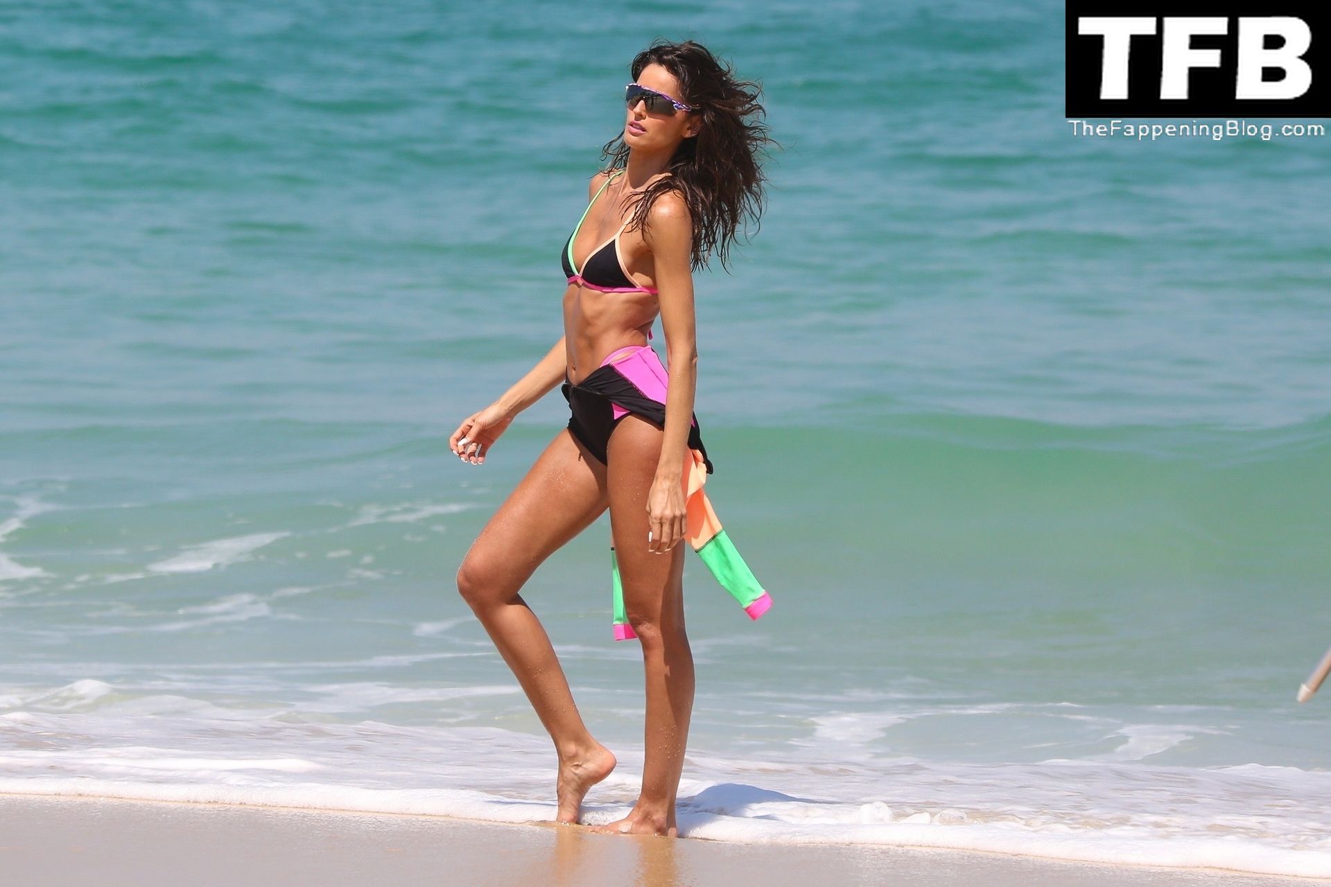 Izabel Goulart, 37, exibe suas marcas de bronzeado em um biquíni minúsculo enquanto posa durante um ensaio no Rio, 02/04/2022.