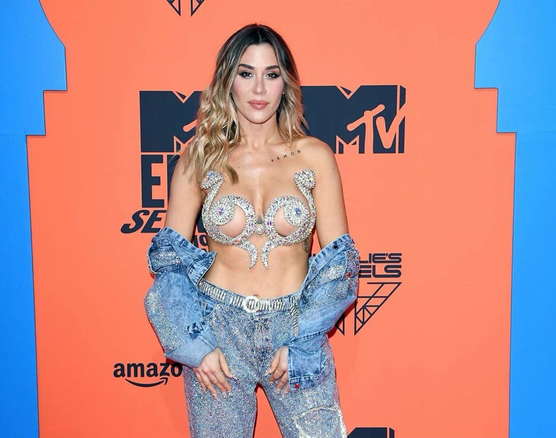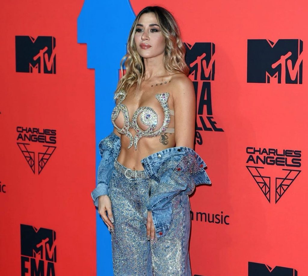 J Mena posa no tapete vermelho ao chegar no MTV Europe Music Awards 2019 no Centro de Conferências e Exposições FIBES em Sevilha, Espanha, 3 de novembro de 2019. Ela exibiu seus seios, usando um sutiã interessante. Jimena Barón (também conhecida como J Mena) é uma atriz e cantora argentina. Ela é irmã do ator Federico Barón.